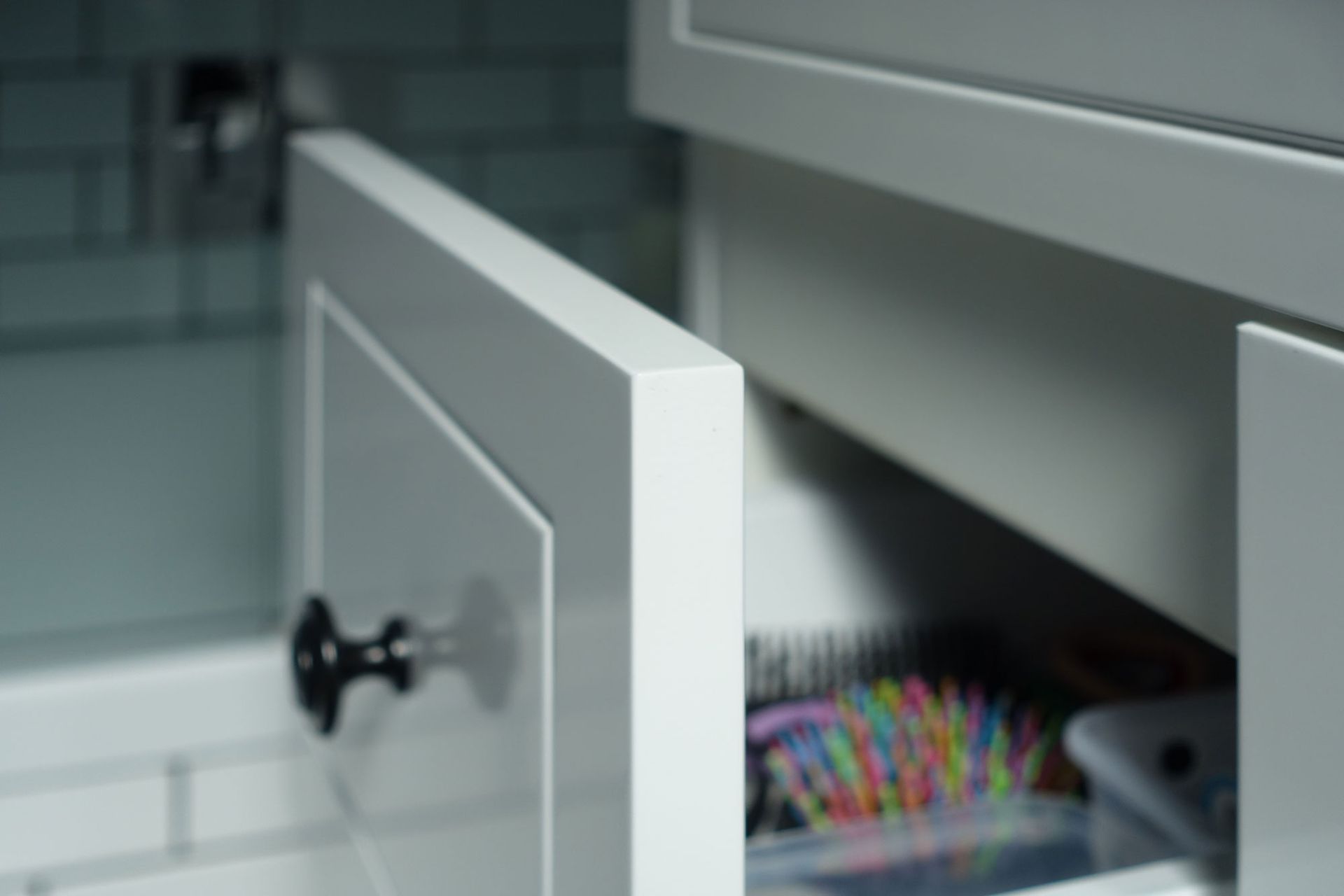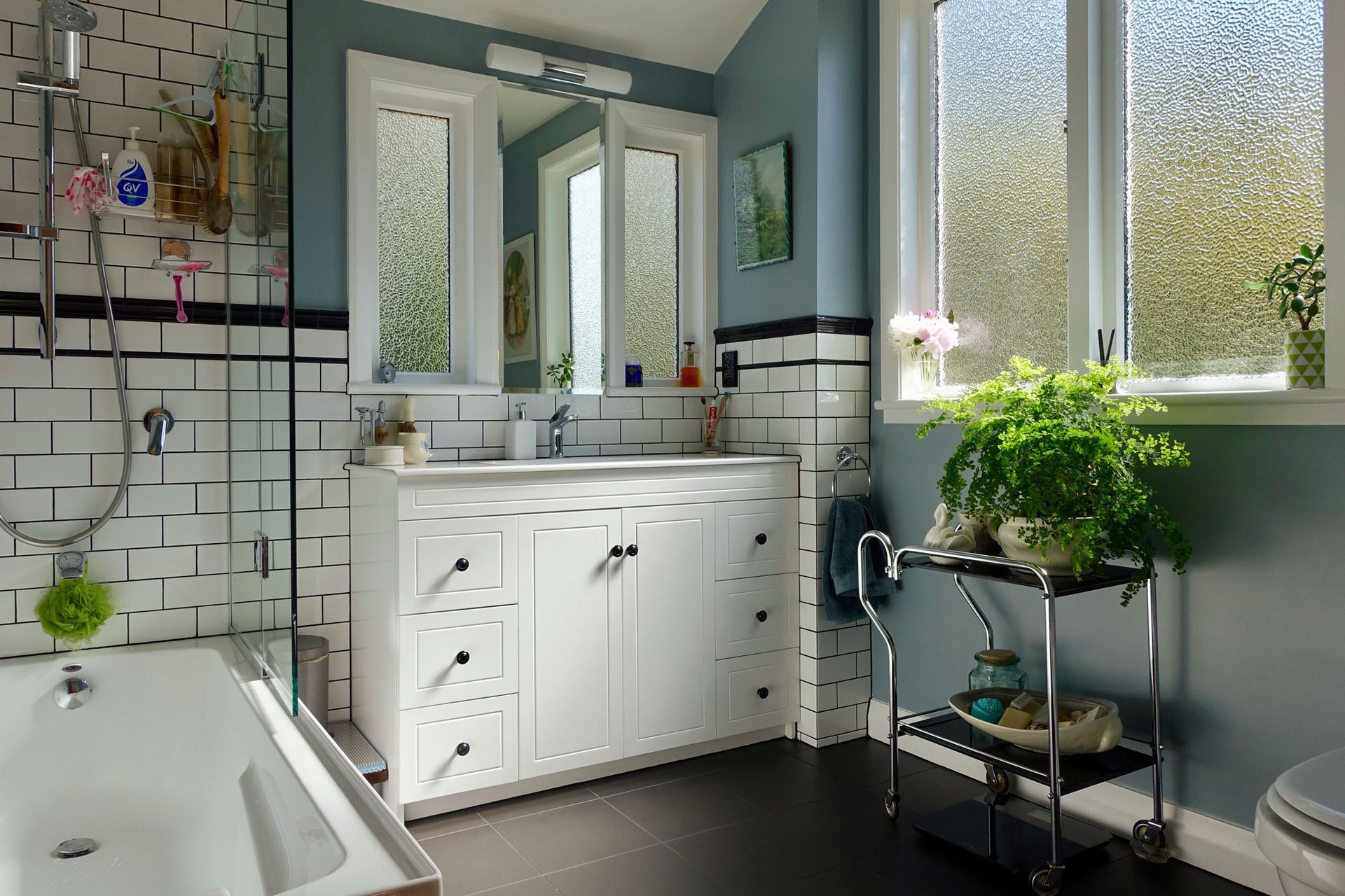 ArchiPro Project Summary - Contemporary bathroom design featuring a blend of black painted cabinetry and American white ash, complemented by a sleek handleless aesthetic, crafted by Alpine Joinery for a seamless and elegant finish.