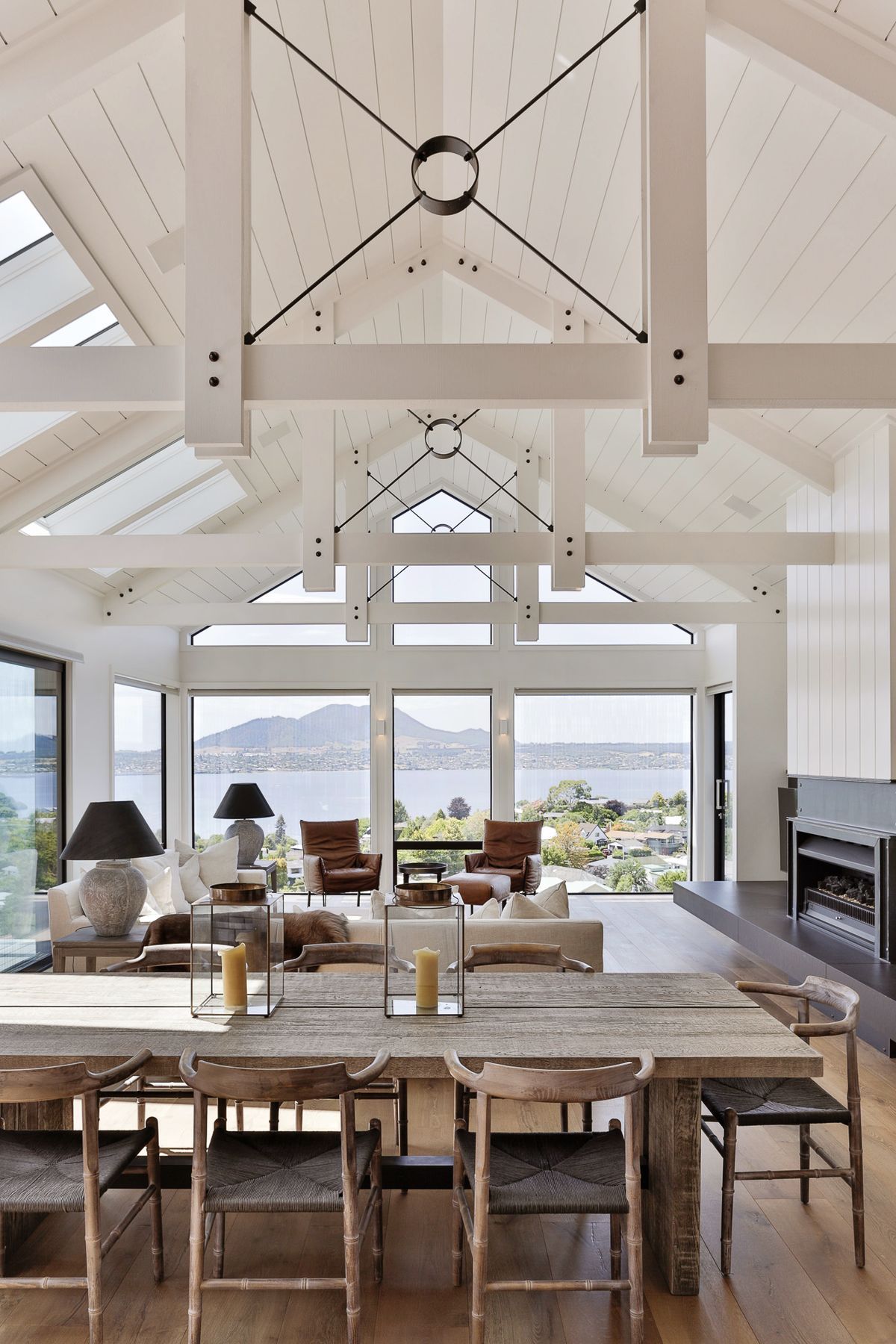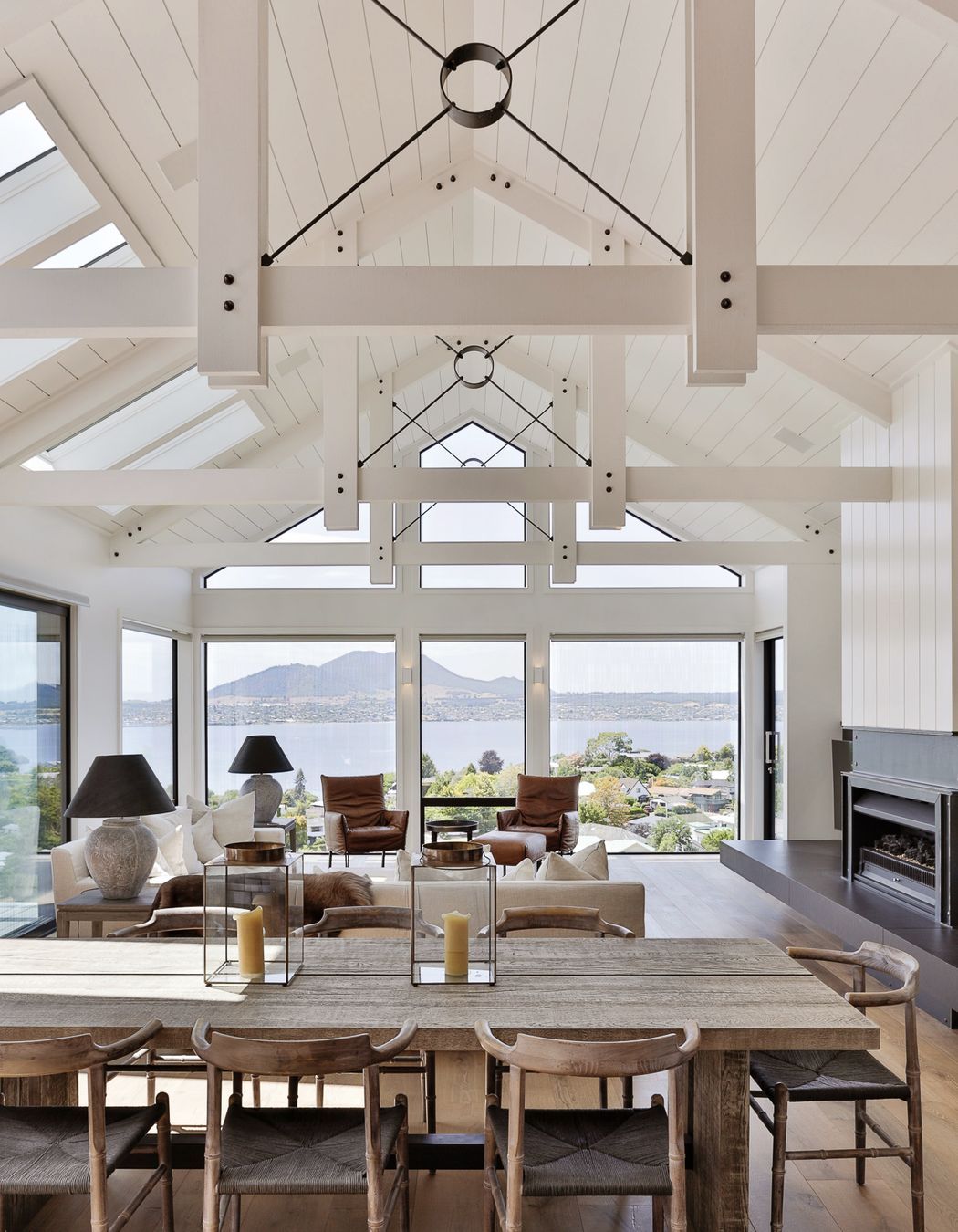 ArchiPro Project Summary - Contemporary farmhouse design by Fraser Cameron Architects, featuring exposed trusses and a rural aesthetic, located above Acacia Bay, Taupō, built by The Craftsmen.