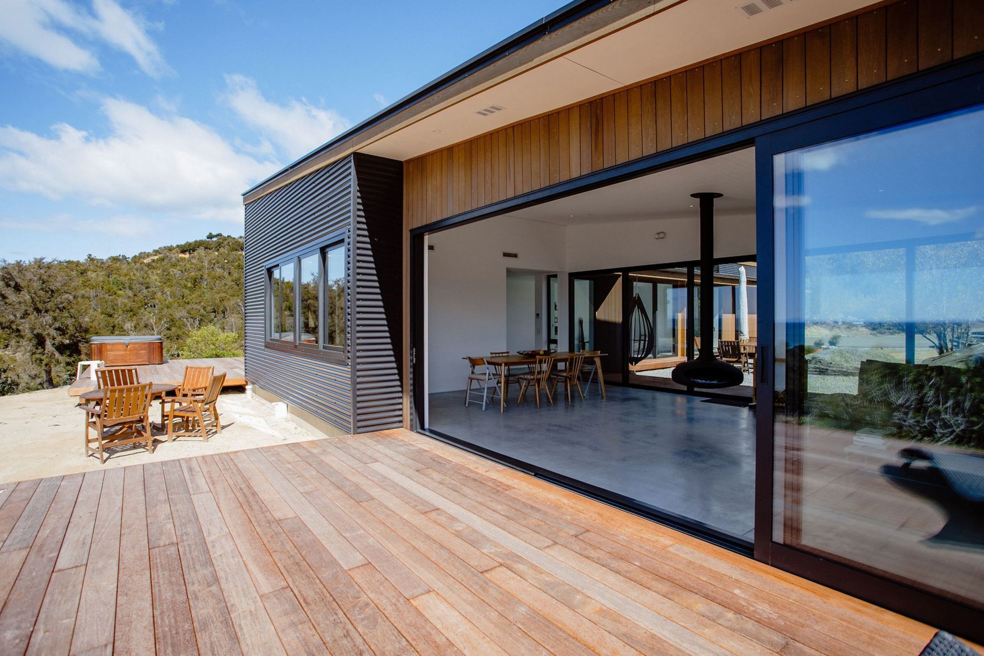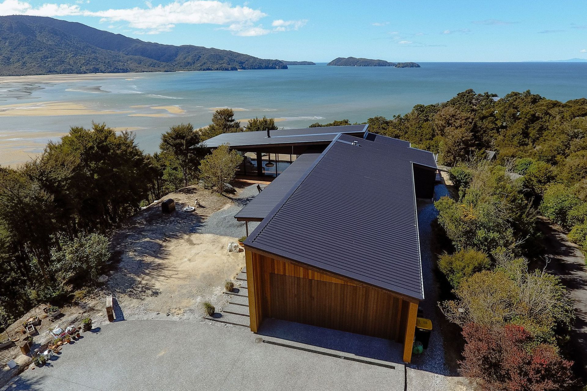 ArchiPro Project Summary - Innovative hillside home in Marahau designed by Chris Nott, featuring buffed concrete floors, unique plastering, cedar exterior, striking Colorsteel cladding, and exceptional indoor/outdoor flow with stunning views of Abel Tasman.