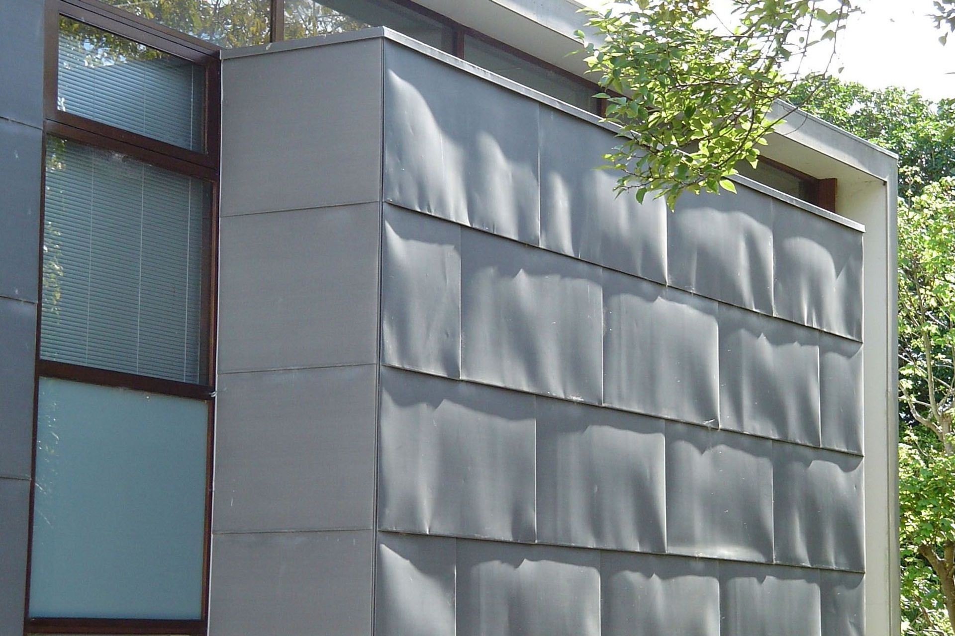 ArchiPro Project Summary - A striking architectural design featuring three interlocking forms, supported by 16 concrete piles, circular steel posts, and suspended concrete floors, complemented by a mix of pre-weathered zinc and plywood cladding, and a fully glazed north wall with timber joinery.