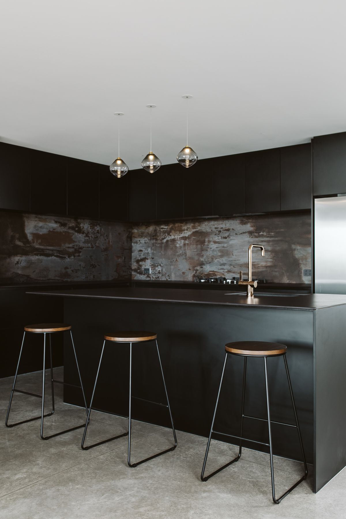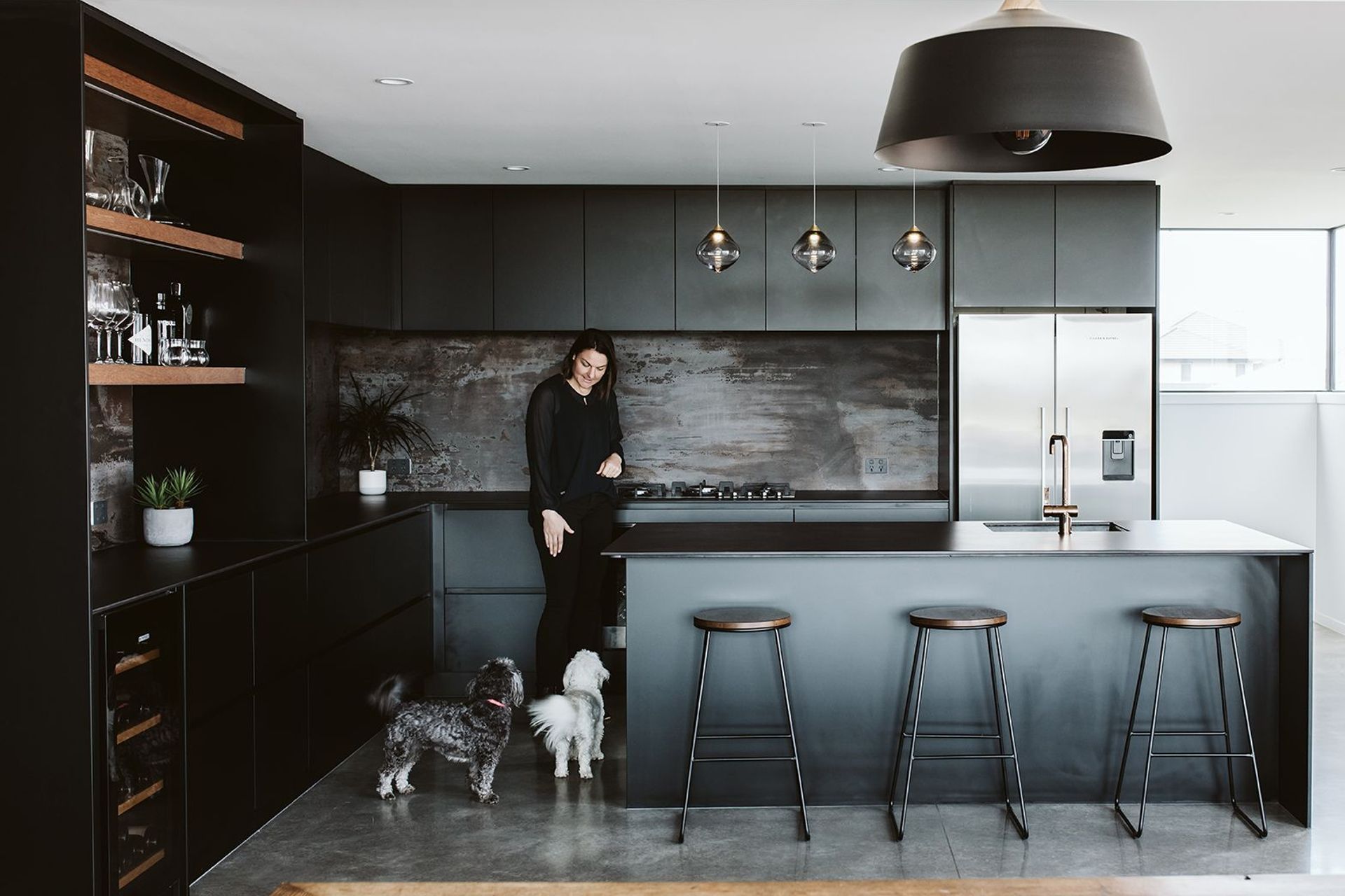 ArchiPro Project Summary - A striking kitchen design featuring a bold palette of matte black, concrete, and Dekton, complemented by warm timber accents and Ollo pendant lighting, creating a harmonious balance in a masculine space. Highly Commended at the 2019 TIDA New Zealand Designer Kitchen.