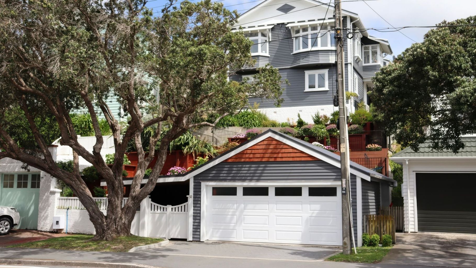 ArchiPro Project Summary - A transformative project on a steep hillside in Wellington, featuring a new double garage, expanded living spaces, and beautifully designed outdoor areas, all harmoniously integrated with the natural landscape.