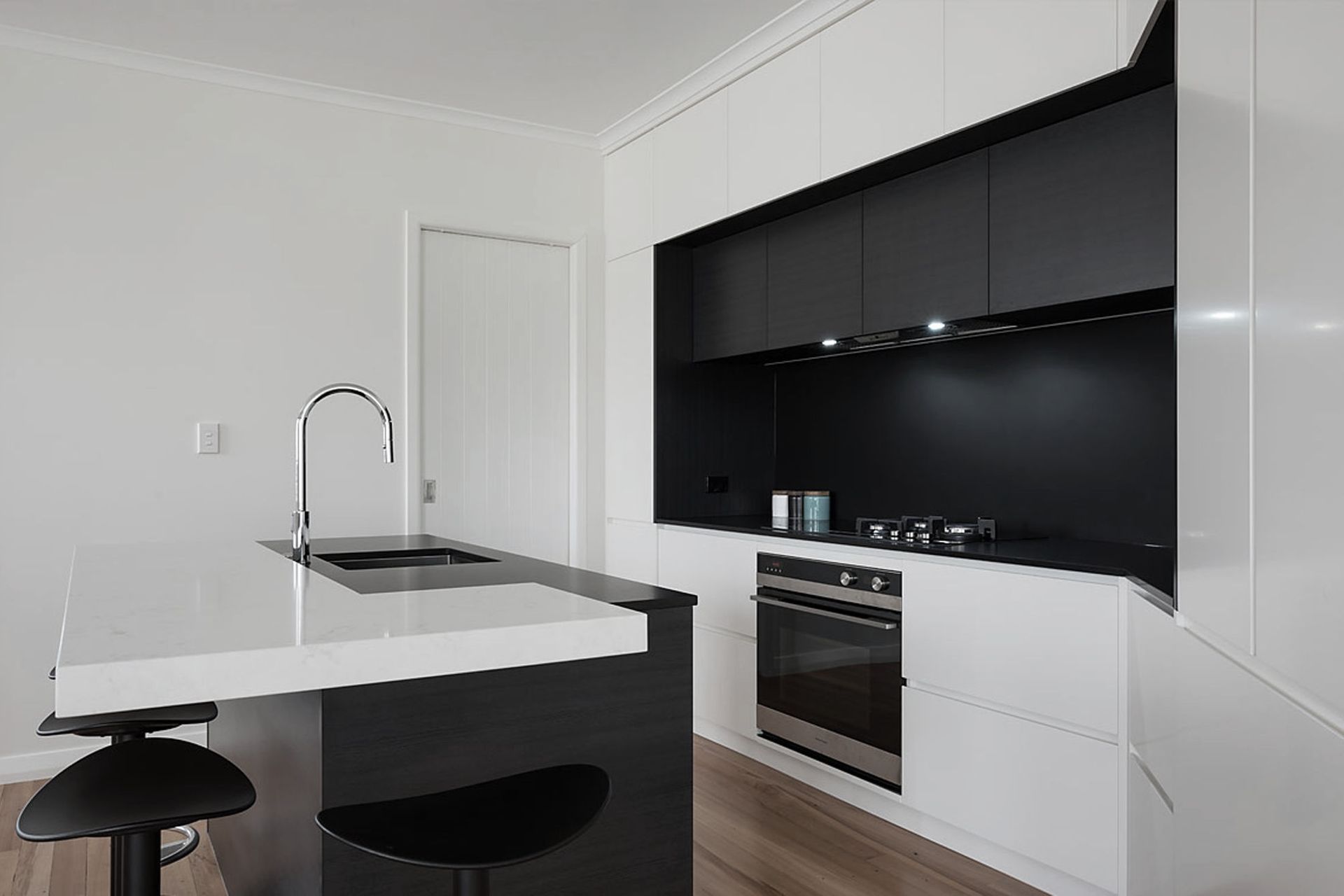 ArchiPro Project Summary - A sophisticated kitchen transformation by Neo Design, showcasing elegance and minimalism through a refined black and white palette, highlighted by the smooth finish of matt black glass for the splash back.