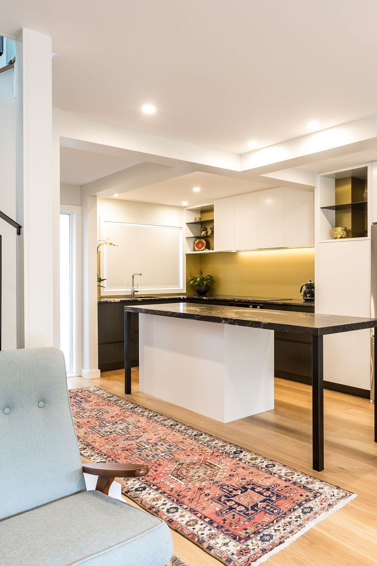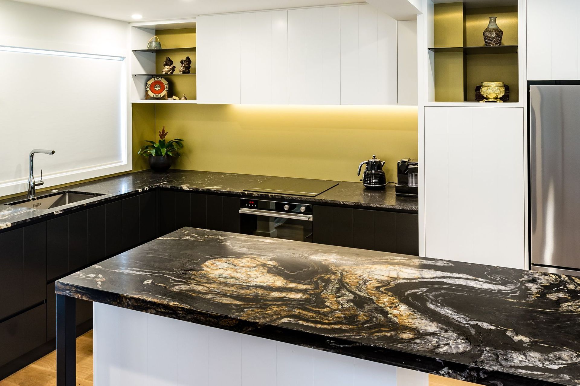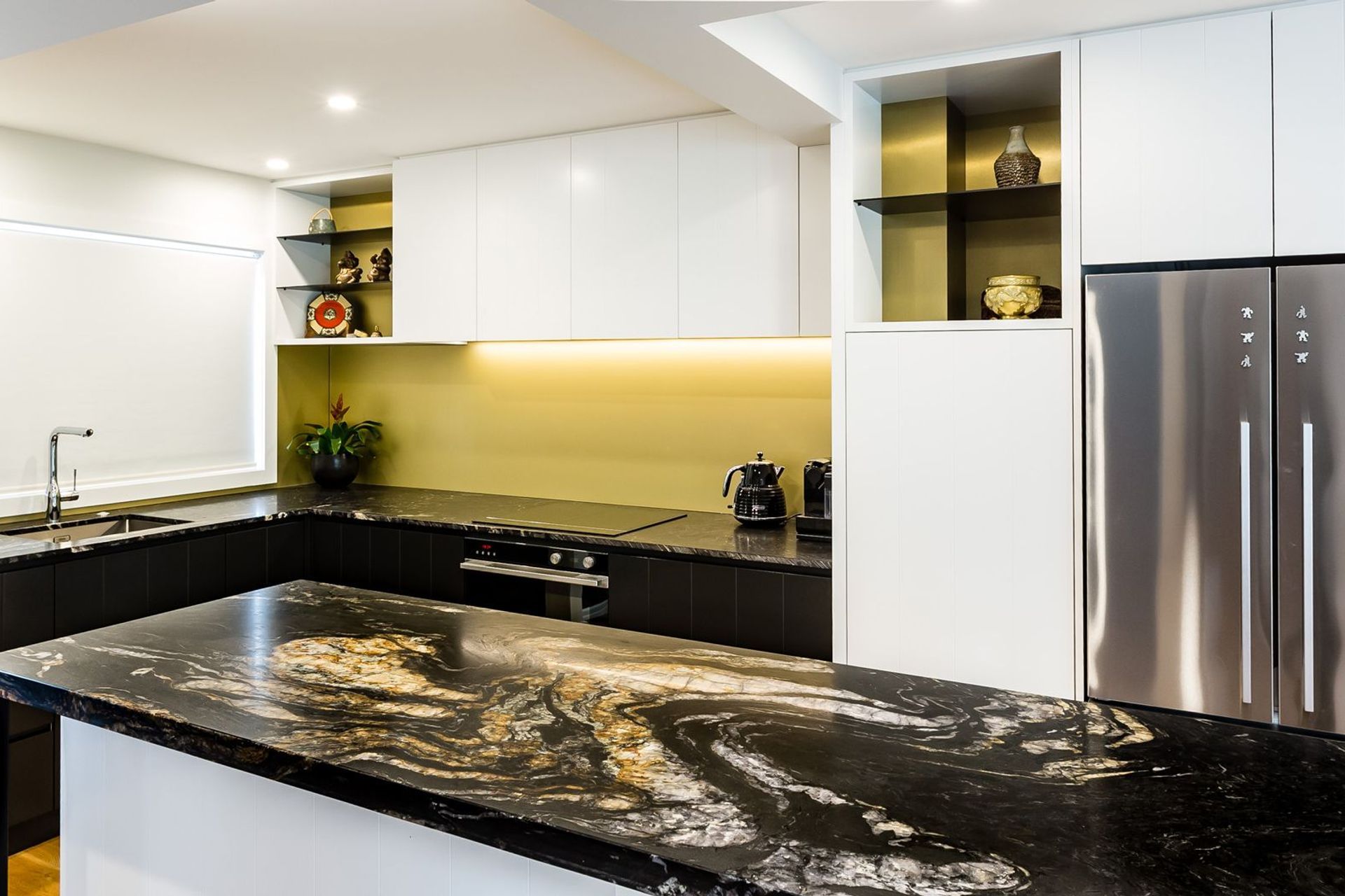 ArchiPro Project Summary - Custom colour splashback in Resene Gold Dust enhances the titanium gold granite benchtop and complements the brass tones behind the slim line steel shelving in a small Herne Bay apartment.