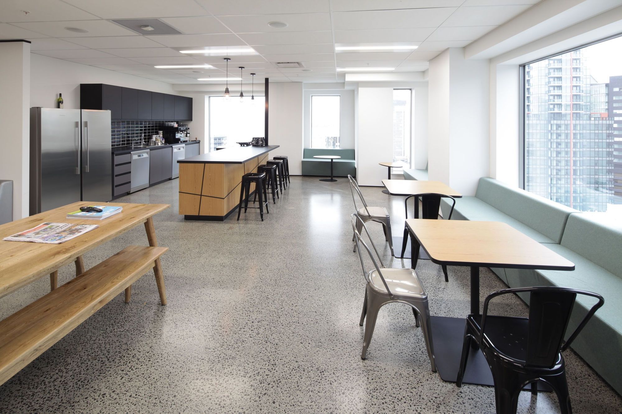 ArchiPro Project Summary - A versatile front-of-house environment featuring a semi-industrial aesthetic, designed for large functions with catering facilities, utilizing durable materials like solid timber, black steel, and concrete flooring, while subtly incorporating brand colors.