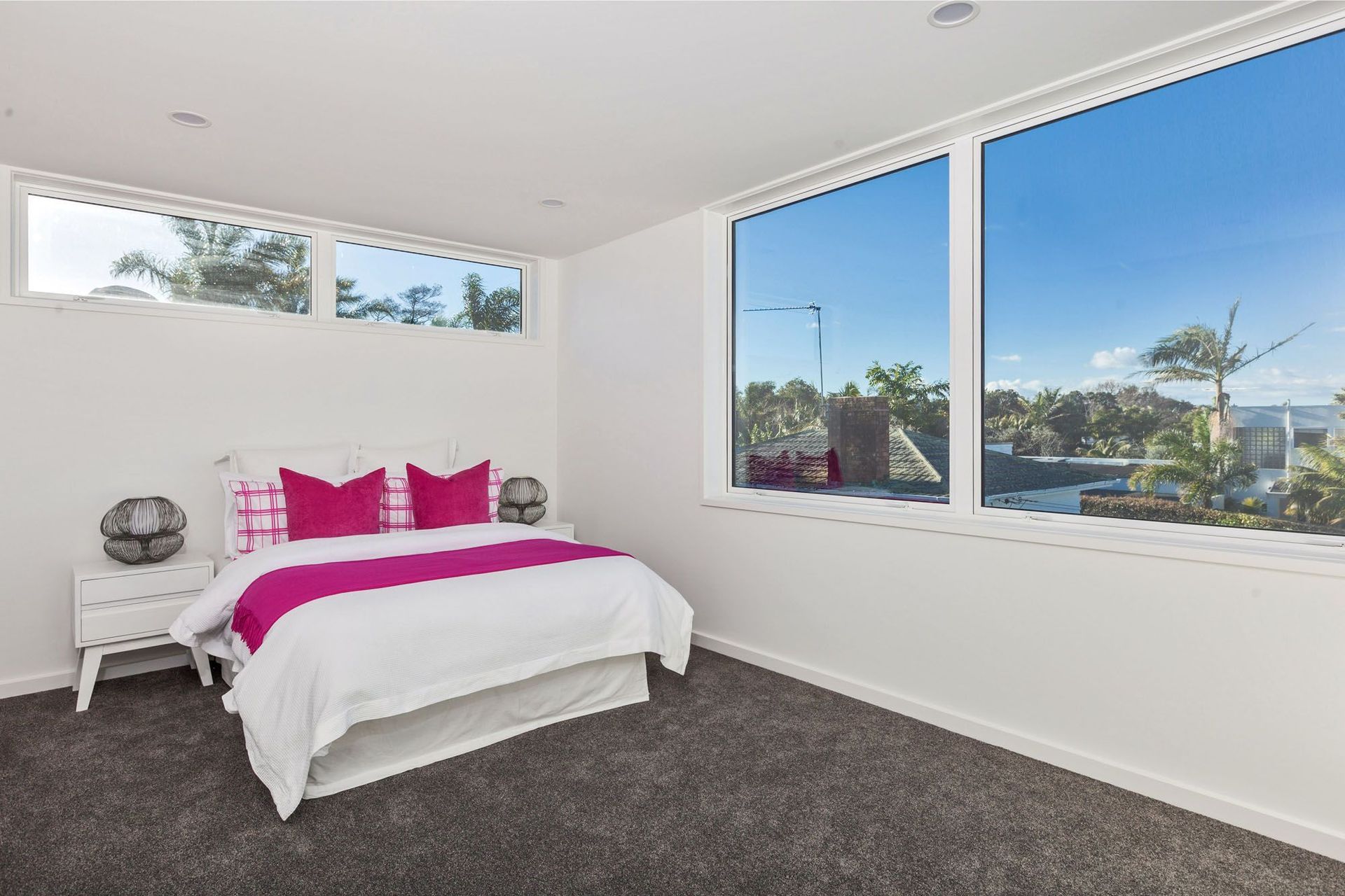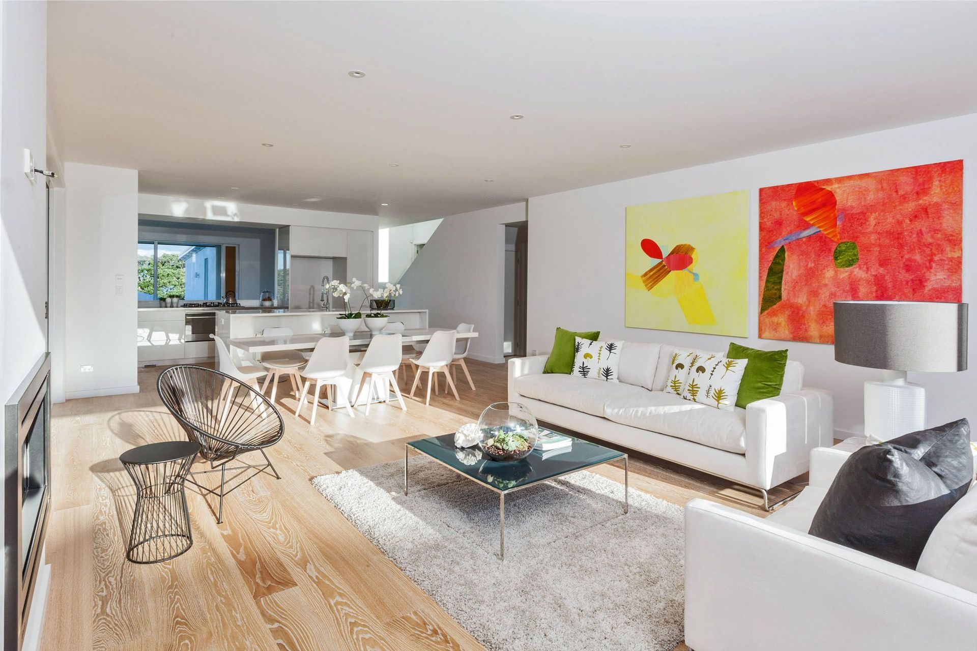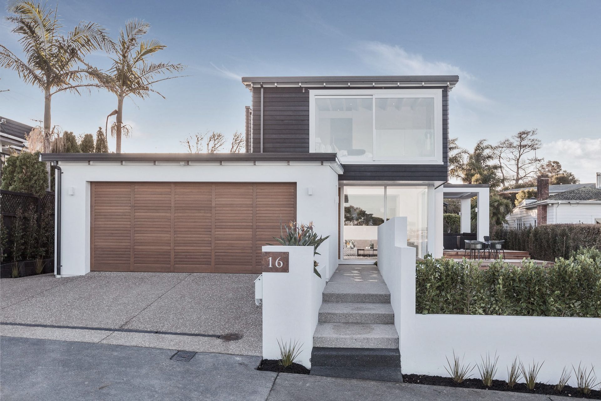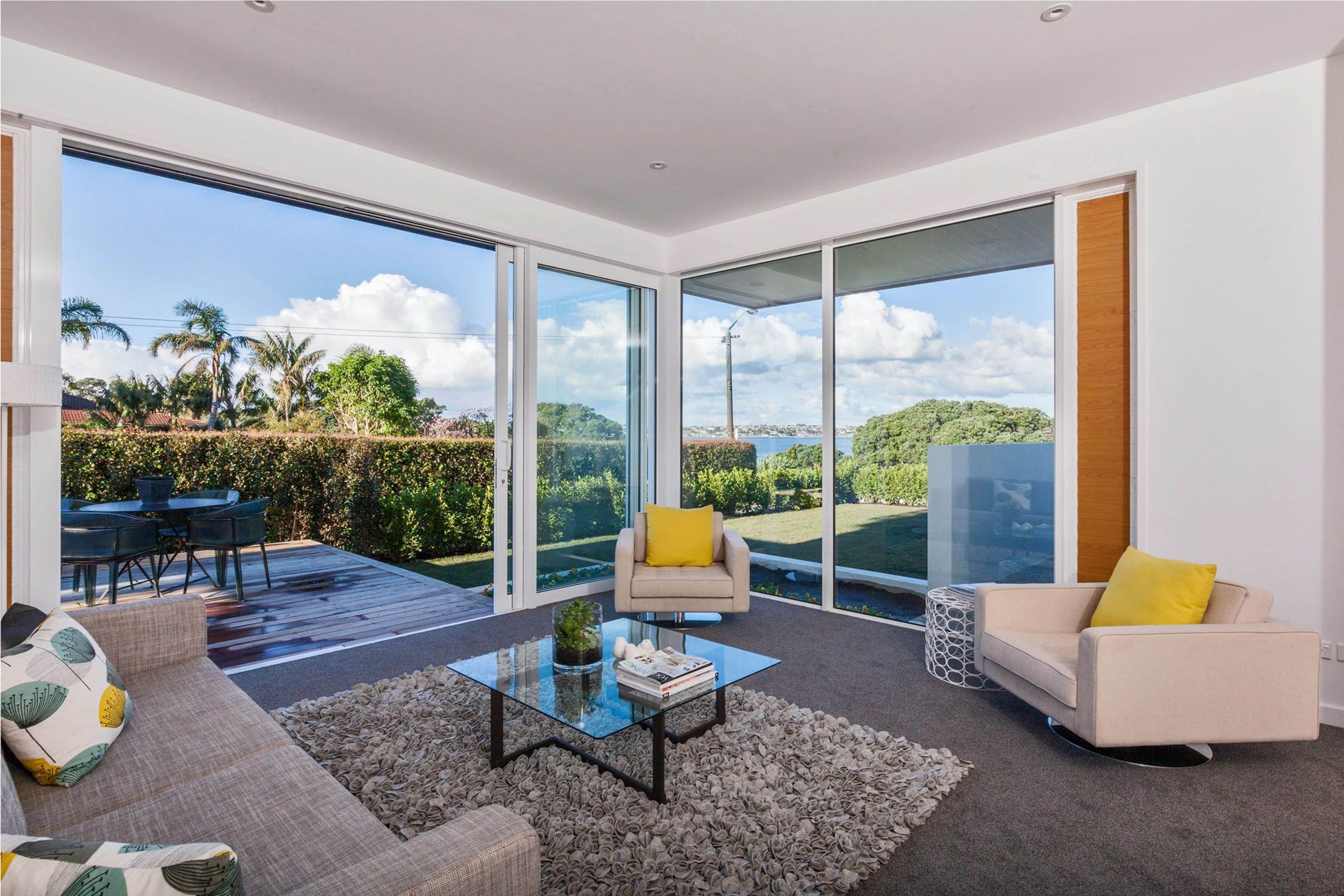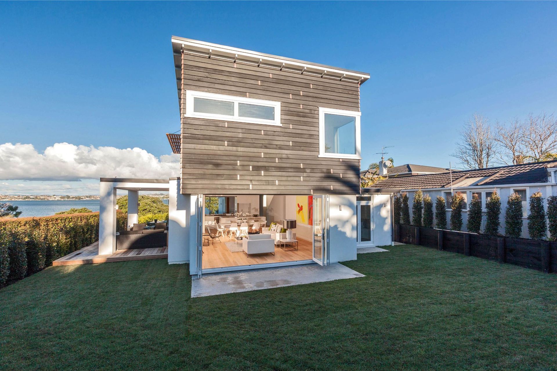 ArchiPro Project Summary - A modern luxury home in Glendowie featuring stunning sea views, open-plan living, and a blend of contemporary design elements, including monopitch roofing, natural materials, and spacious outdoor entertaining areas.