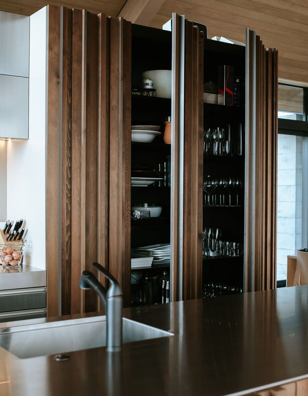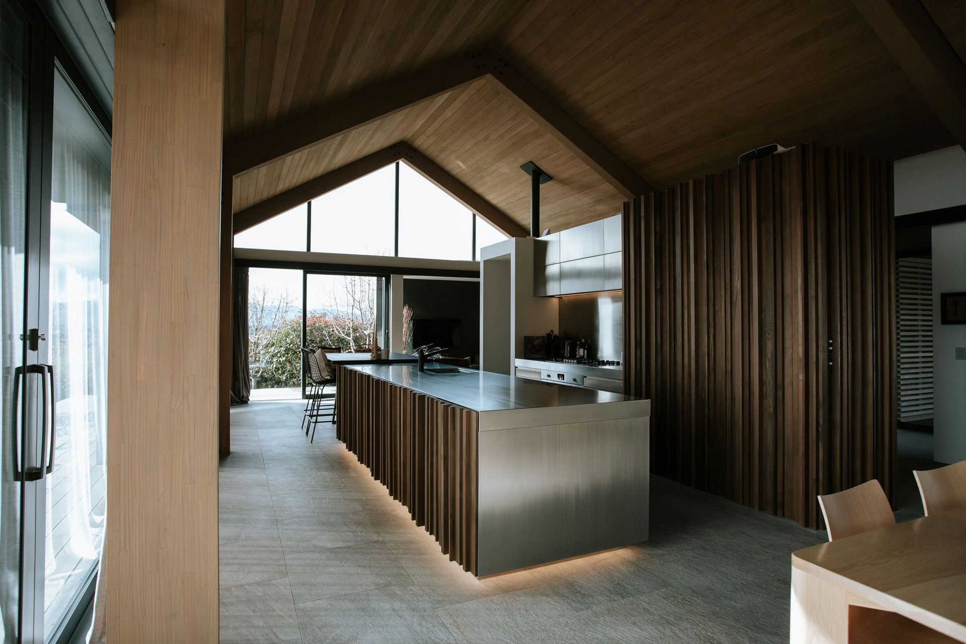 ArchiPro Project Summary - High-end kitchen design featuring vertical wood panelling, sleek stainless steel surfaces, and a statement kitchen island with LED lighting, crafted by a local architect in Wanaka.