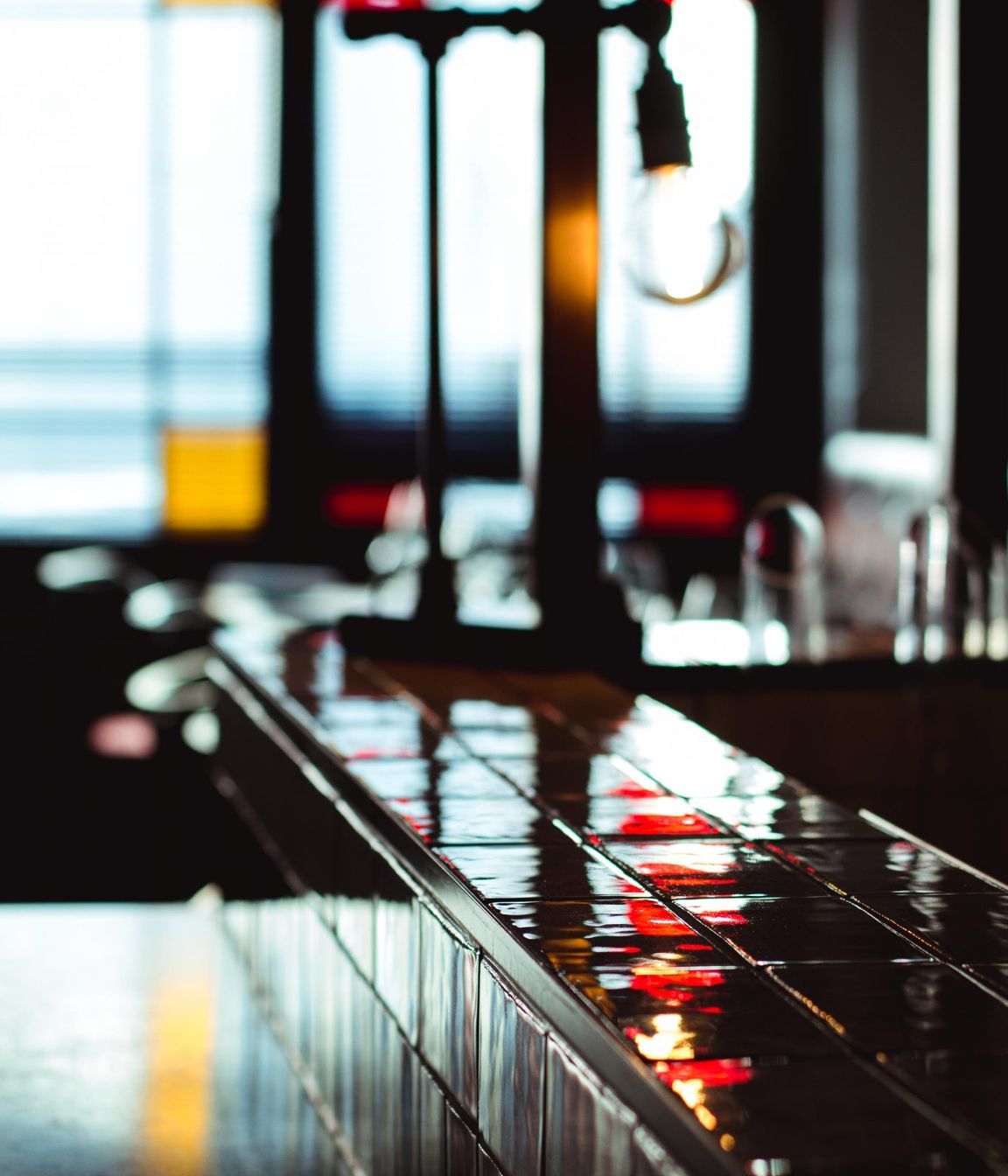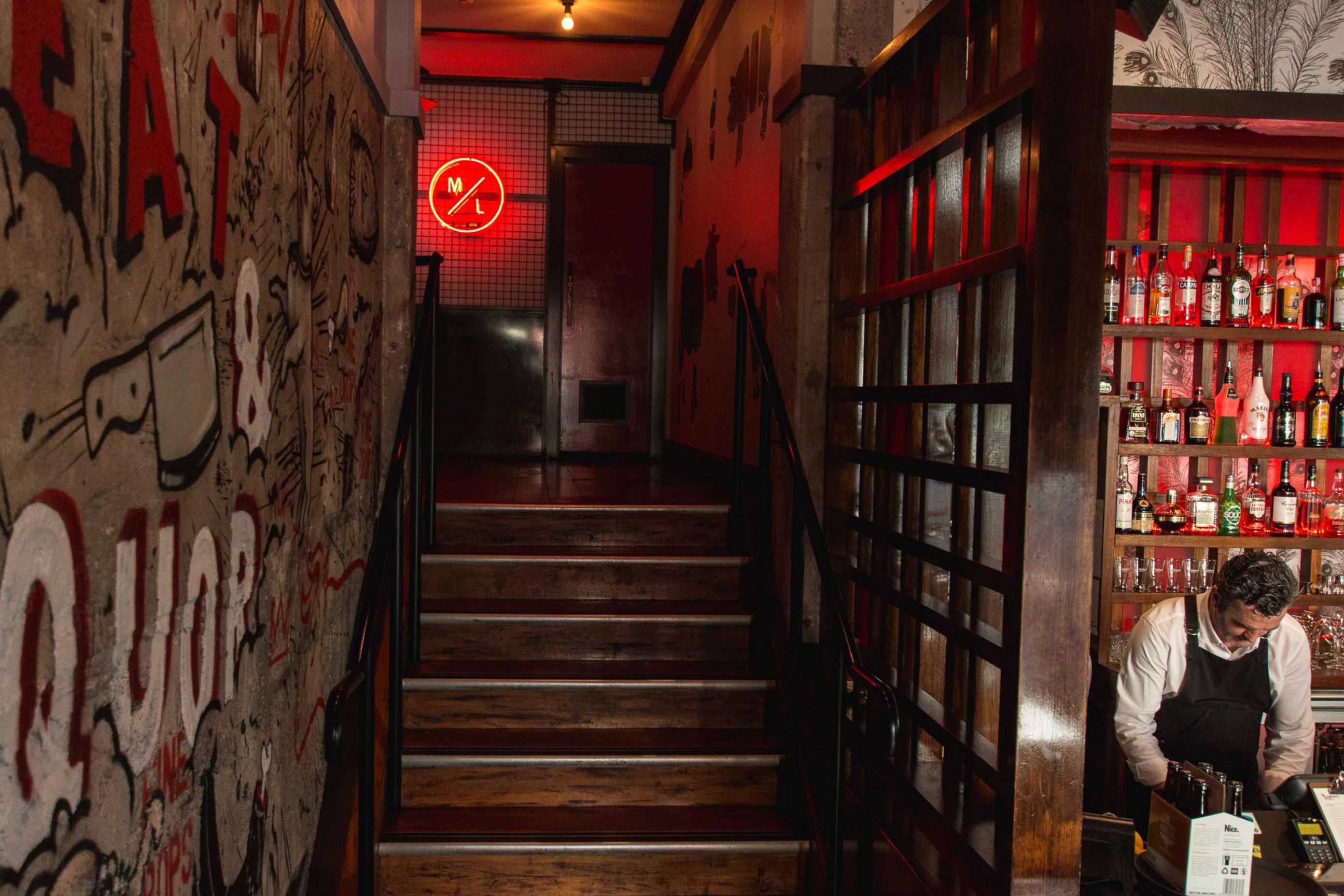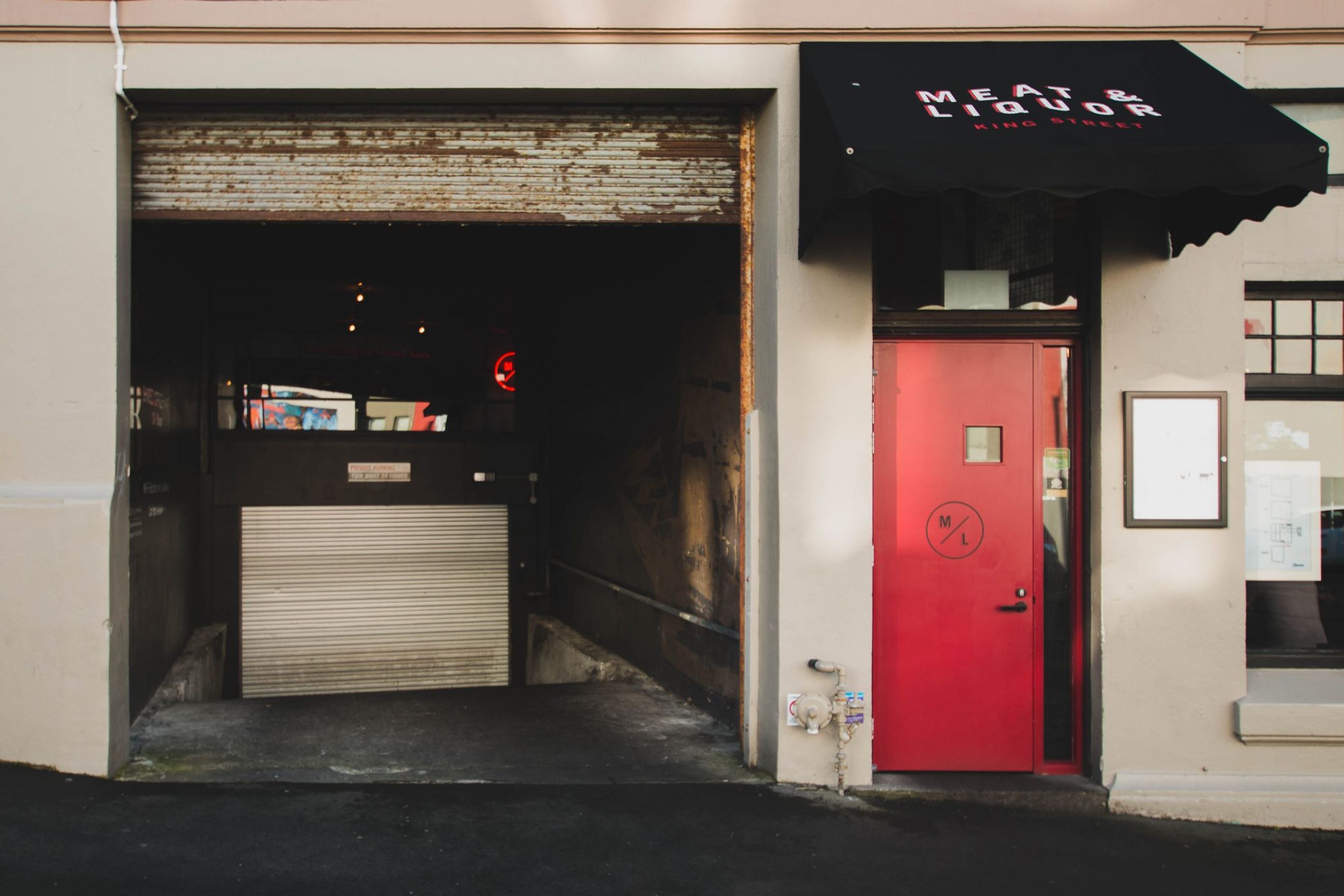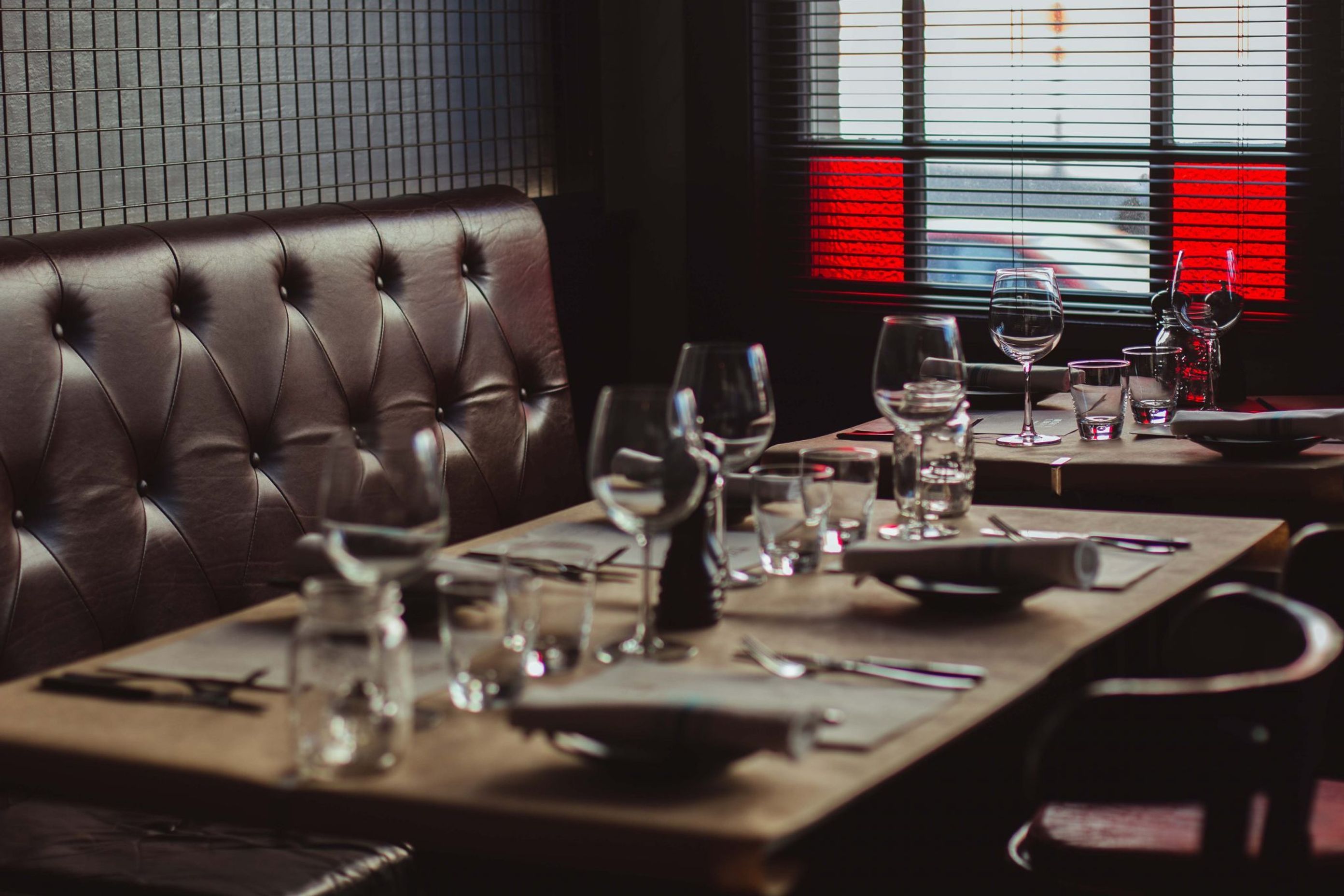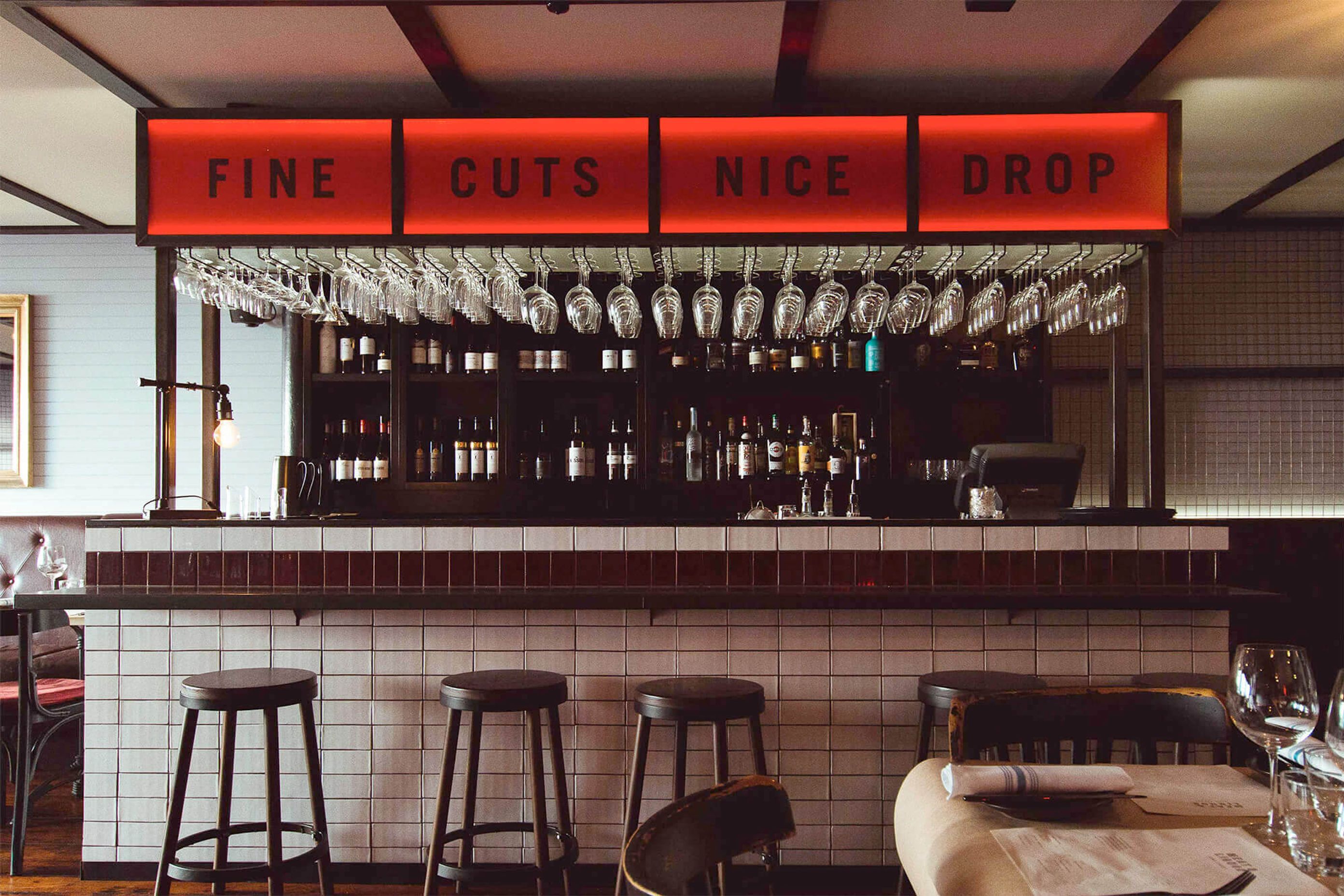 ArchiPro Project Summary - Restaurant fit-out featuring a raw material palette of steel, leather, handmade tiles, and Georgian wired glass, complemented by soft lighting and red neon accents, highlighting the commitment to quality meat sourcing.