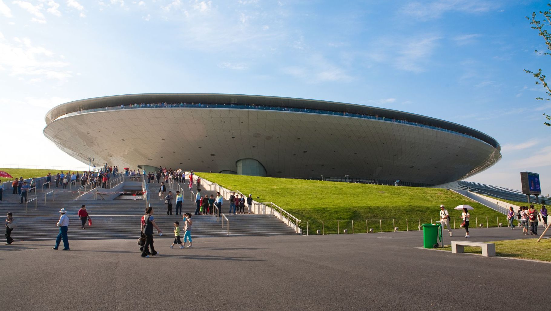 ArchiPro Project Summary - The Mercedes-Benz Arena in Shanghai features a striking oval design reminiscent of a flying saucer, showcasing a pearlescent EuraMica finish and aluminum sandwich panel cladding, creating a captivating cultural and commercial landmark.