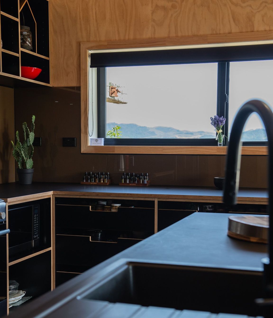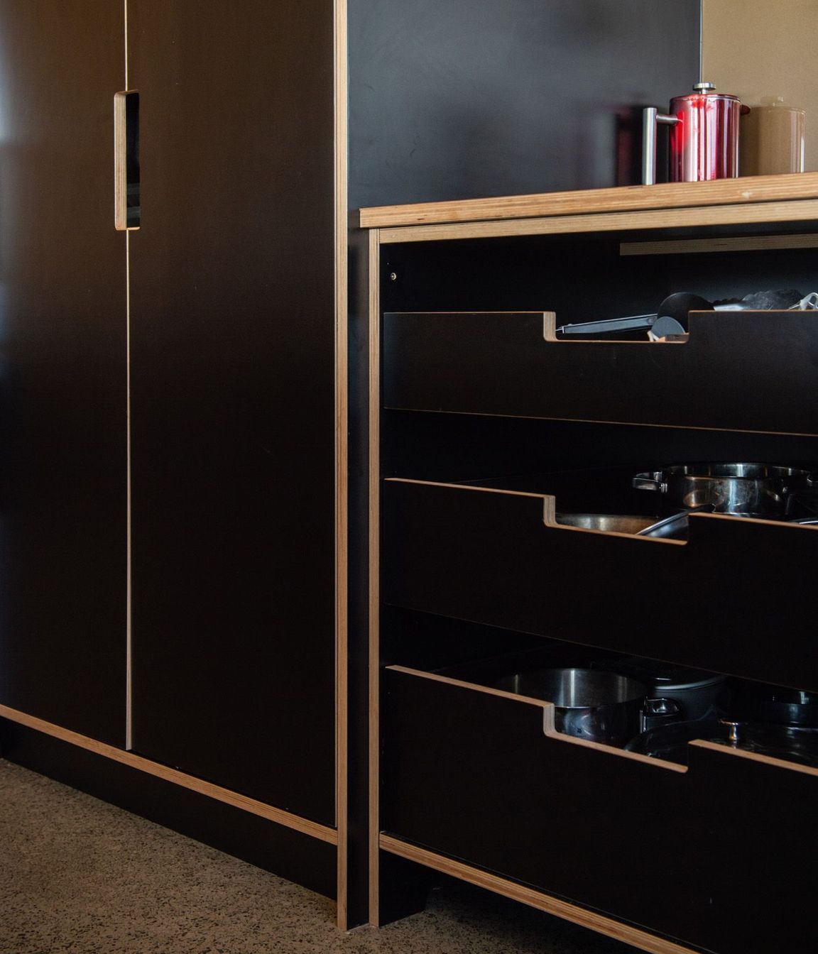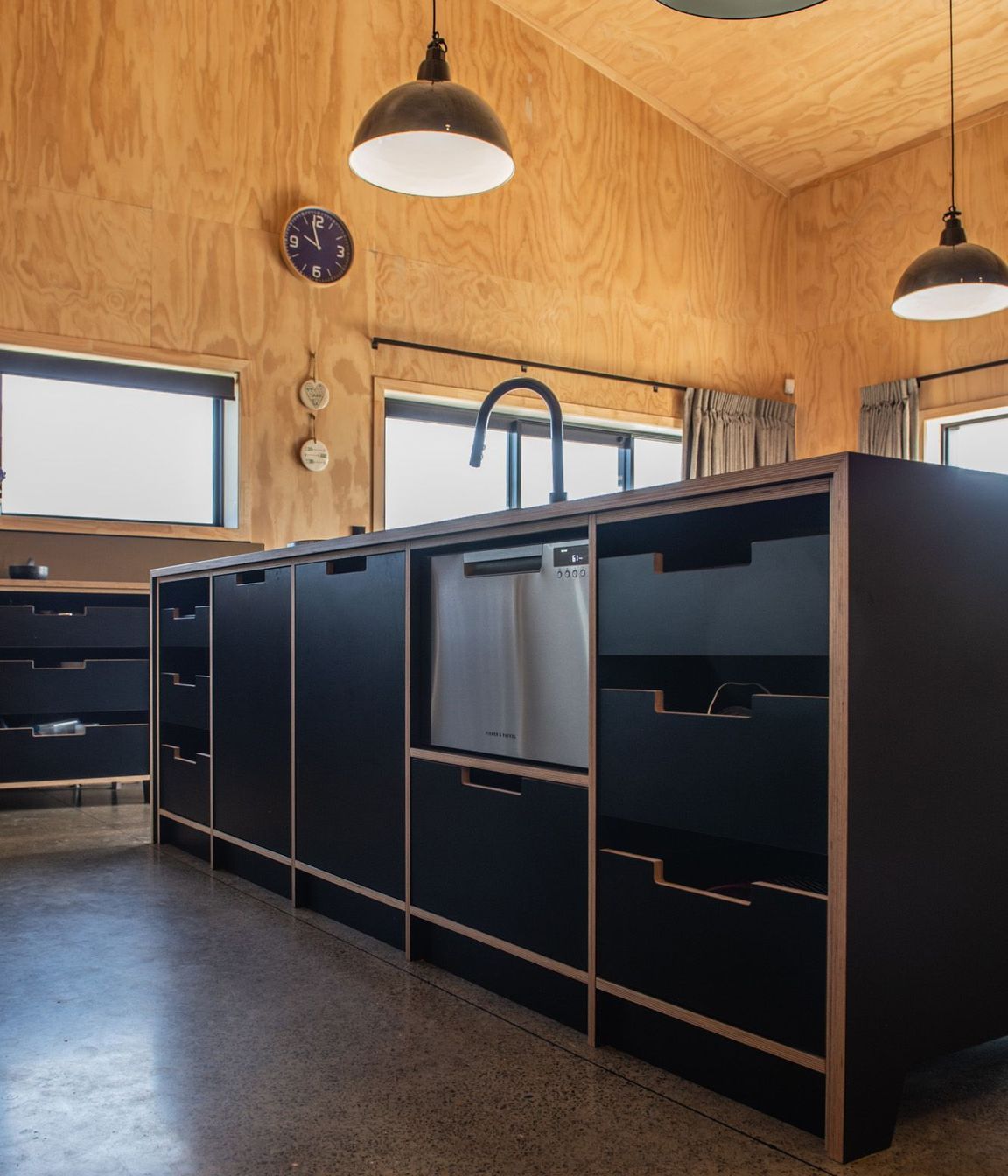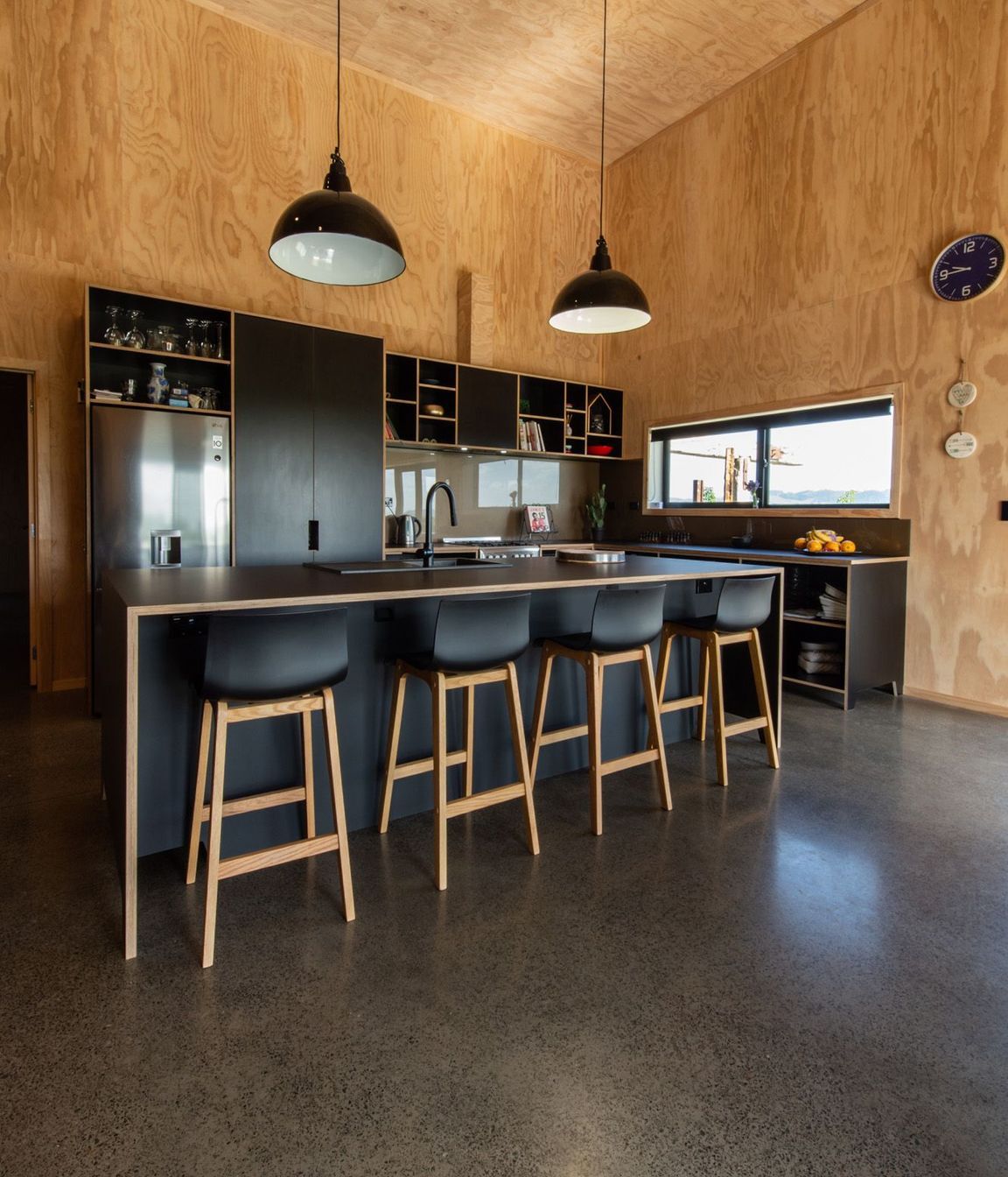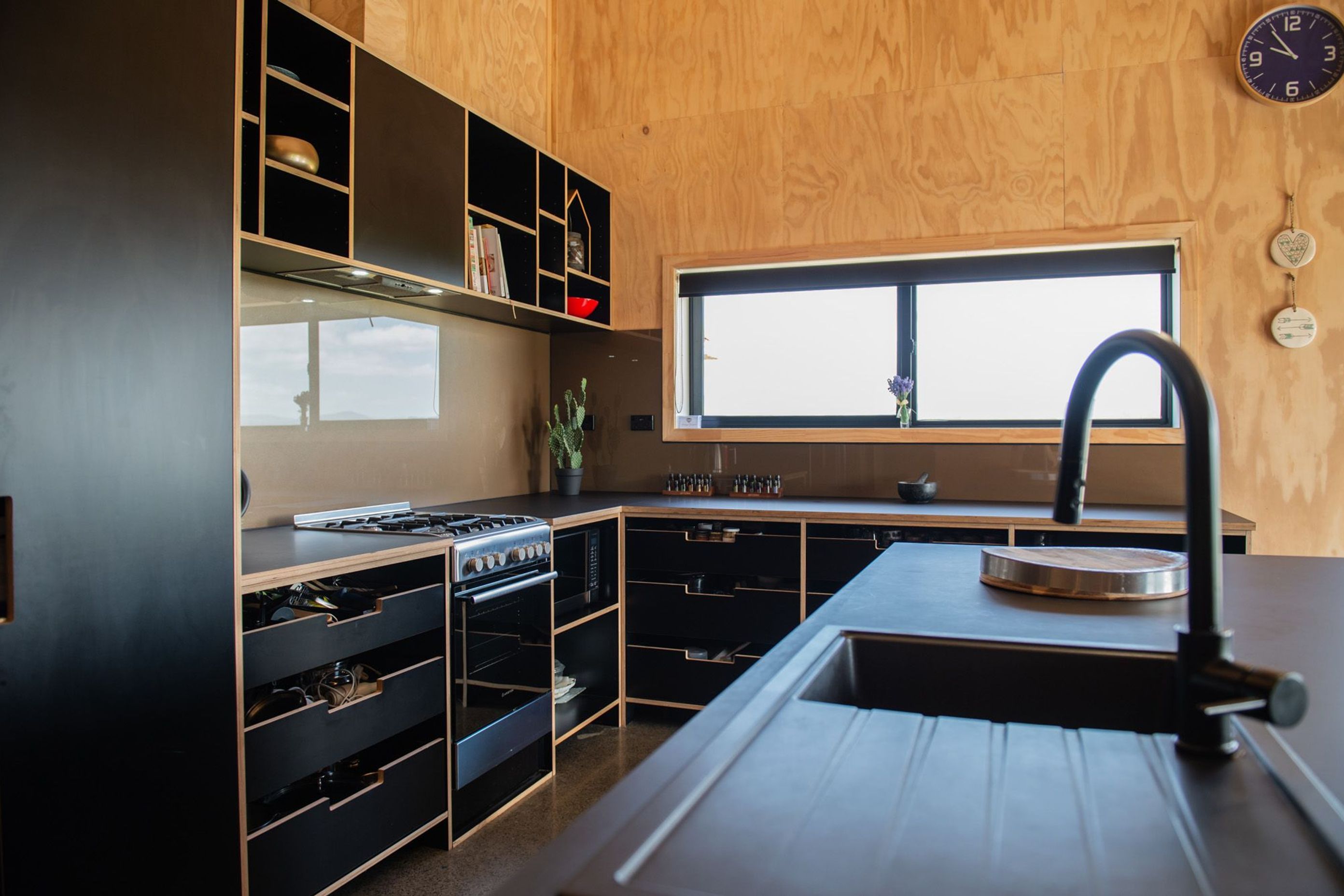 ArchiPro Project Summary - A sophisticated kitchen featuring natural birch plywood and matte black laminate, combining warmth and elegance with custom handles and shaped panels, while maintaining a minimalistic aesthetic and a beach Bach feel through the absence of kickboards.