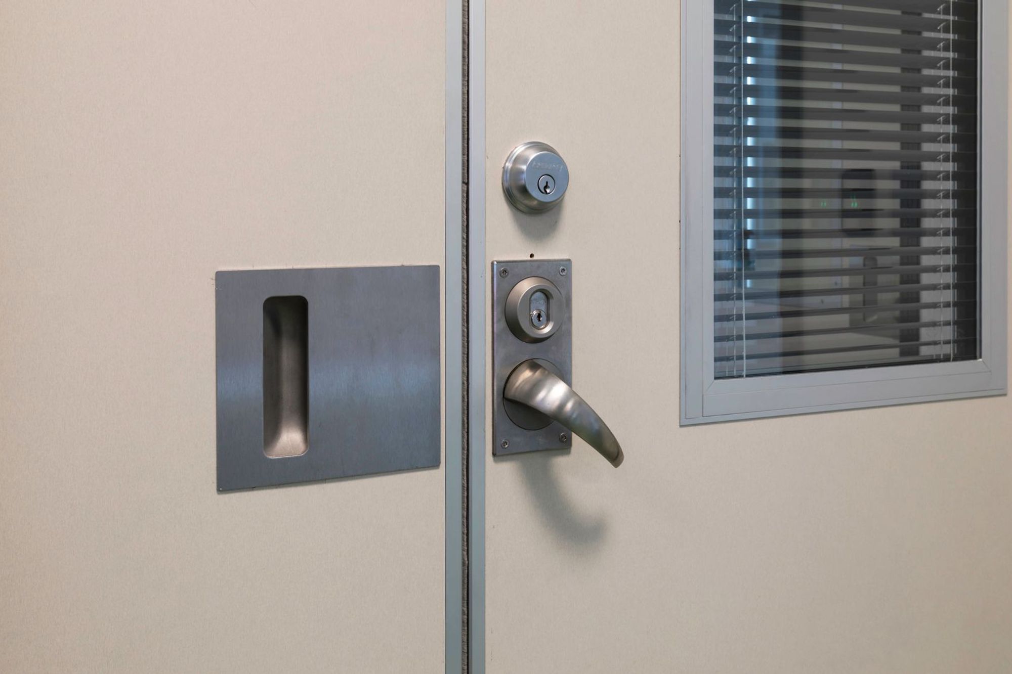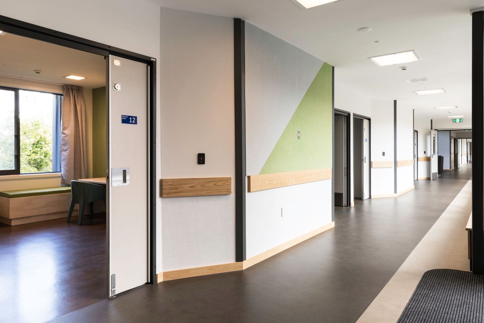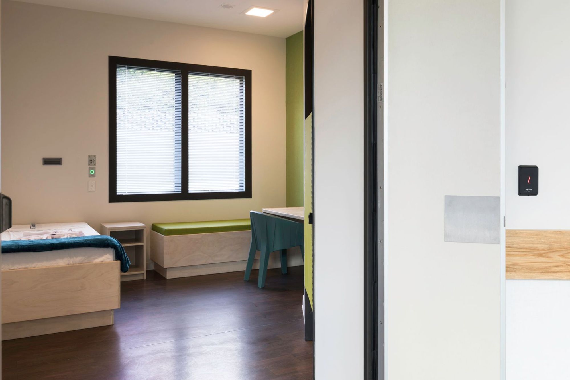 Bedrooms were the first area of focus and the hospital mocked up two full-scale suites with a complete entry door frame and assembly. Door and bathroom hardware pose the greatest risk to residents who may want to self-harm, so locks and handles needed to be flush, smooth, tamperproof and anti-ligature, while not looking heavily institutional. ASSA ABLOY supplied a range of hardware samples for testing on the one-and-a-half leaf configuration – a door solution that provided safe access in an emergency and improved privacy from the corridor.