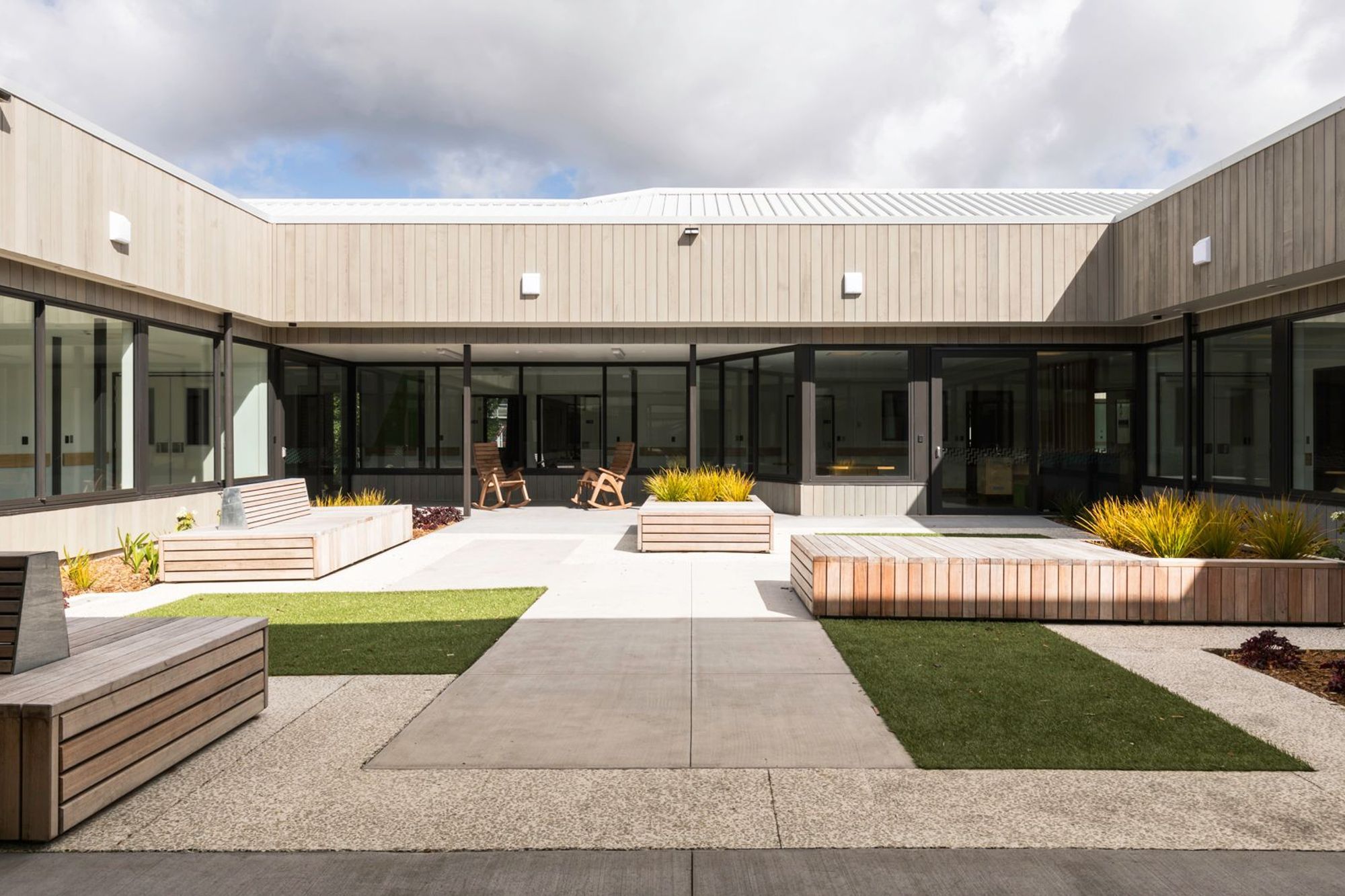 The 76-bed facility is defined by seven landscaped courtyards, which create light-filled, single-loaded residential corridors, and open-plan socialisation rooms which flow onto private outdoor space. The largest is the therapies courtyard linking the reception area, whare and whare kai space through to the central therapy and activity heart of the building.