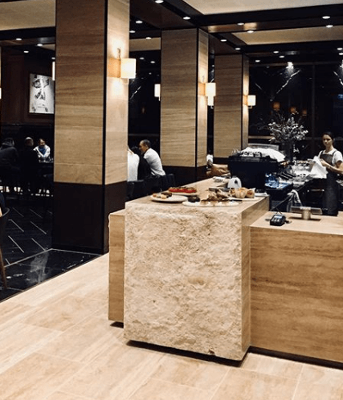 ArchiPro Project Summary - Stylish Queen Street eatery featuring warm and inviting travertine supplied by Designsource, creating a sophisticated dining atmosphere.