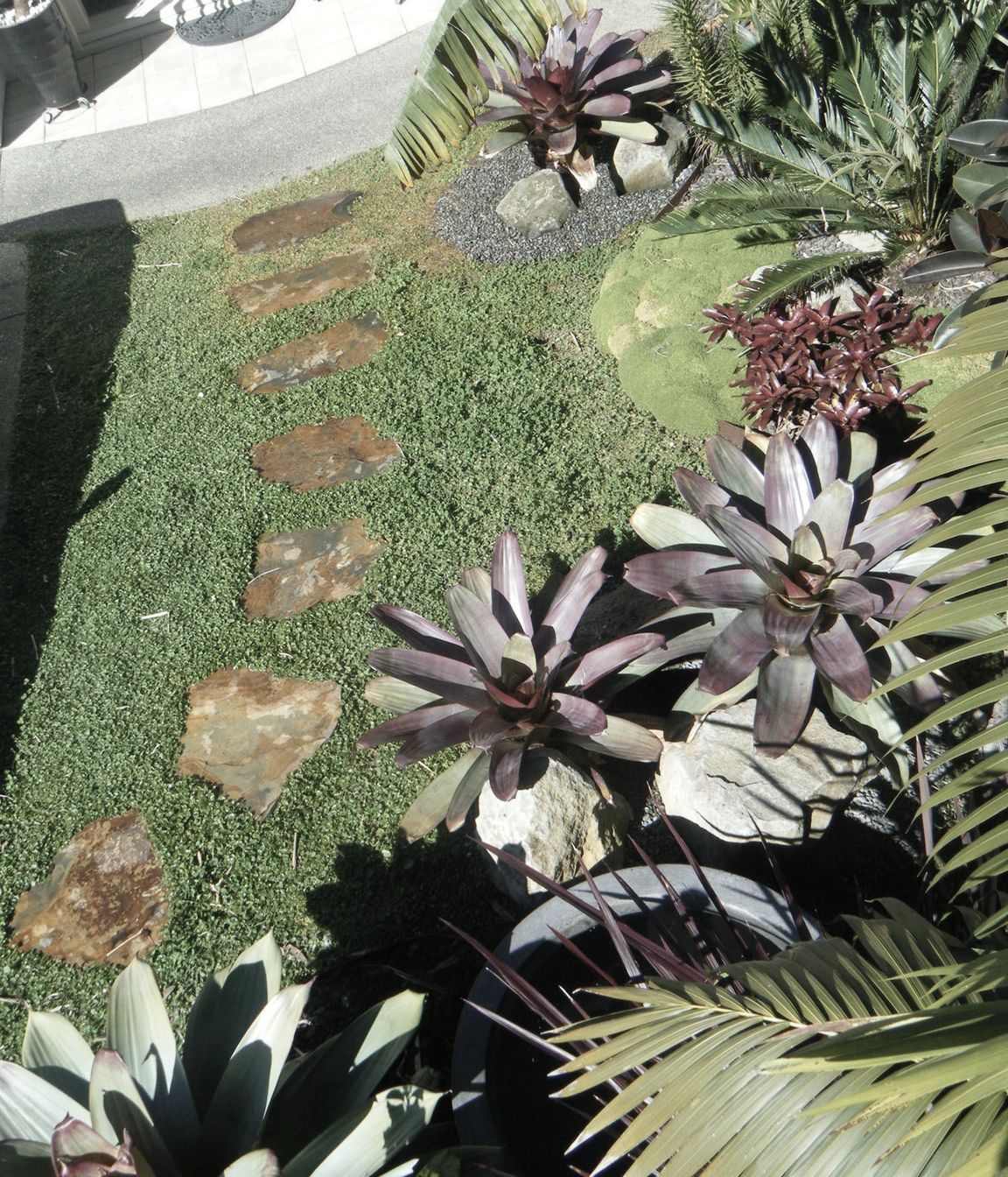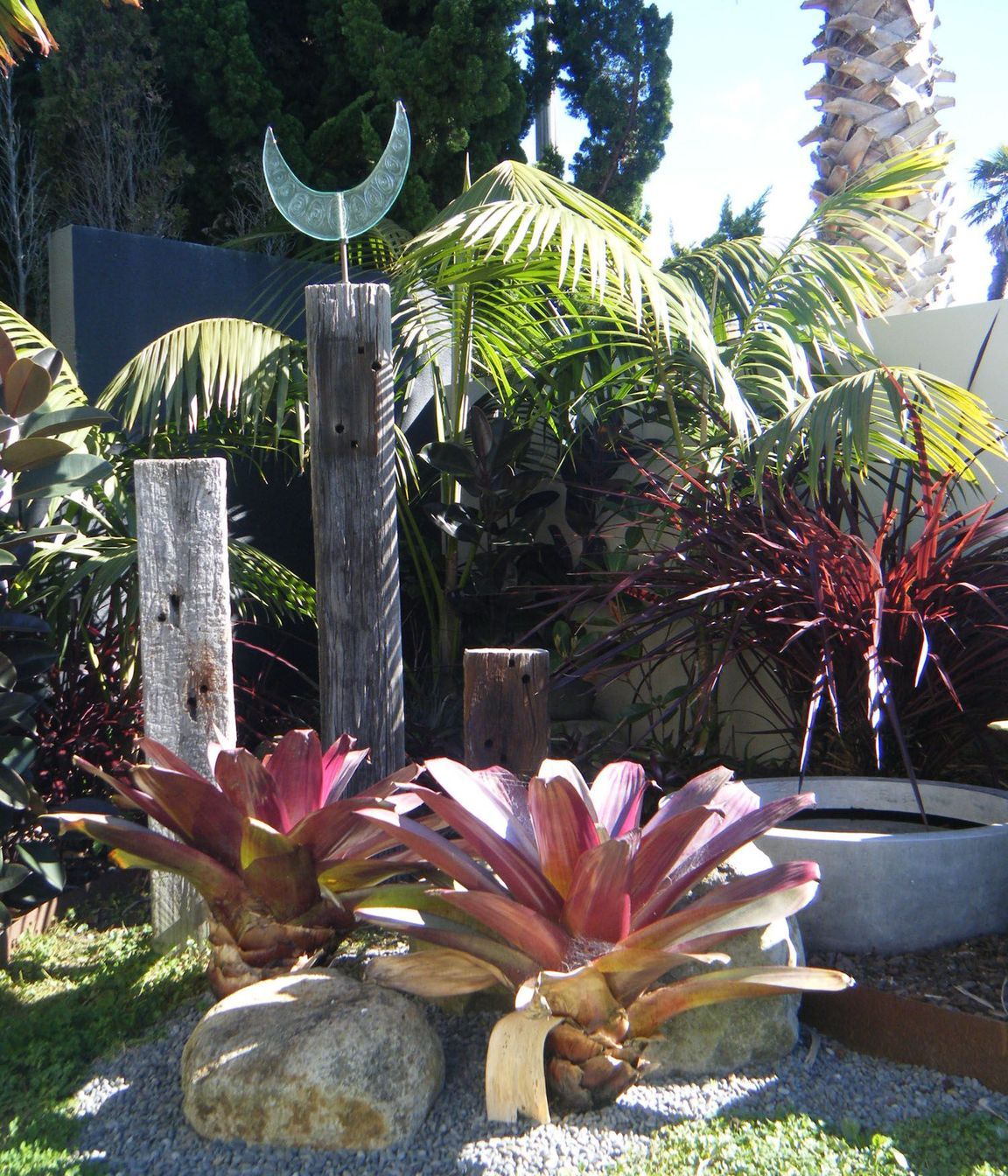 ArchiPro Project Summary - A captivating garden featuring slate stepping stones, a no-mow lawn, and a lush tropical backdrop, enhanced by structural plants like Alcantarea Rubra and cycads, with a unique art installation mounted on old railway sleepers for added height and focus.