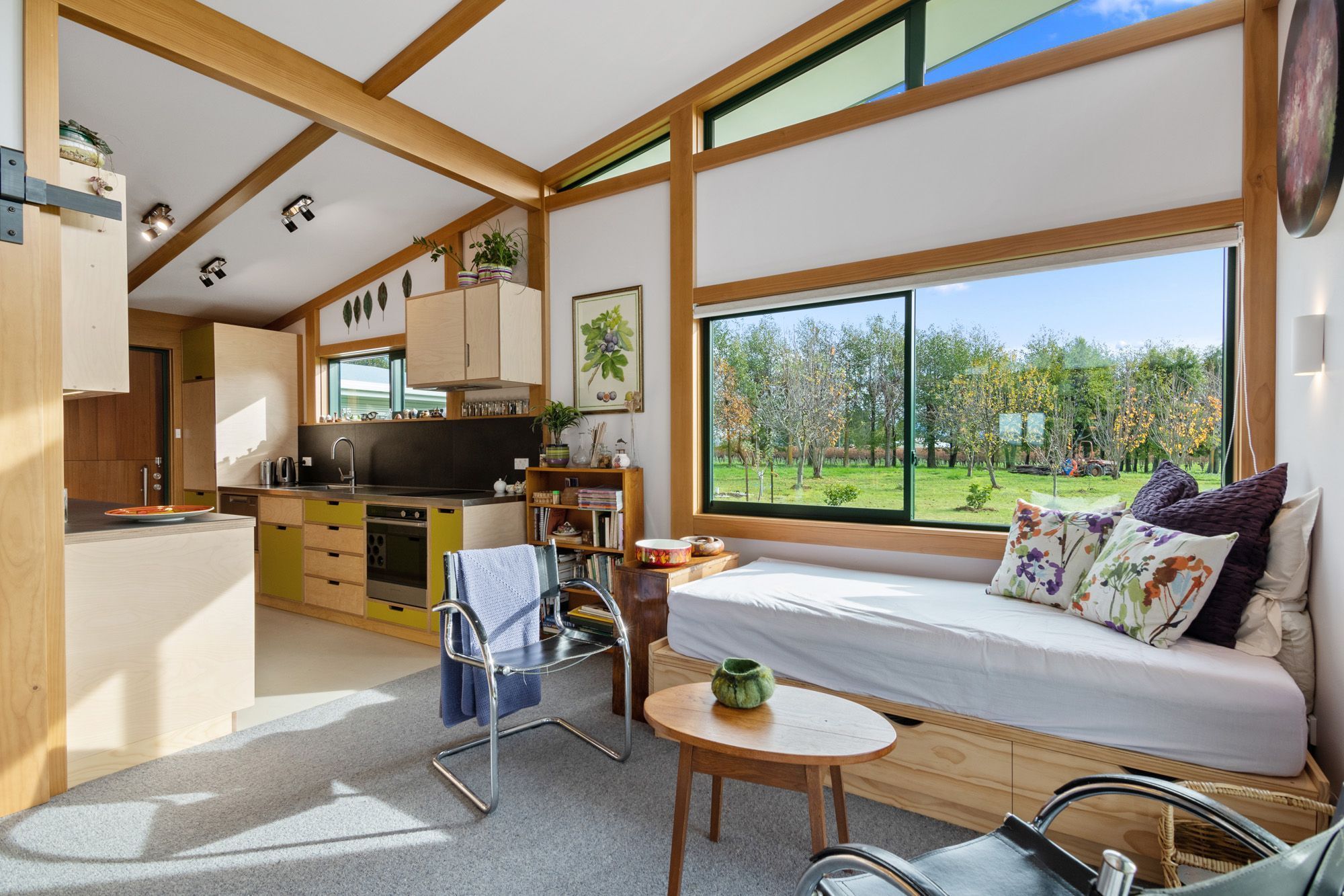ArchiPro Project Summary - A thoughtfully designed one-bedroom dwelling near Blenheim, blending quirky country living with modern features, including high ceilings, solar gain, and innovative storage solutions, while paying homage to traditional New Zealand farm architecture.