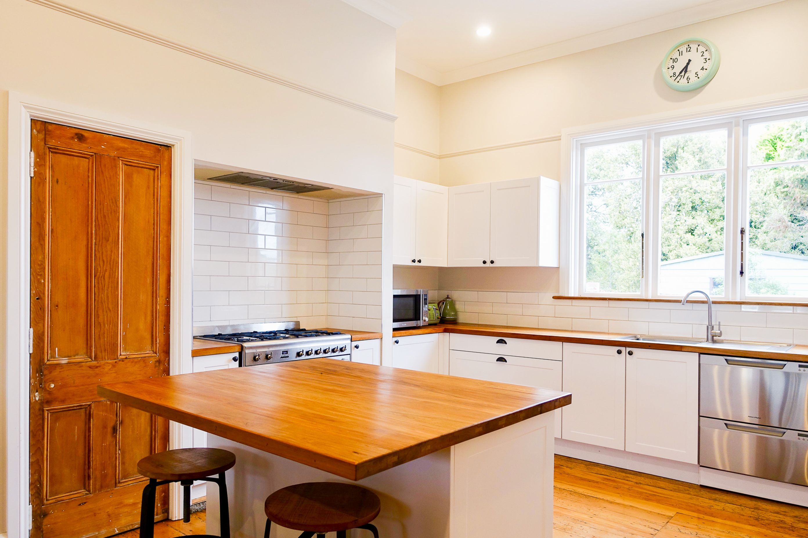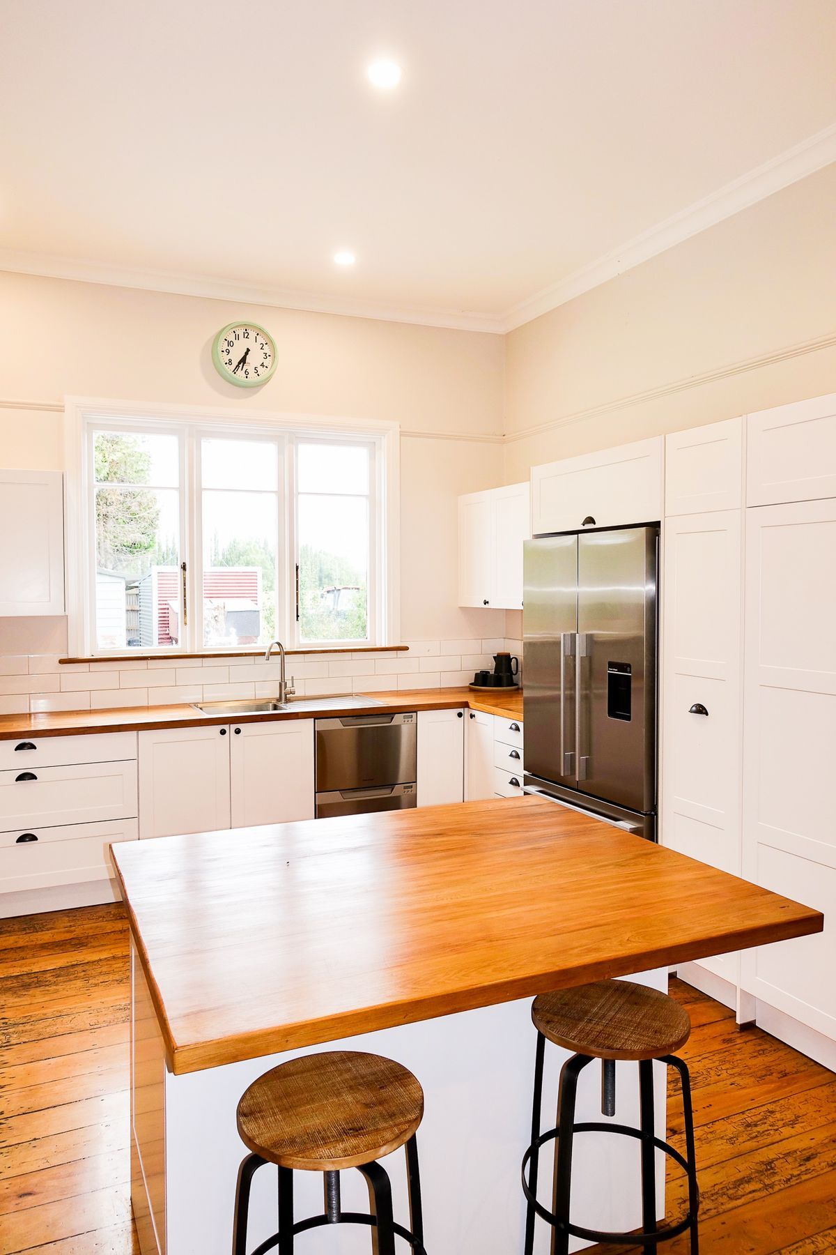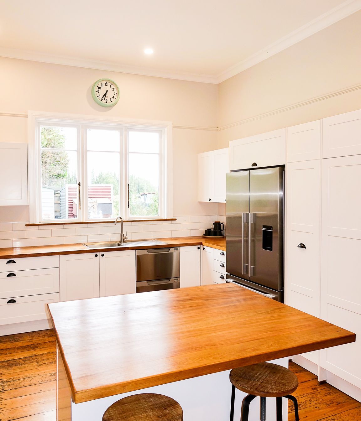 ArchiPro Project Summary - A thoughtfully designed kitchen in a 1903 villa, featuring white painted cupboards, rimu wood bench tops, and a blend of antique handles, complemented by ample storage solutions including a pull-out double pantry.