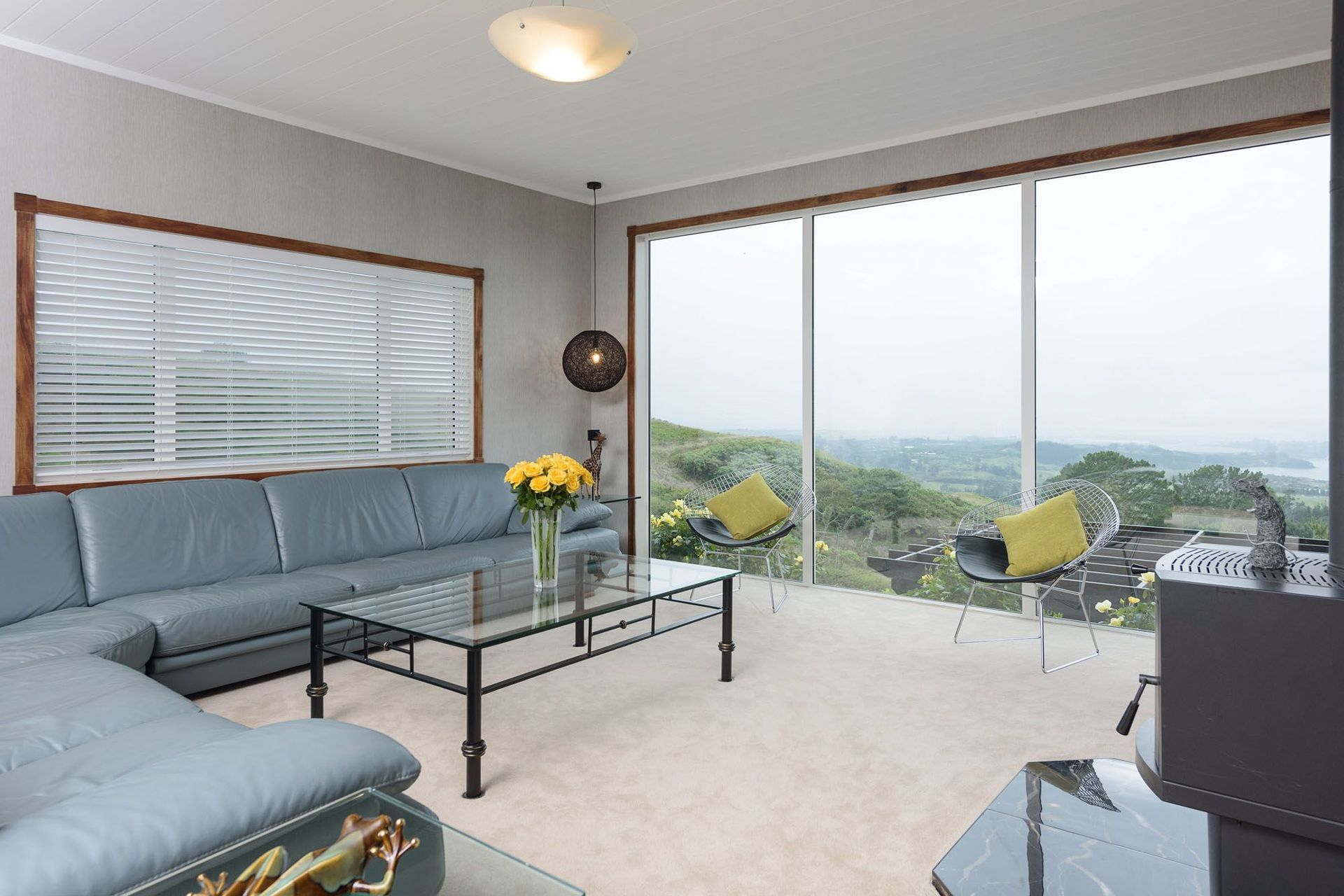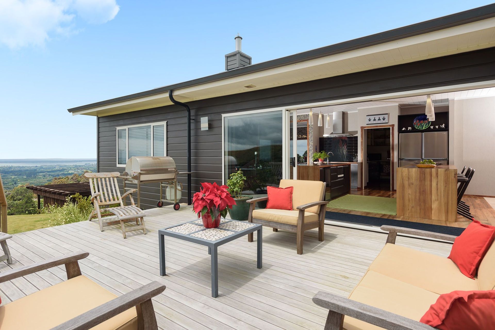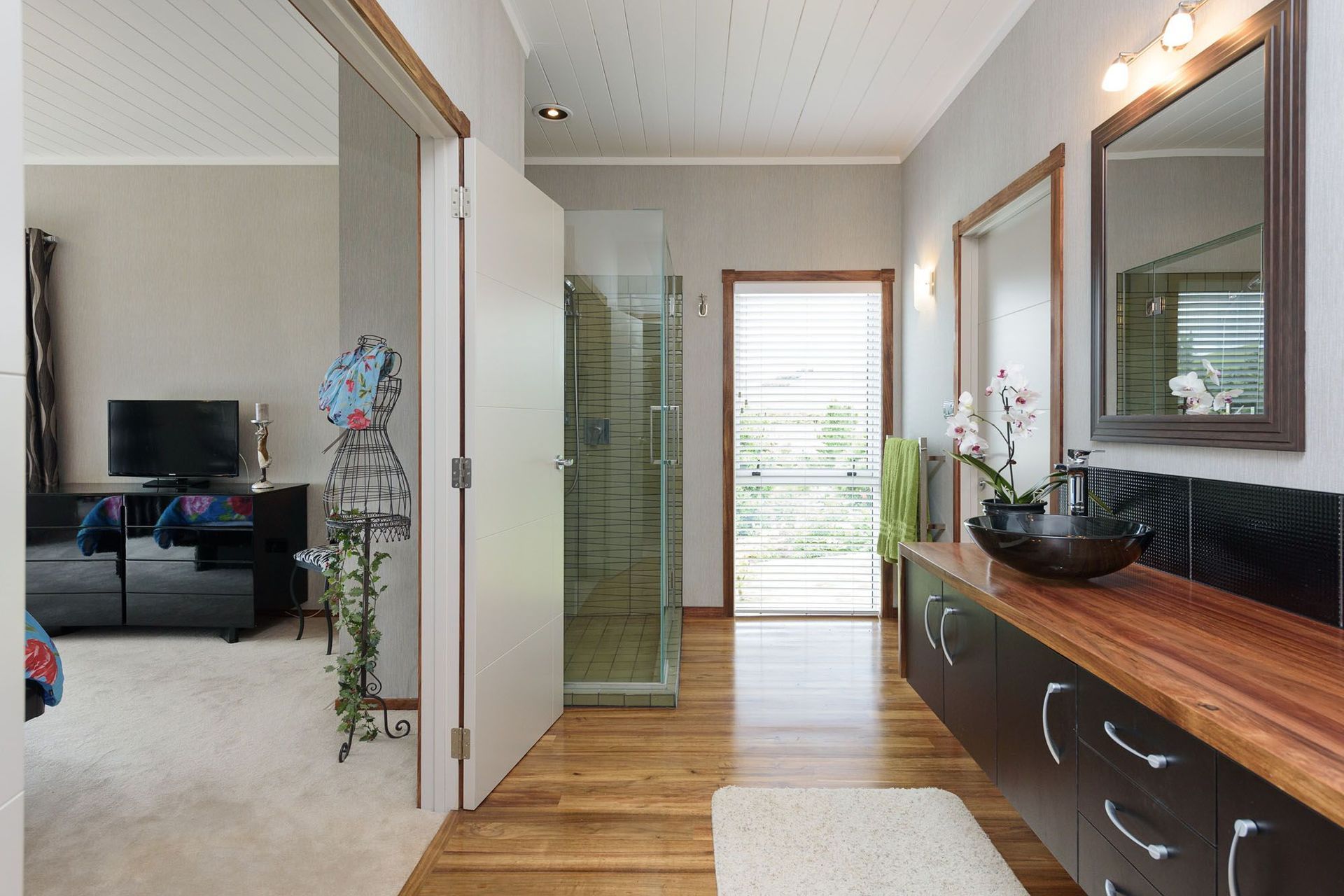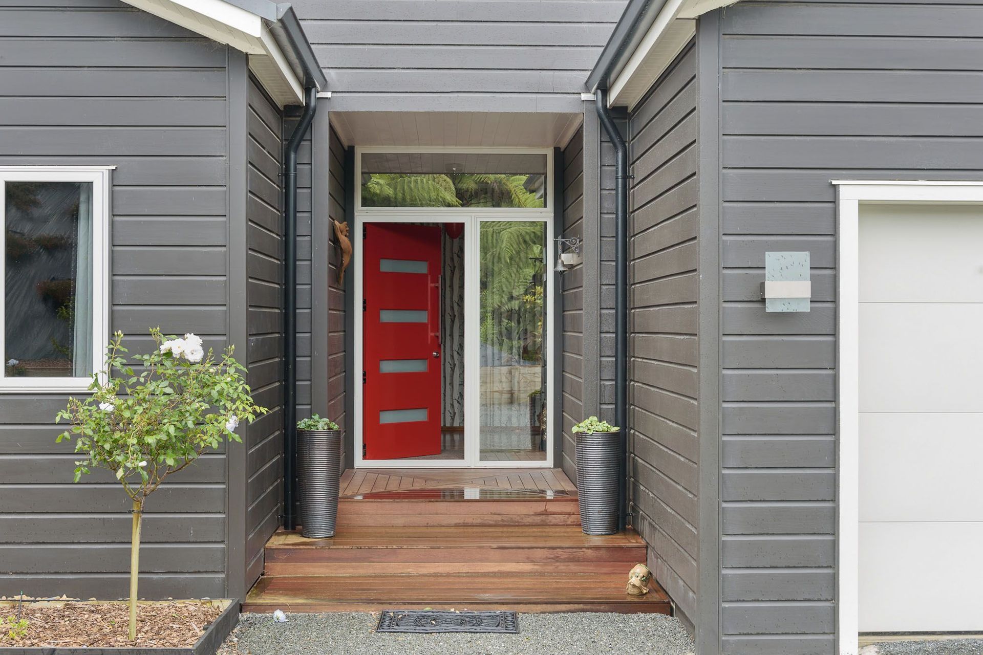 ArchiPro Project Summary - Stunning home on Minden Road designed to maximize breathtaking views of Tauranga Harbour, featuring exquisite Tasmanian Blackwood interiors, Coloursteel roofing, painted timber front door, and rustic timber weatherboard cladding.