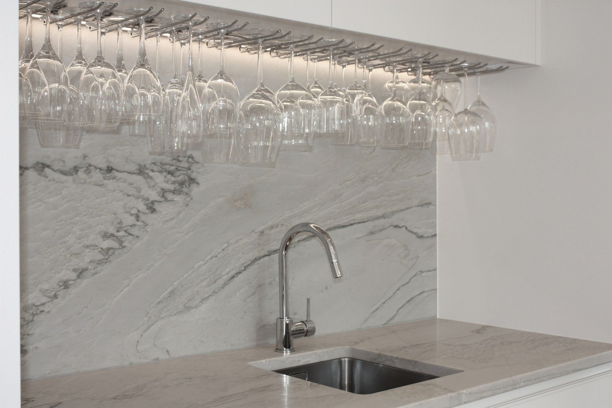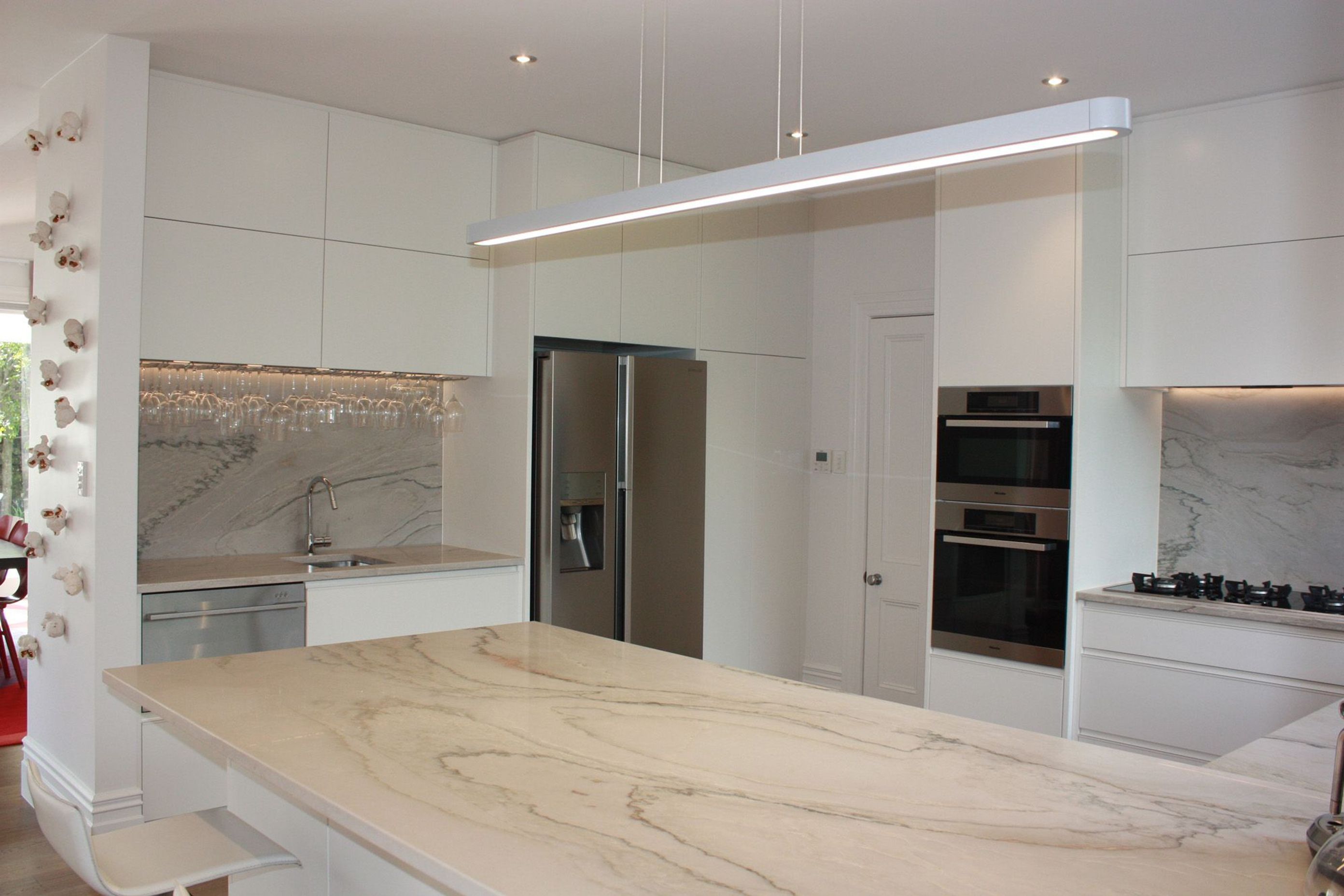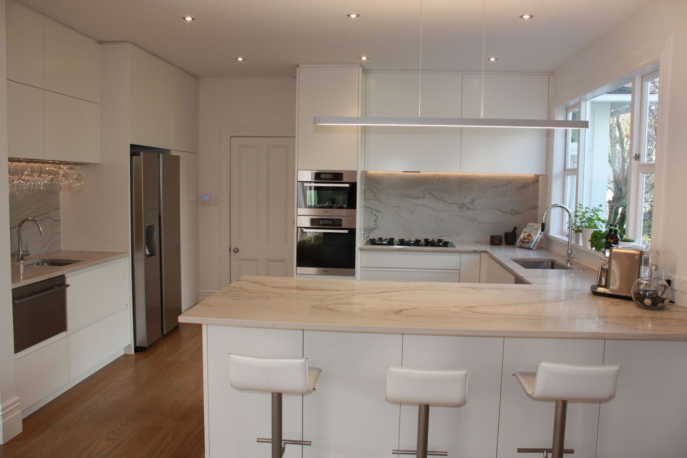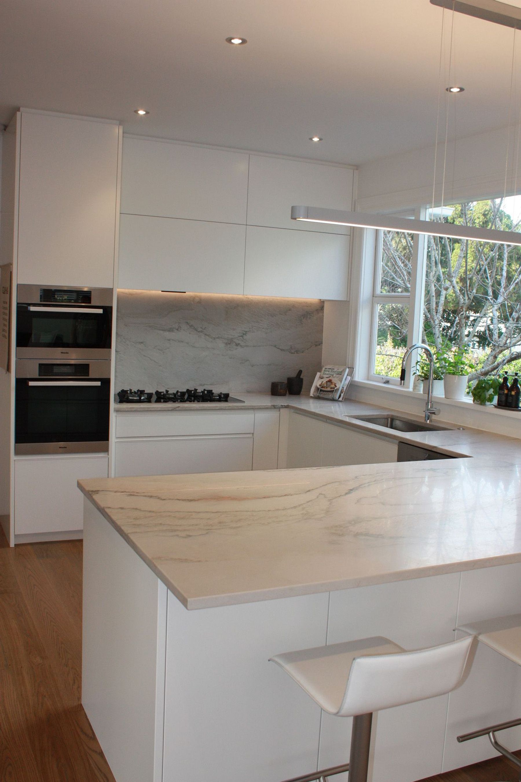 ArchiPro Project Summary - A beautifully appointed minimalist white kitchen featuring Quartzite White Macaubas granite, dual prep areas with sinks, dish drawers, and Servo-drive rubbish bins, complemented by tall cupboards with Blum Servo-drive lift-up doors for optimal storage and ease of access.