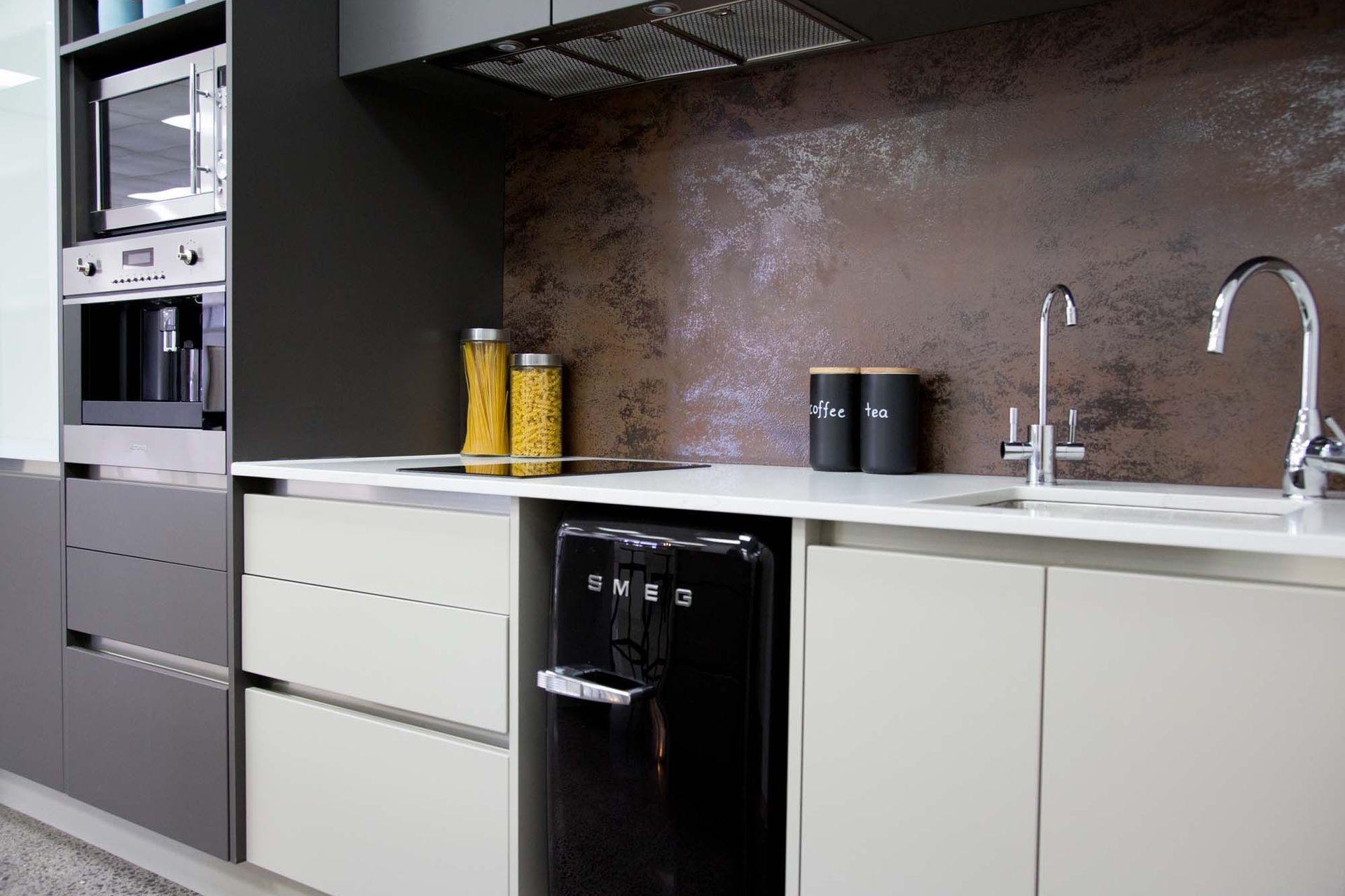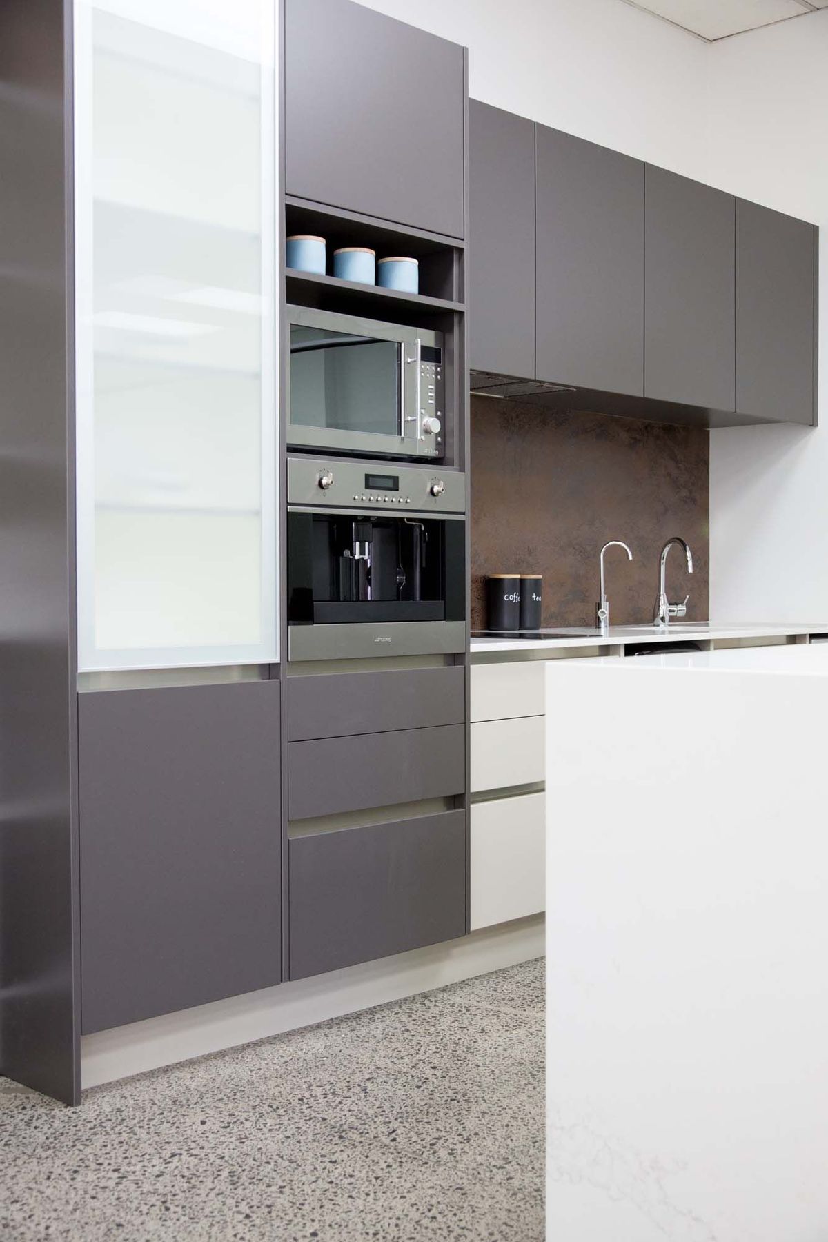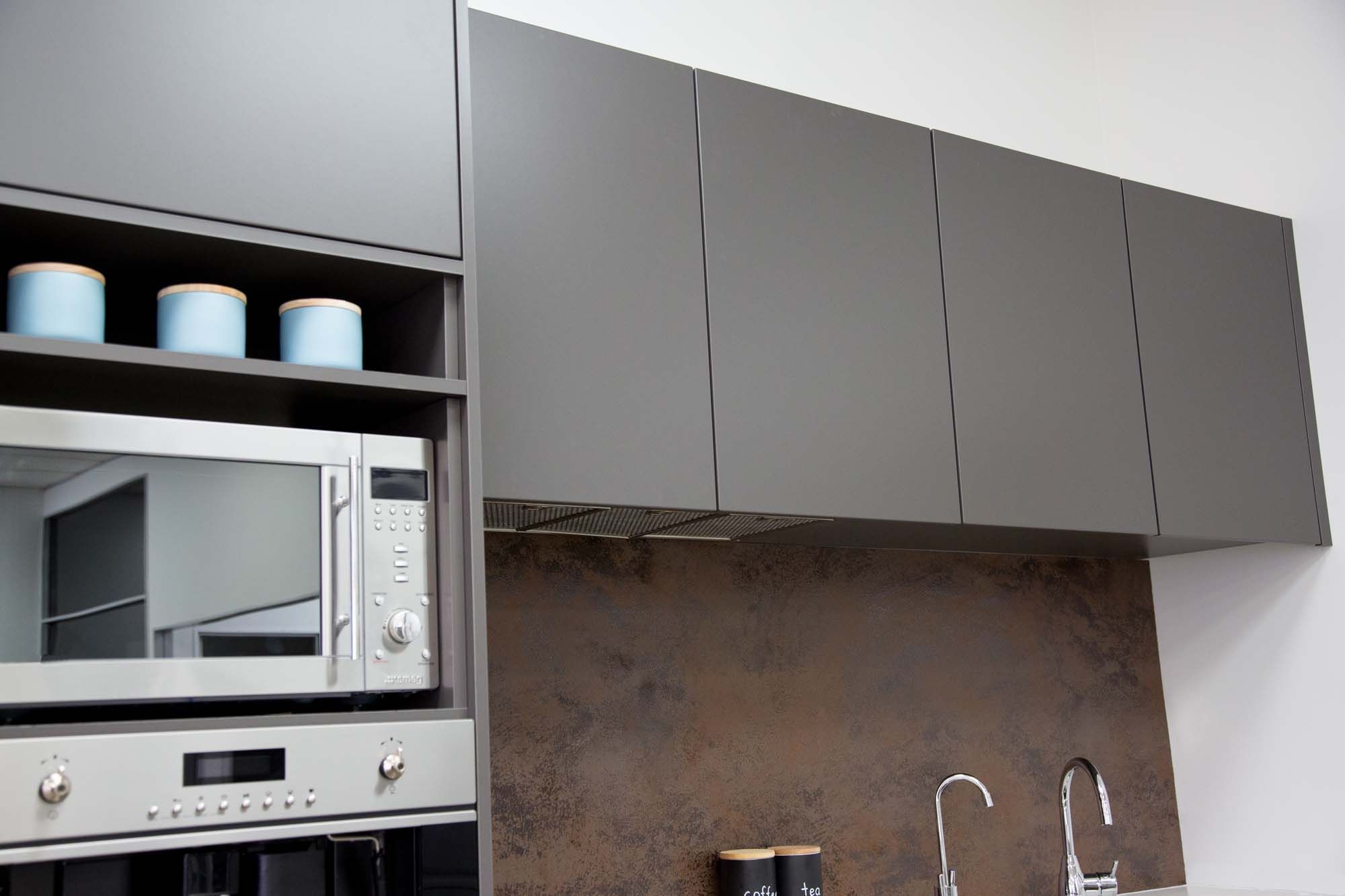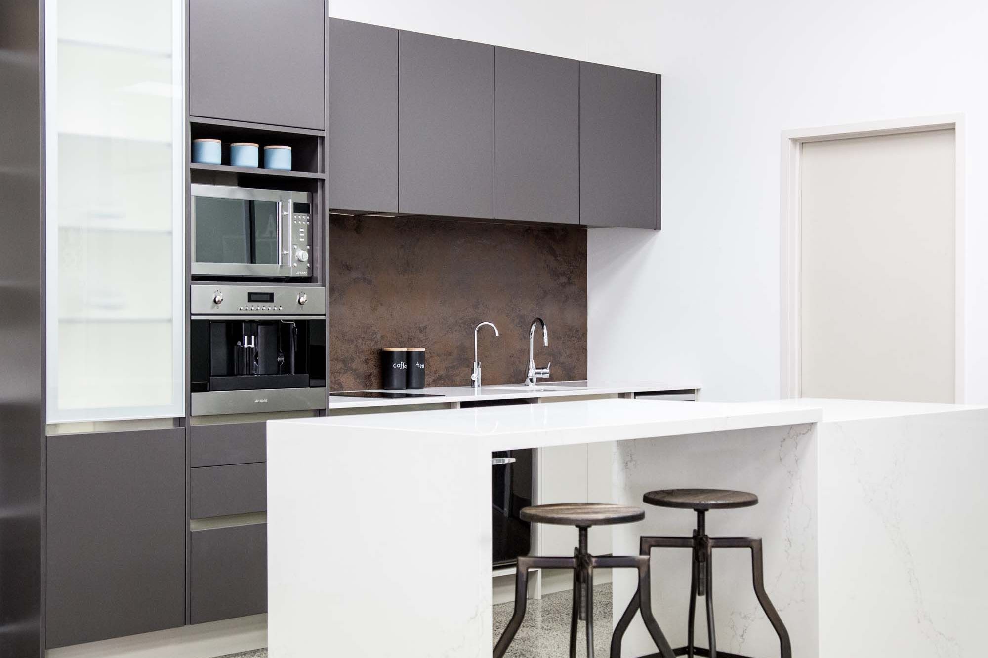 ArchiPro Project Summary - Moda Kitchens Showroom featuring Durostyle Lyell doors in Irish Crème and Wolfram Grey, designed to highlight an industrial-style kitchen, located in Mairangi Bay, Auckland.