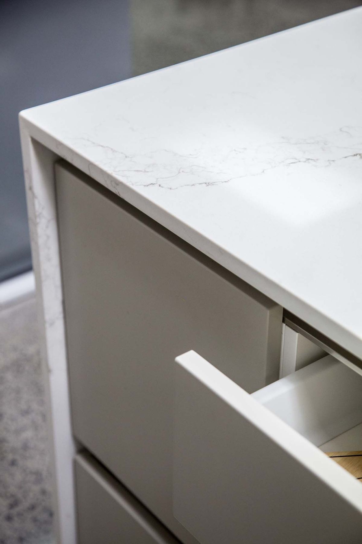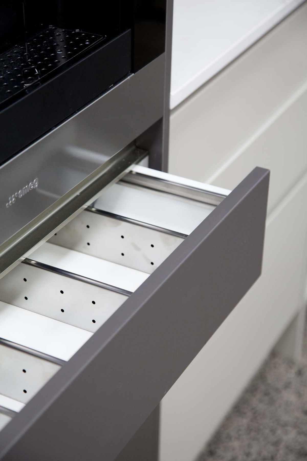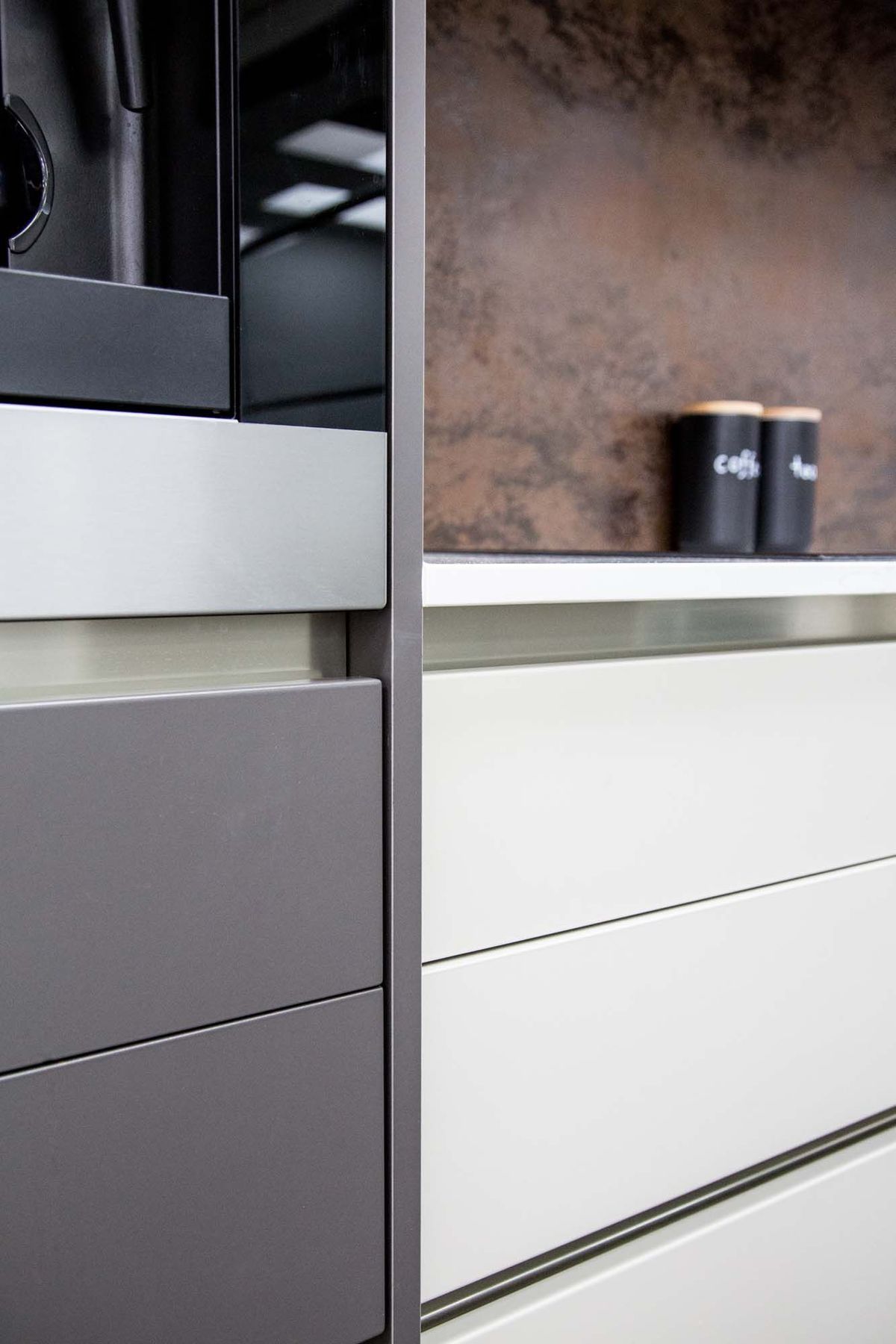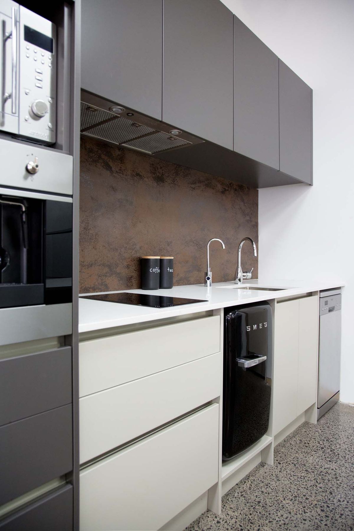 ArchiPro Project Summary - Moda Kitchens Showroom featuring Durostyle Lyell doors in Irish Crème and Wolfram Grey, designed to highlight an industrial-style kitchen, located in Mairangi Bay, Auckland.