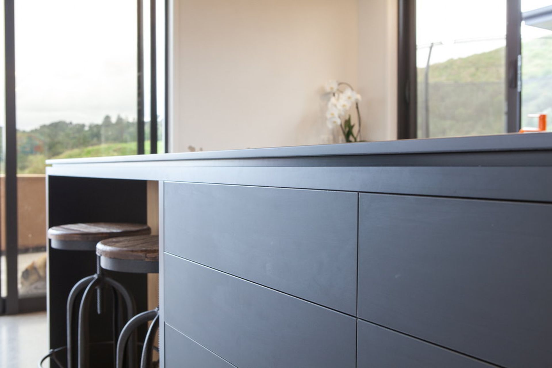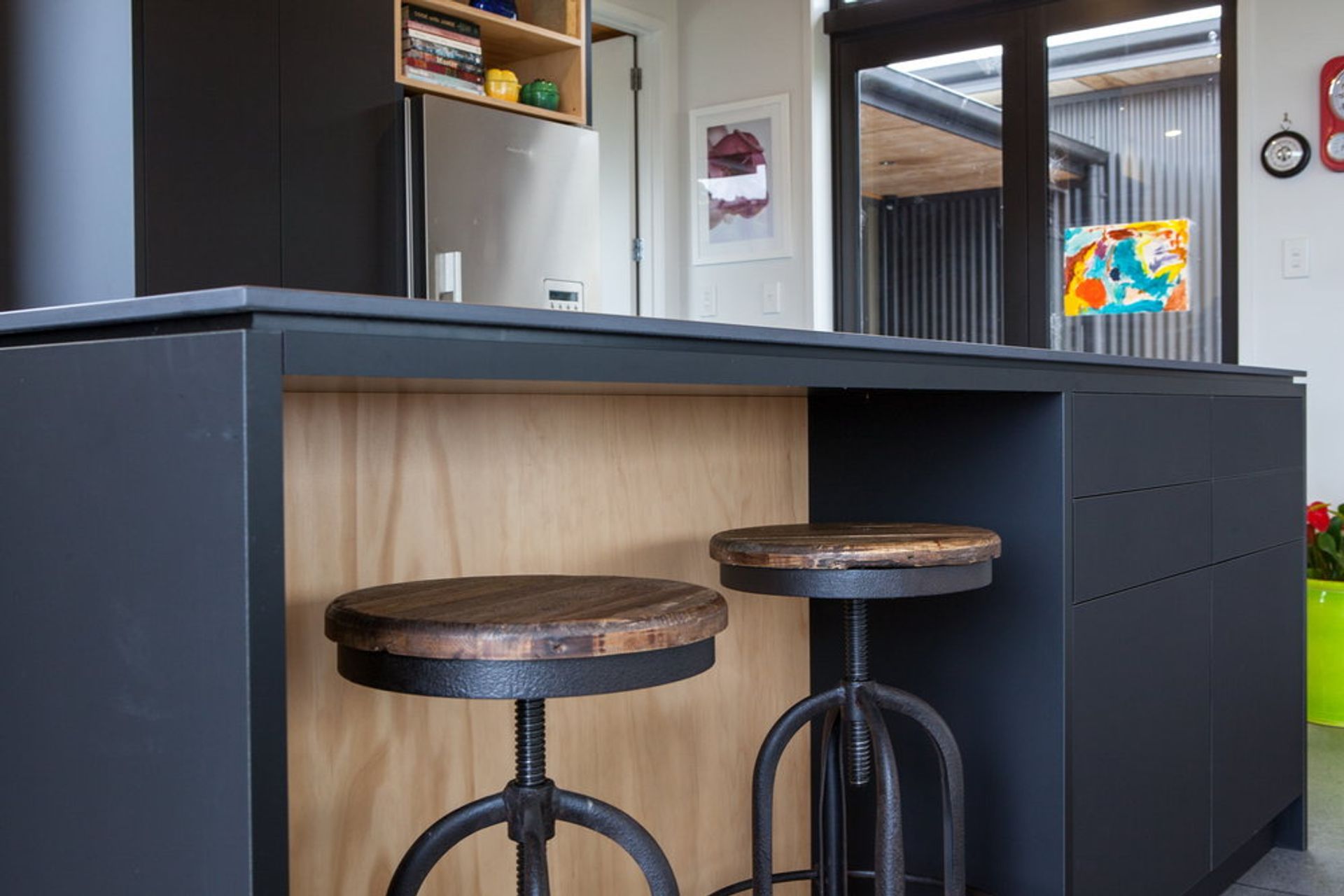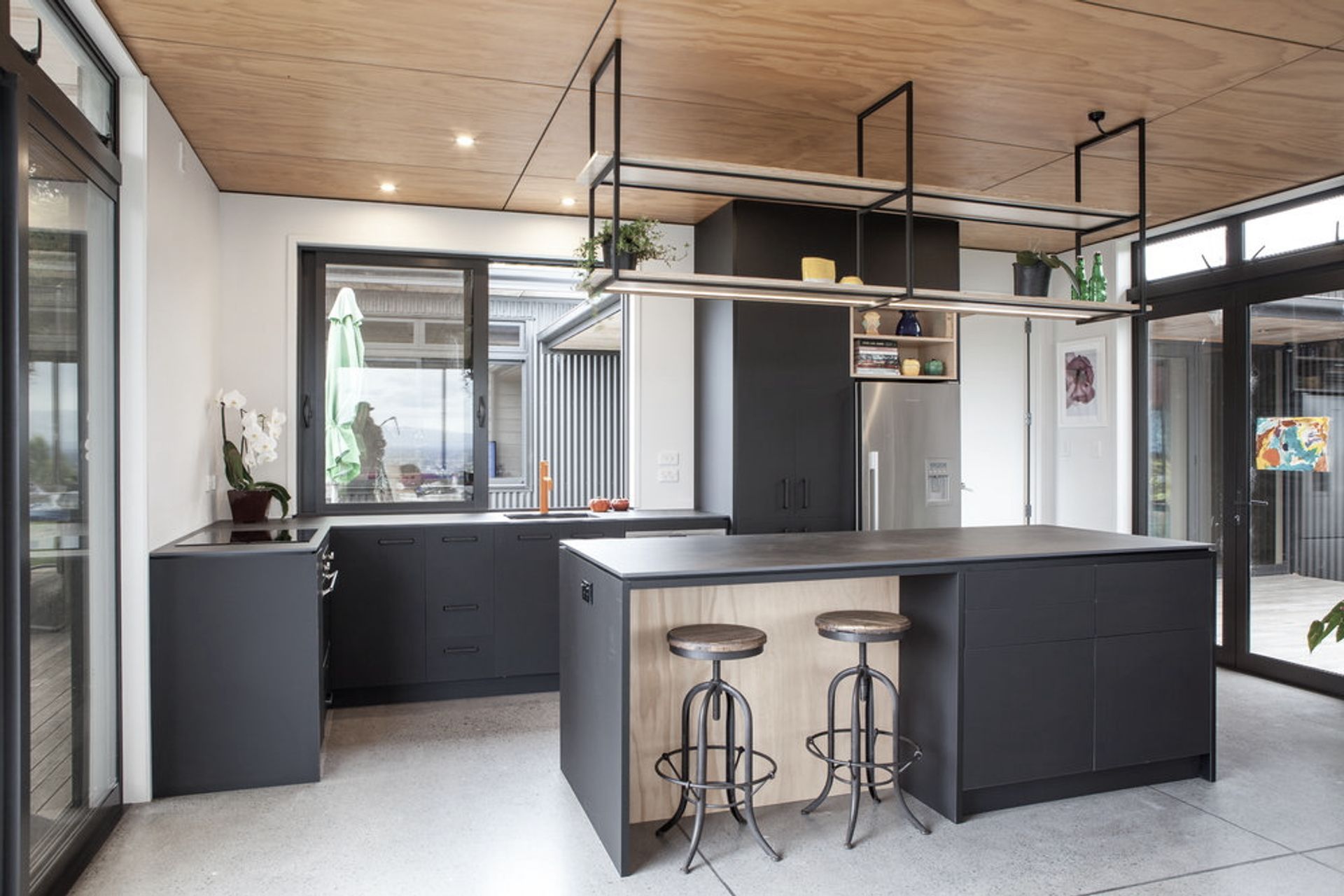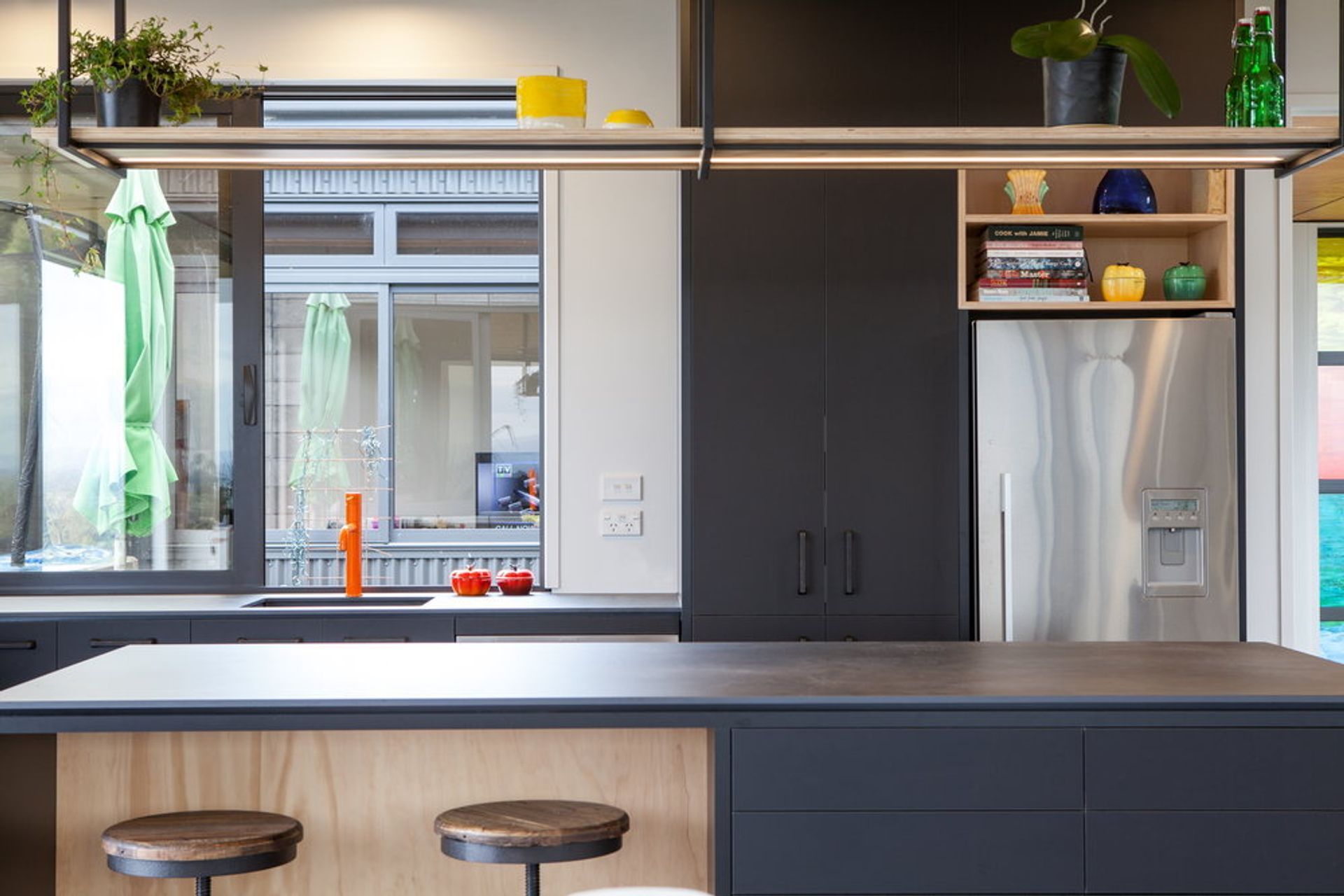 ArchiPro Project Summary - A modern contemporary kitchen featuring Prime Panels Black Soft Matt cladding and 12mm Laminam Ossido Nero bench tops, designed for functionality and style, seamlessly connecting to the lounge through a unique hanging steel frame.