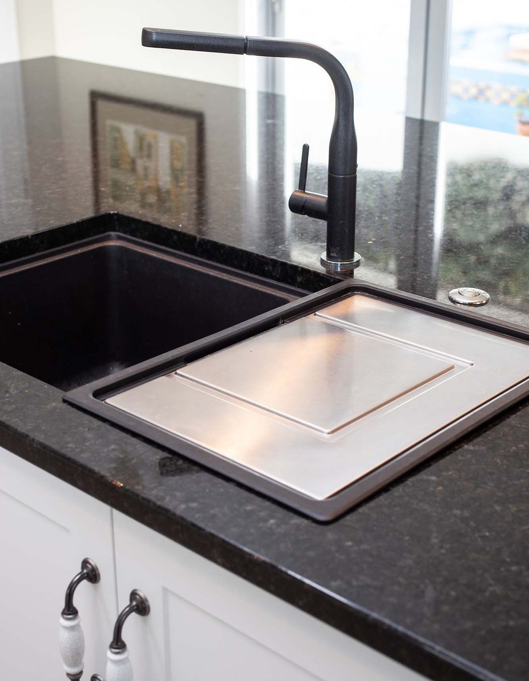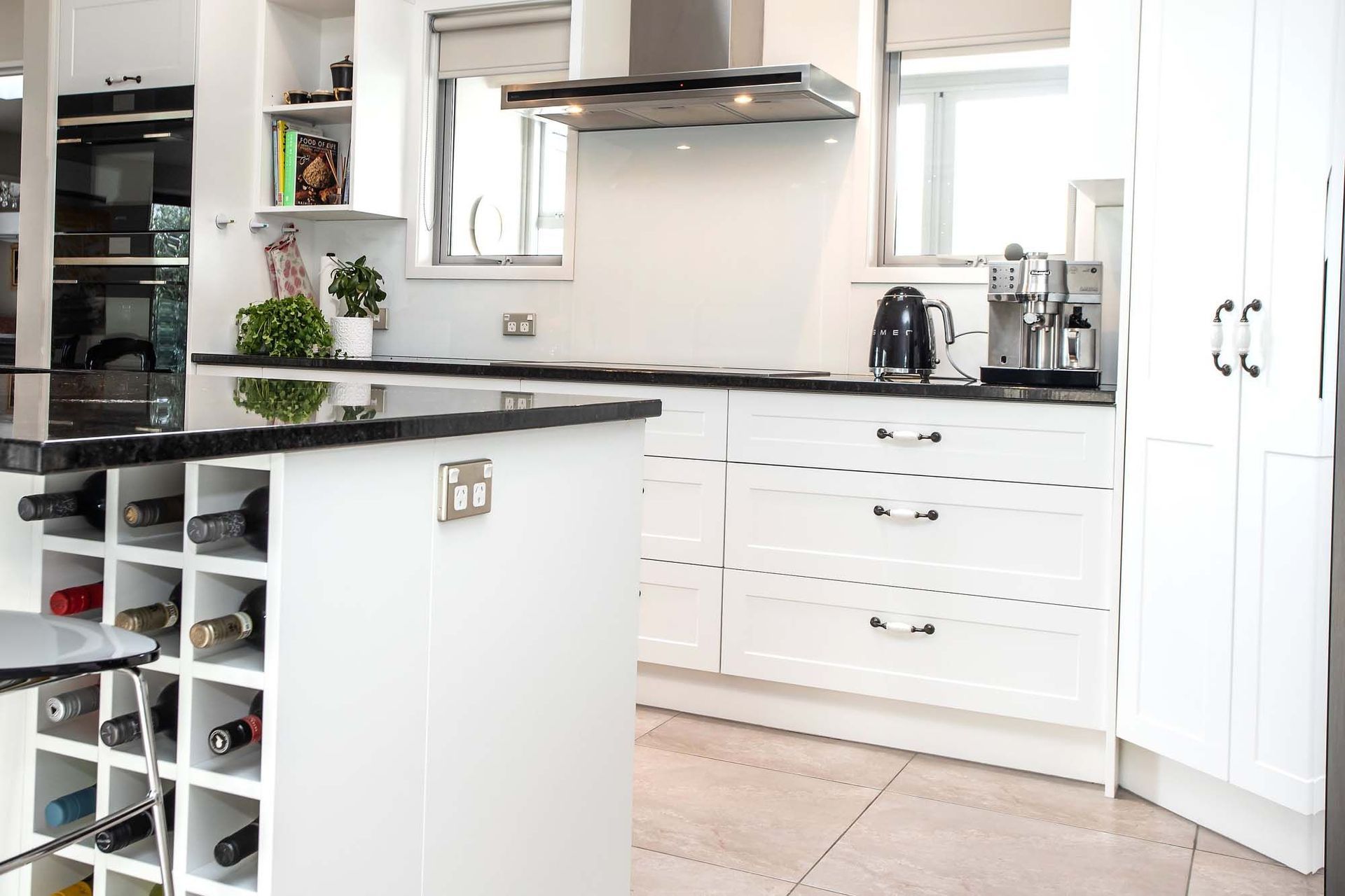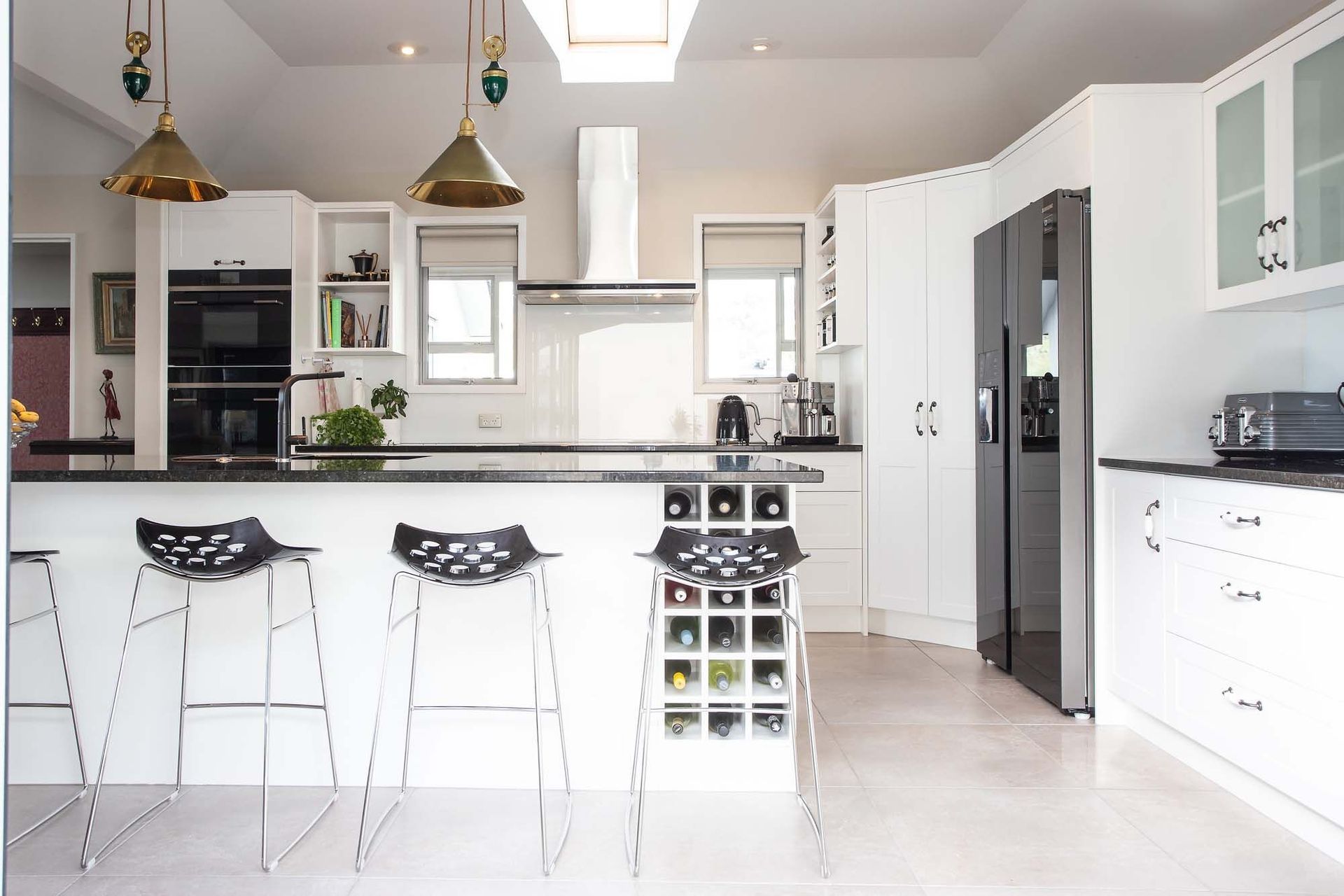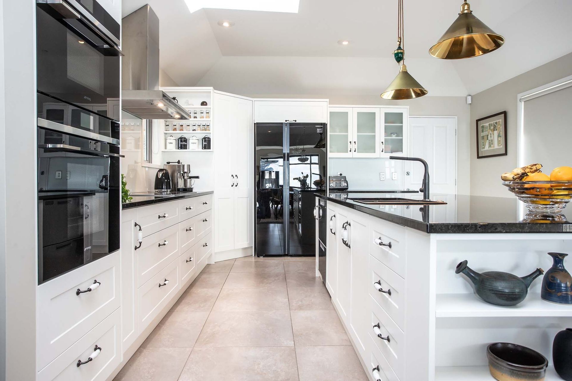 ArchiPro Project Summary - A harmonious blend of contemporary and country styles, featuring white cabinetry, black appliances, and gold accents in this stunning Modern Shaker Style Kitchen, designed and installed by Dream Doors Christchurch in Christchurch.
