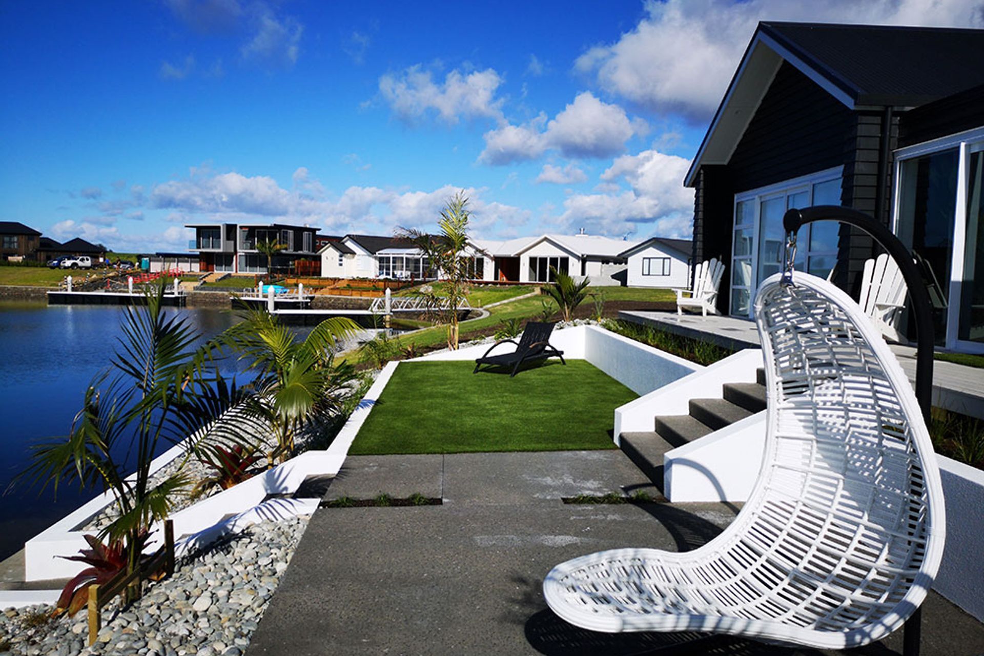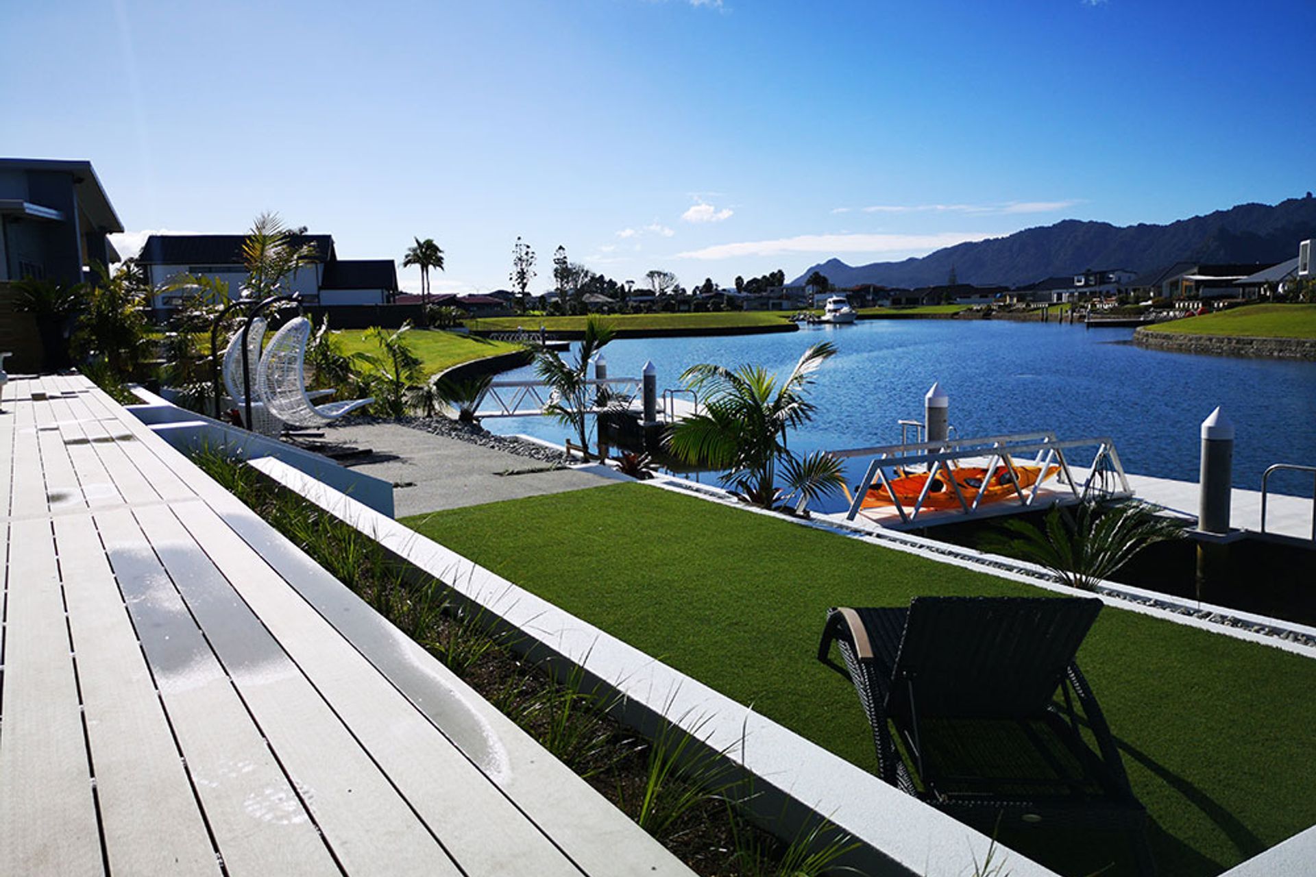ArchiPro Project Summary - A contemporary waterfront landscape in Northland, completed in 2018, featuring terraced spaces, a versatile outdoor area, and a harmonious blend of tropical planting that enhances the connection between the home and the marina.
