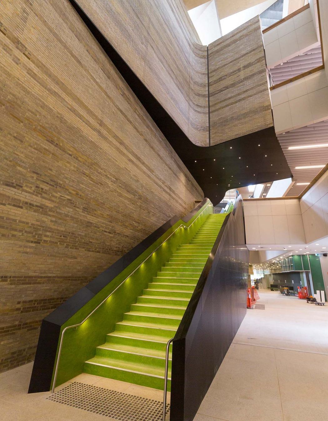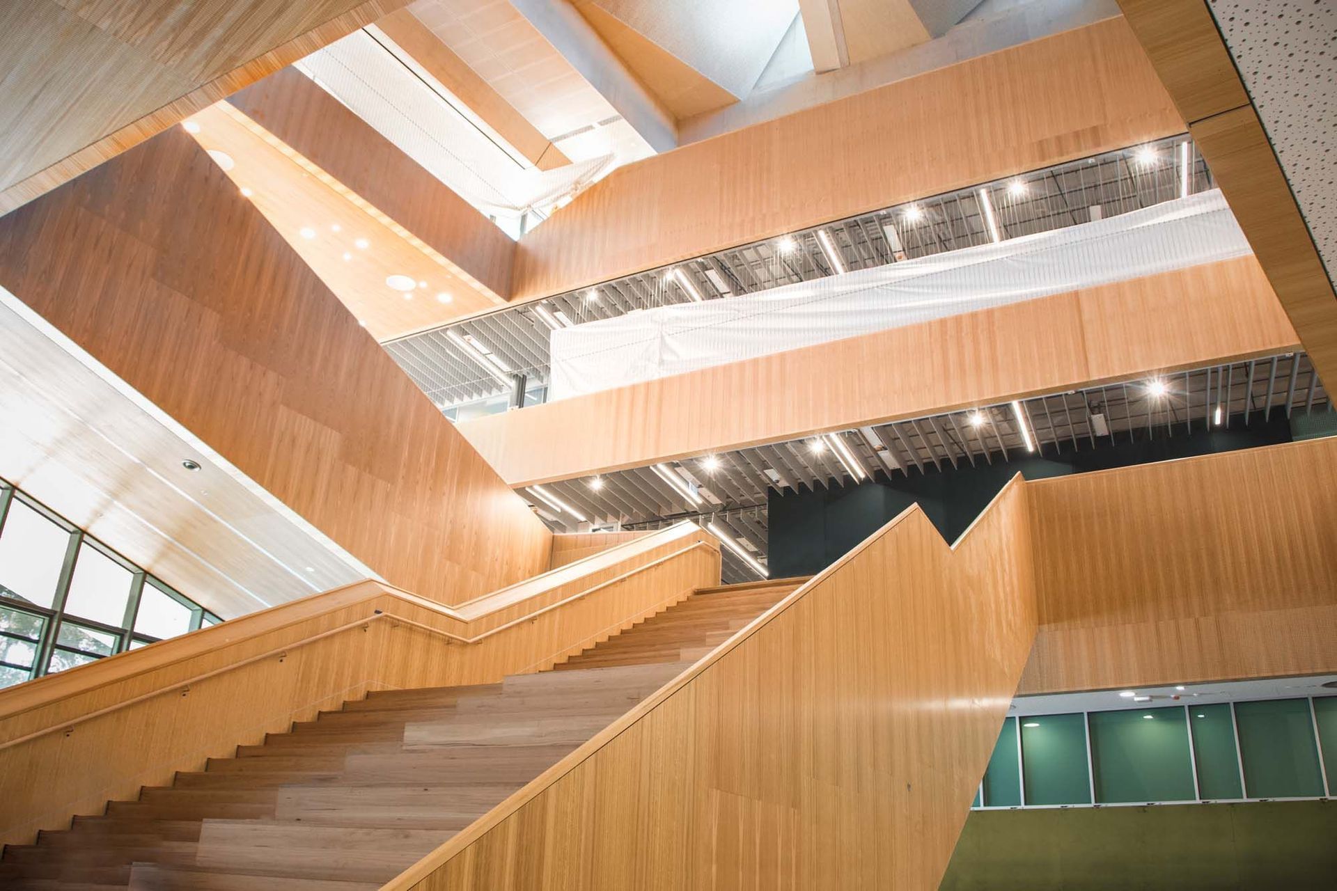 The staircases and balconies of the main atrium, supported by Studco steel framing systems, offer flexible study areas for students and have been designed to complement the 18-tonne free-spaning timber pods on the ceiling. This required structural rigidity to ensure the weight of the timber could be held by the Studco Steel Stud and Concealed Ceiling Systems.