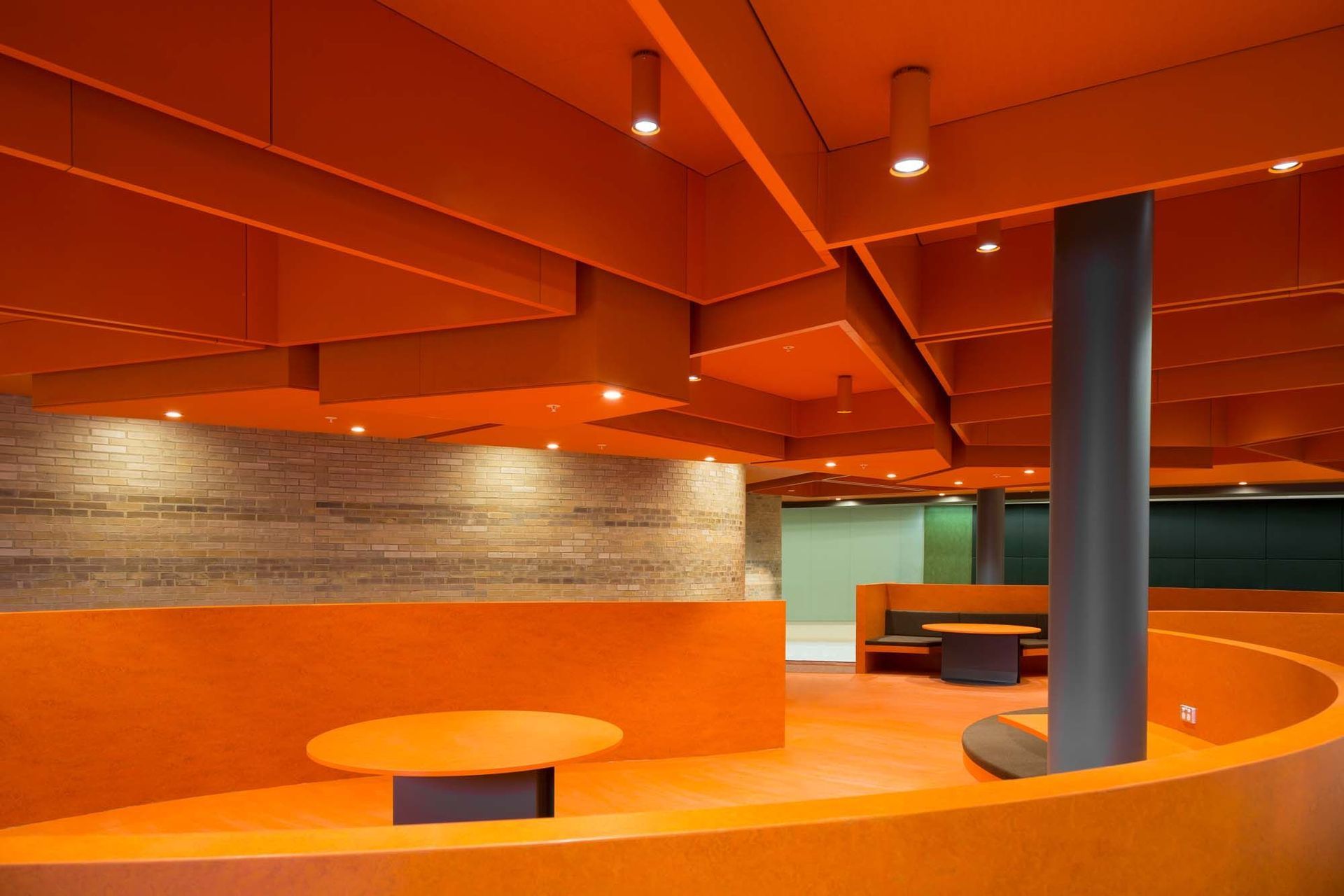 Under the curved wall in the main atrium is a cozy sunken lounge, where students can study, relax, or just enjoy the building’s architecture from a central vantage point of the building. Supporting the five-tonne ceiling fixture, the concealed ceiling framing was designed to hold up a 20mm plywood substrate, additional acoustic baffles and comply to a stringent fire compliancy. Studco technical team worked tirelessly to redesign the concealed ceiling to fit the requirements of the demanding load, collaborating with baffle installers Jacaranda, to ensure all aspects of the ceiling worked harmoniously.