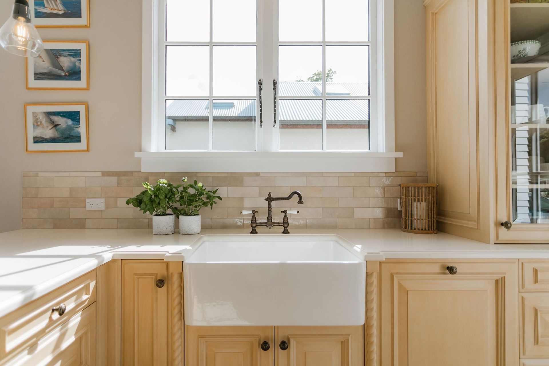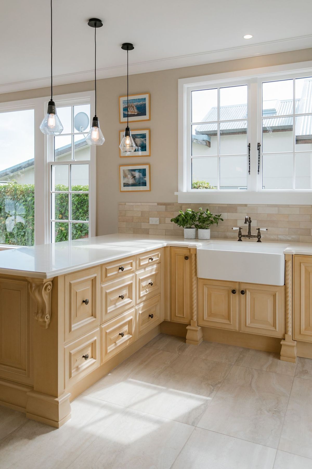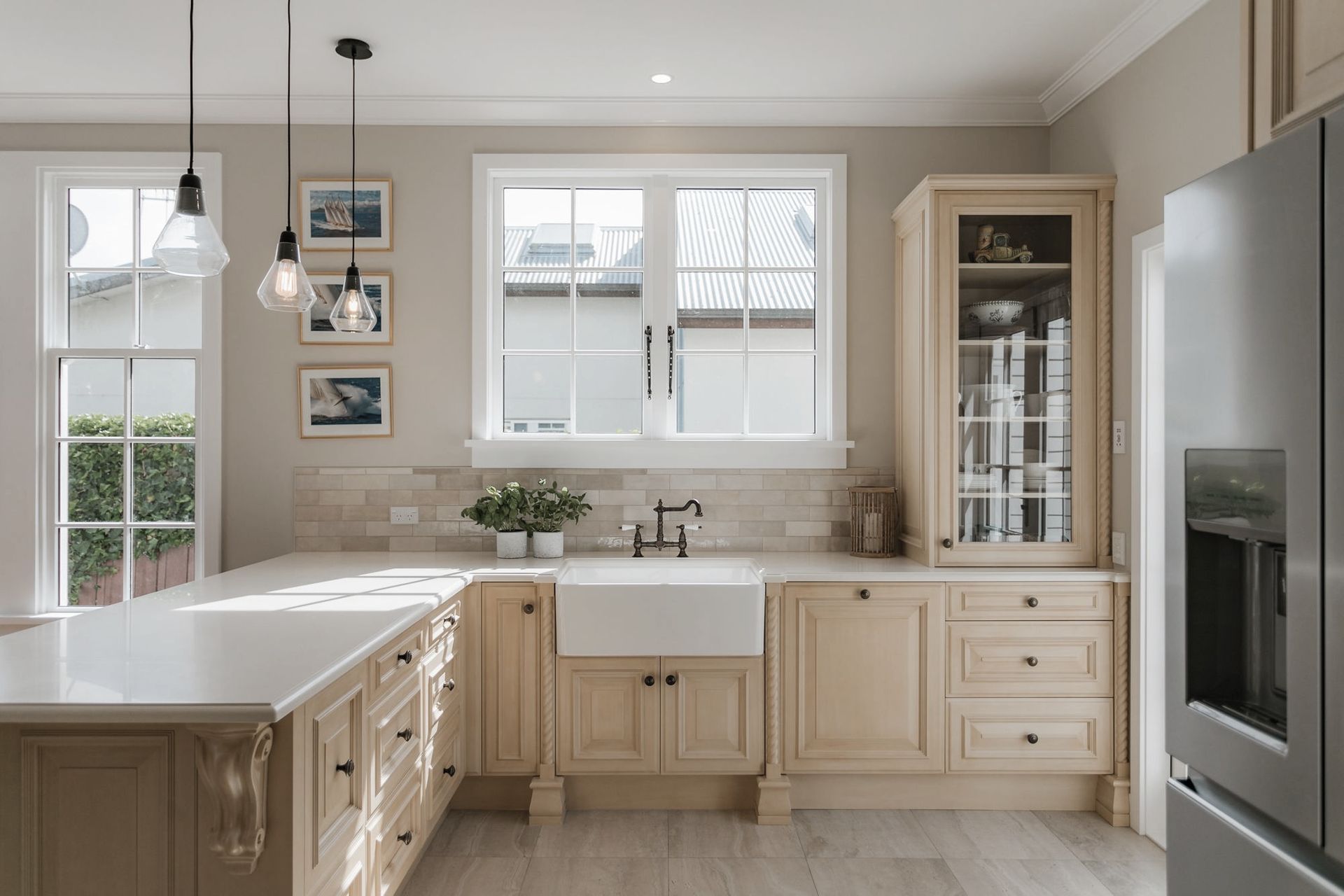 ArchiPro Project Summary - A meticulously restored classic kitchen, originally from America, reimagined for a 100+-year-old New Zealand home, blending intricate detailing with modern functionality while preserving its antique charm.