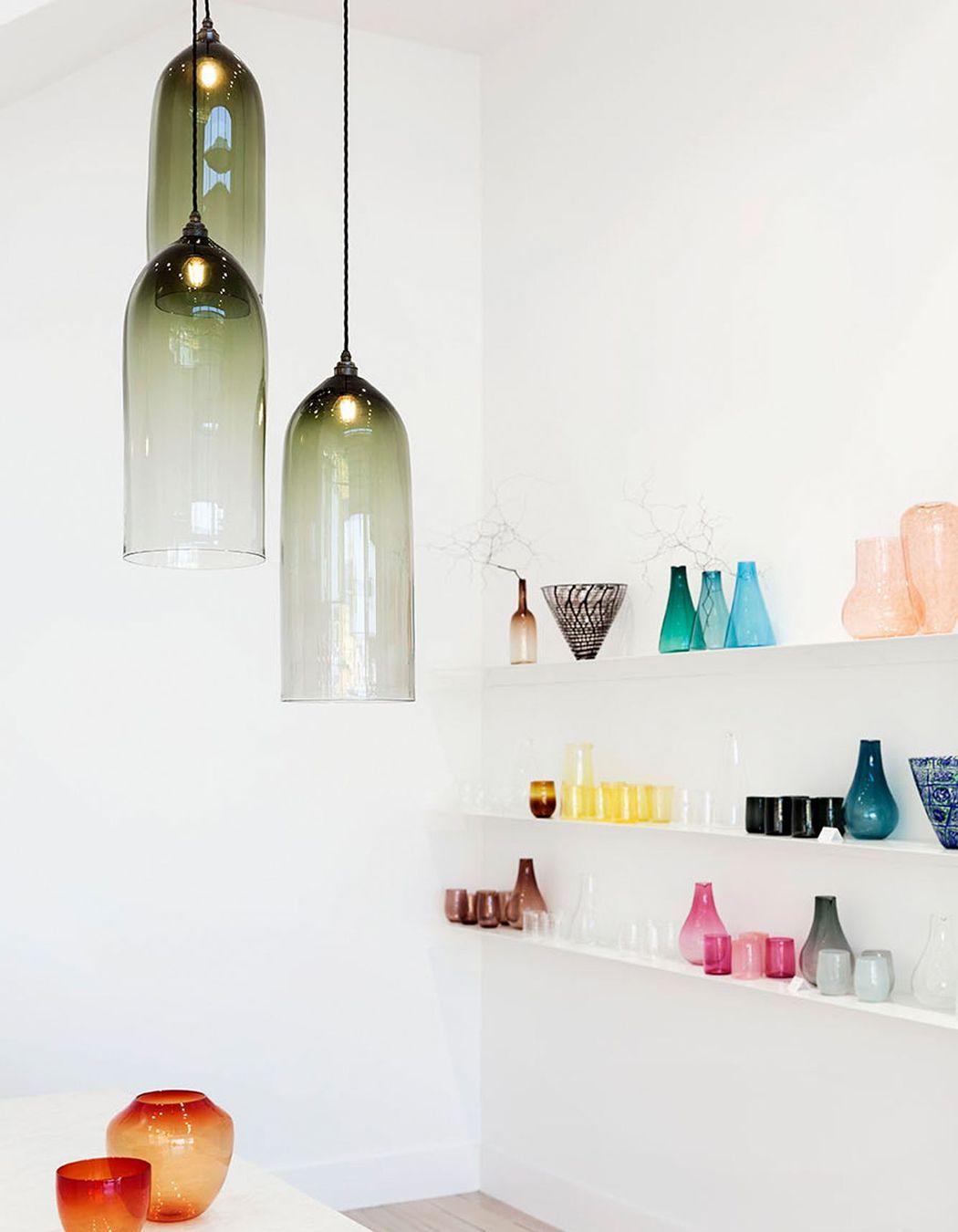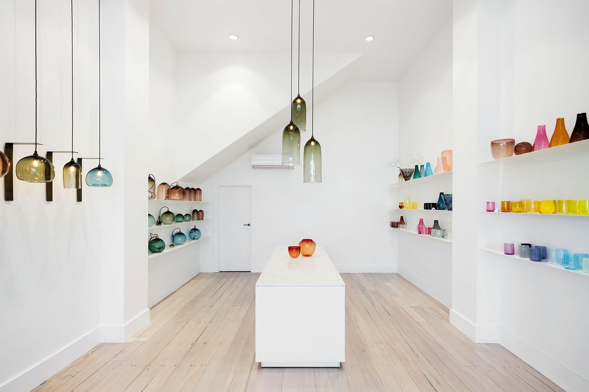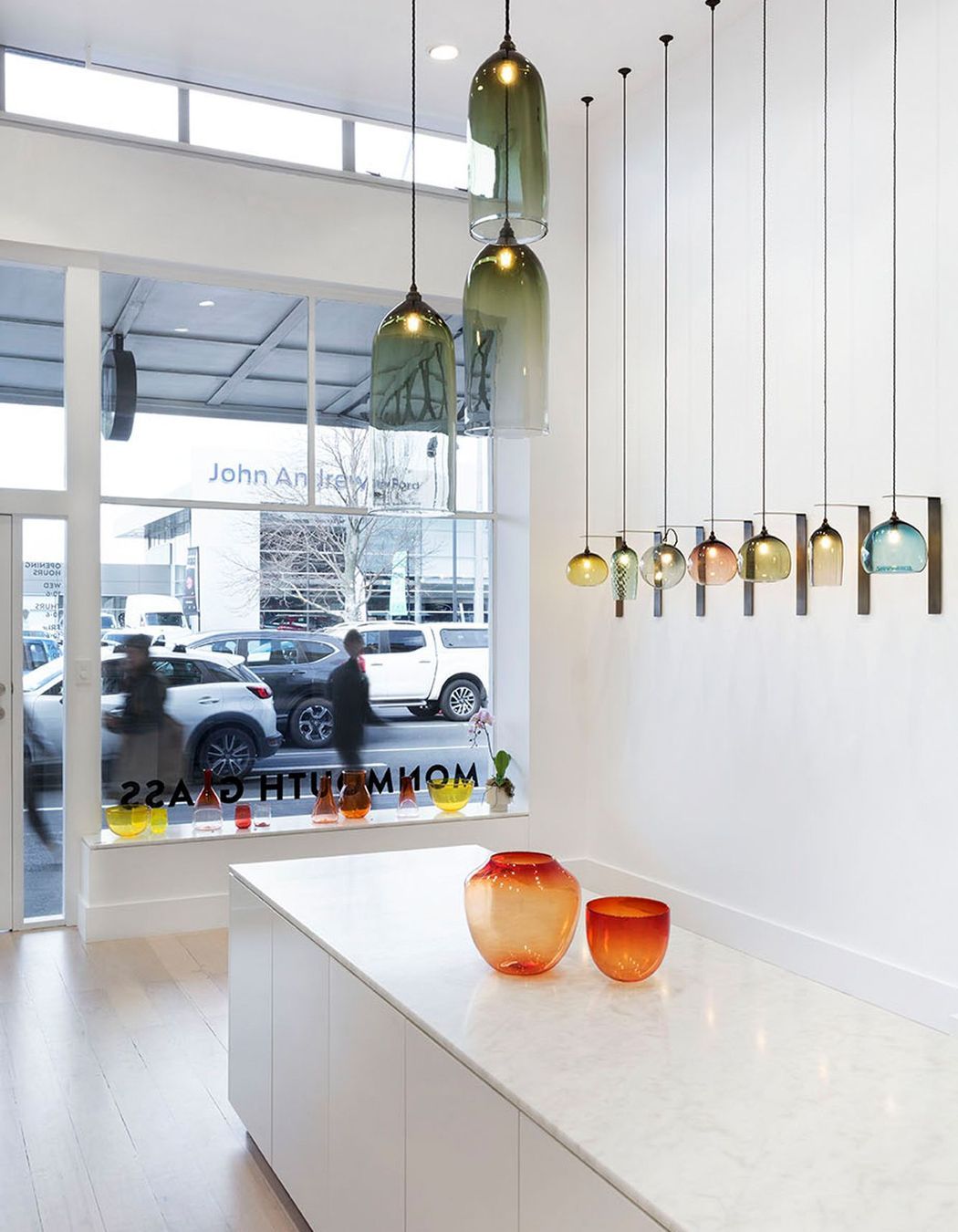 ArchiPro Project Summary - Monmouth Glass Studio features a gallery-inspired design that highlights vibrant colored glass within a spacious, high-ceilinged environment, creating an inviting atmosphere for customers.