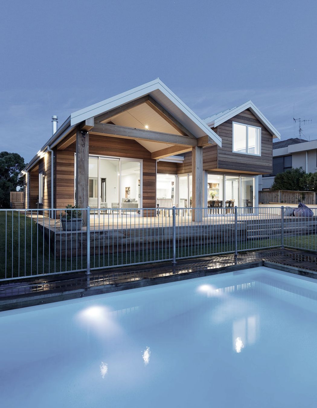 ArchiPro Project Summary - Mount House 3 features a modern design with a wooden exterior, inviting porch, and luxurious swimming pool, showcasing innovative craftsmanship.