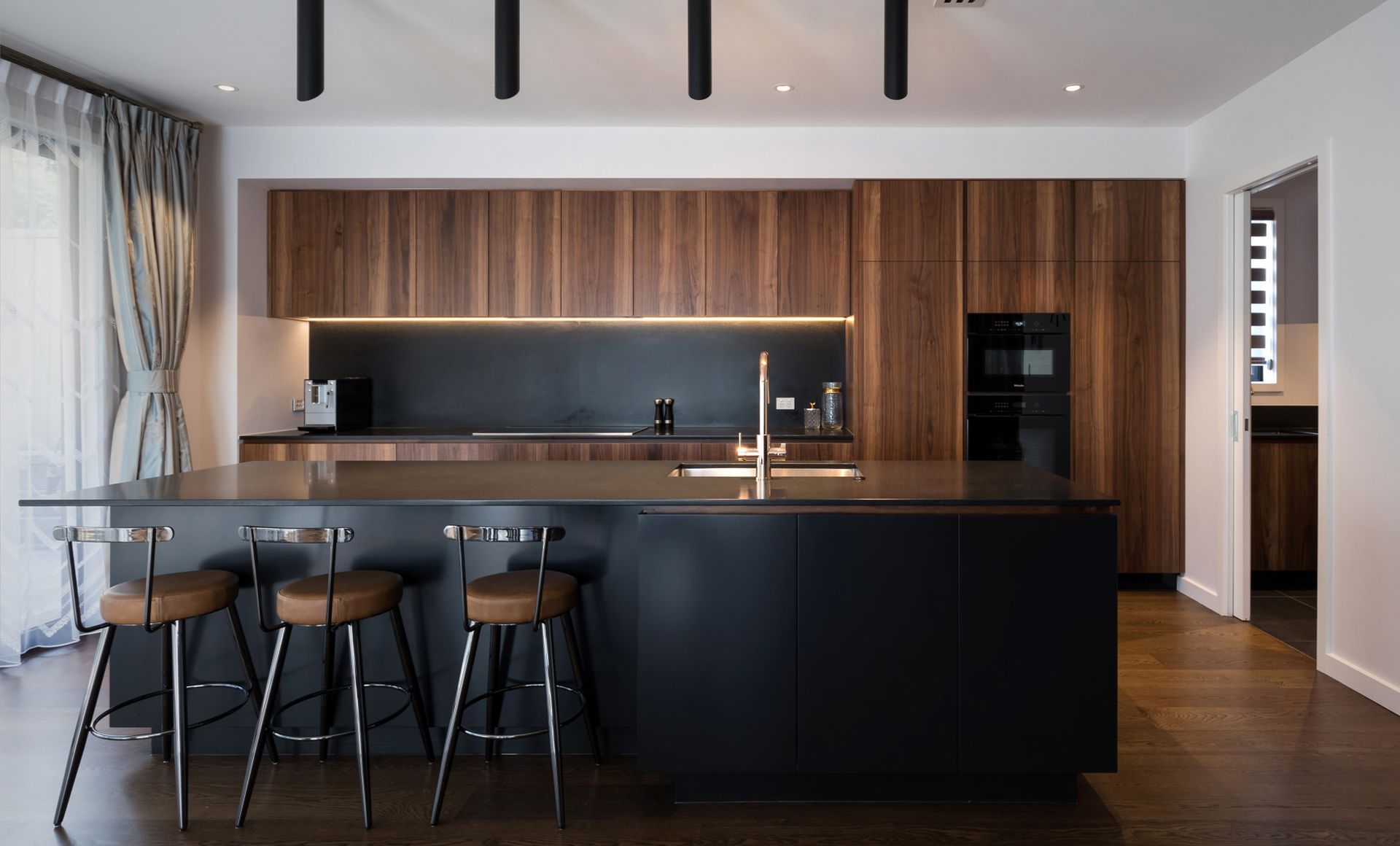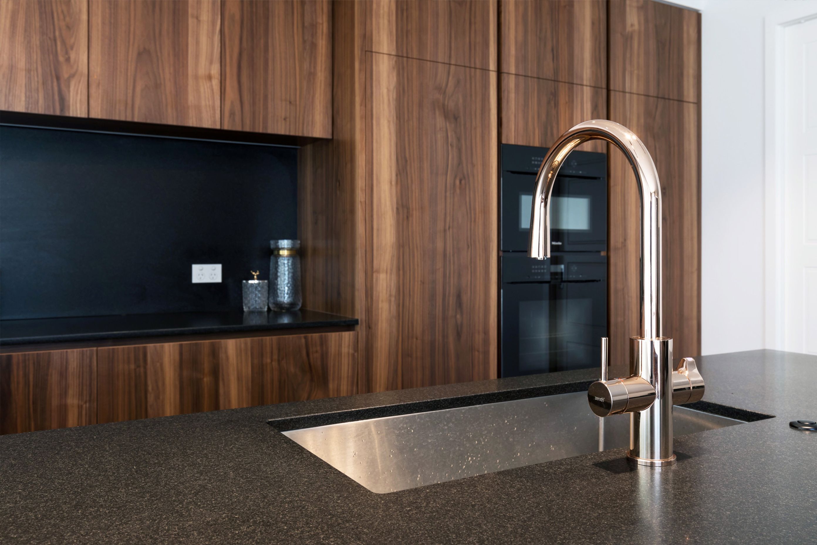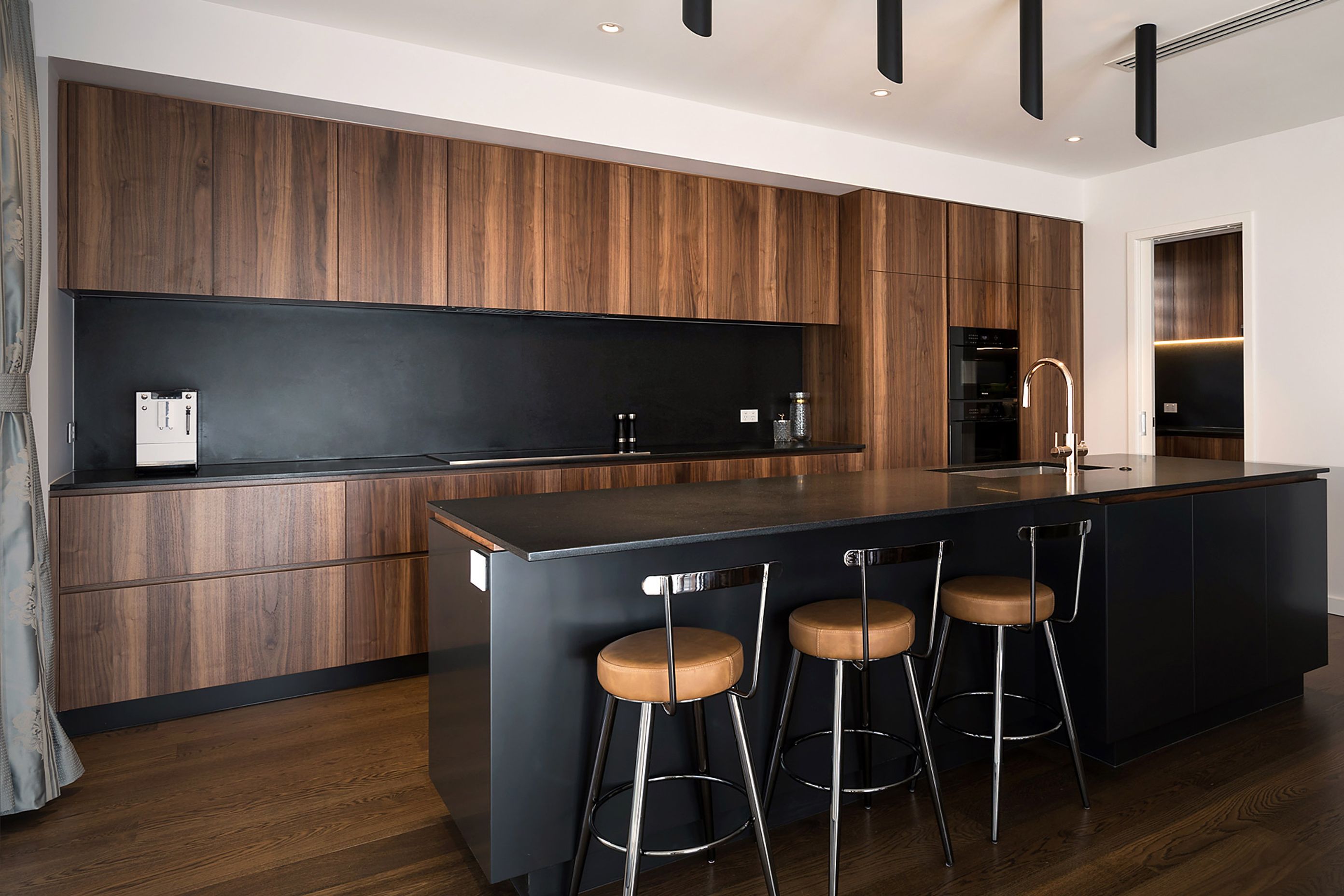 ArchiPro Project Summary - A luxurious kitchen design by Wayne Church featuring rich planked walnut cabinetry, sleek black granite surfaces, and high-end Miele appliances, creating a minimalist yet sophisticated culinary space.