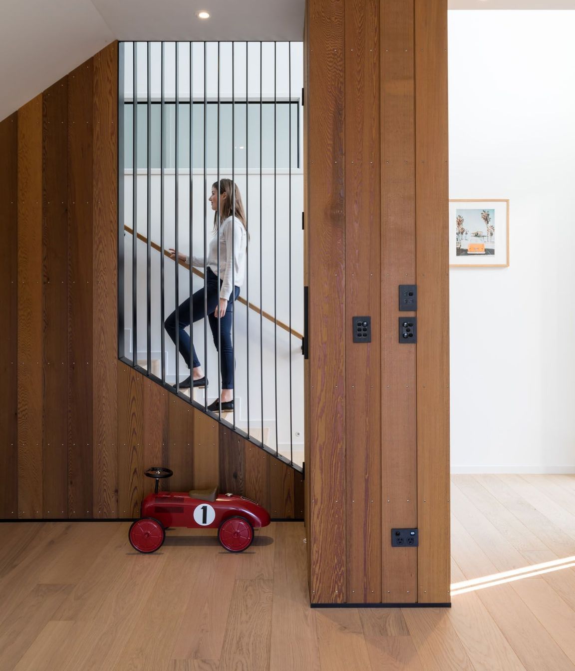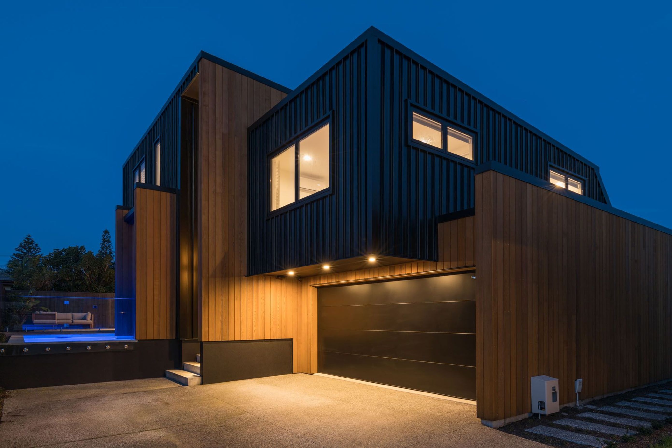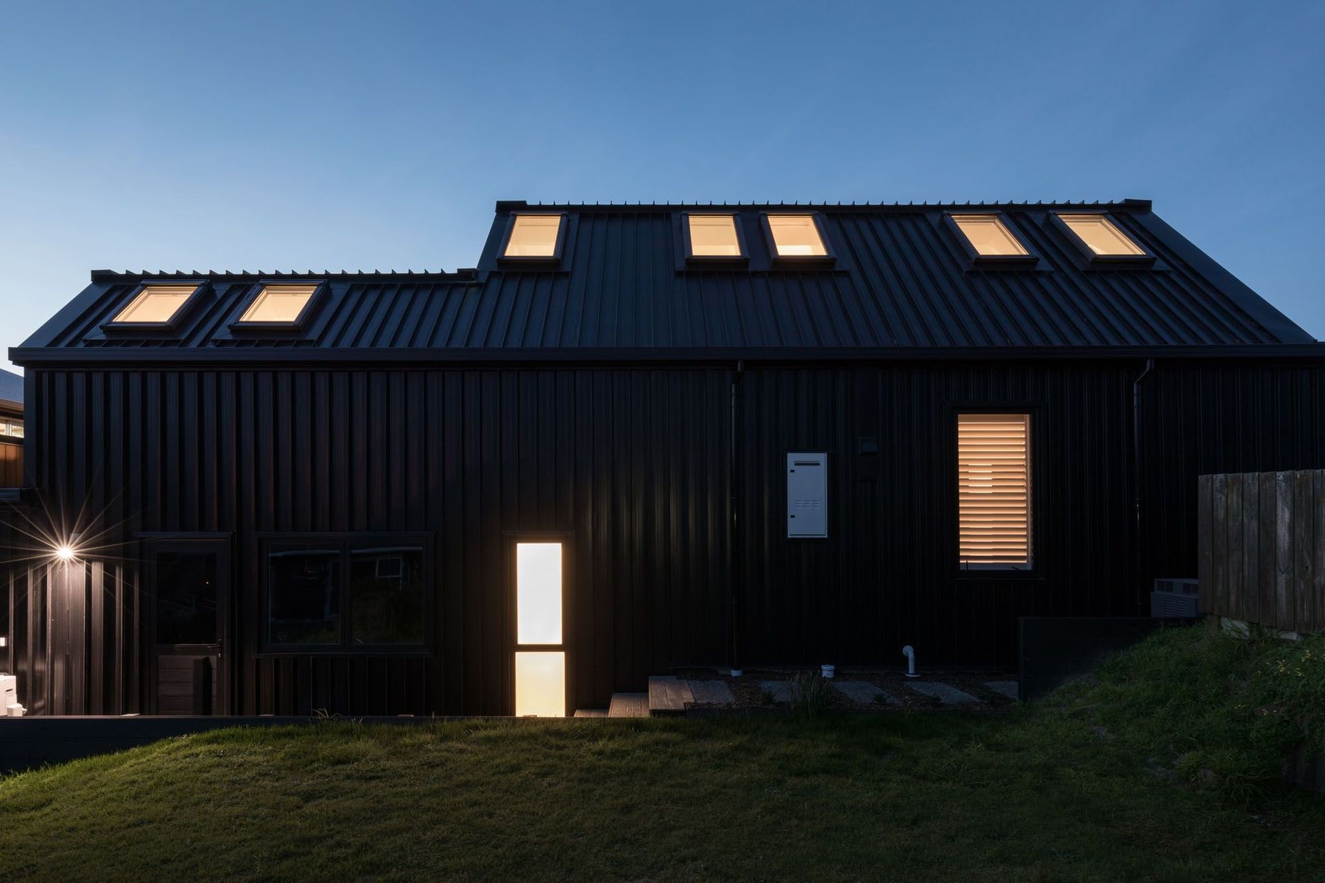 ArchiPro Project Summary - A striking family home in Mount Maunganui, featuring bold black steel cladding, innovative split-level design, and seamless indoor-outdoor connectivity, all while embracing its coastal environment and ensuring low maintenance for a busy family.