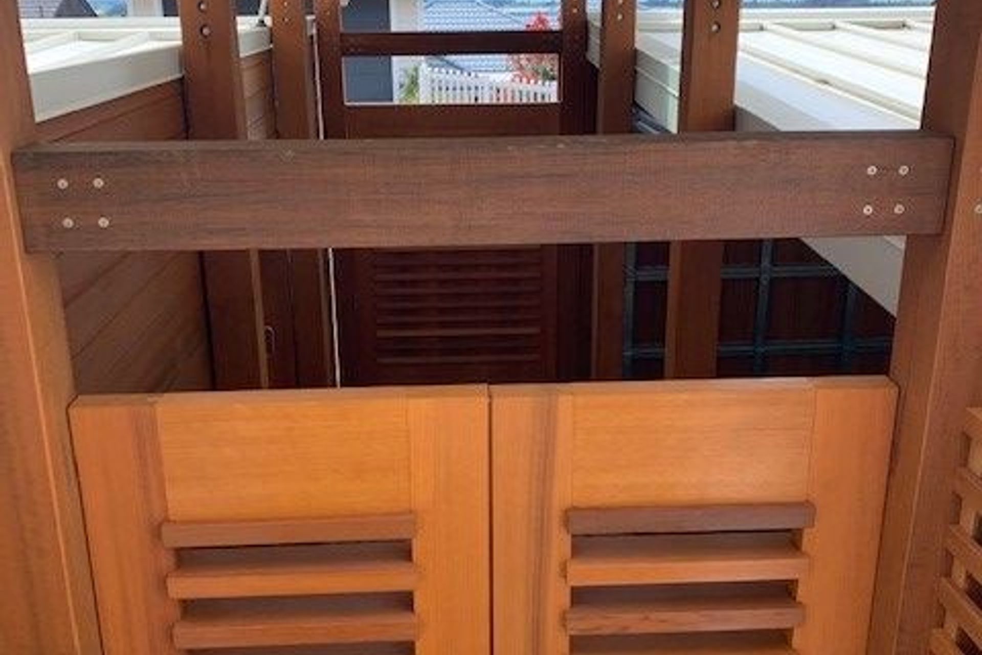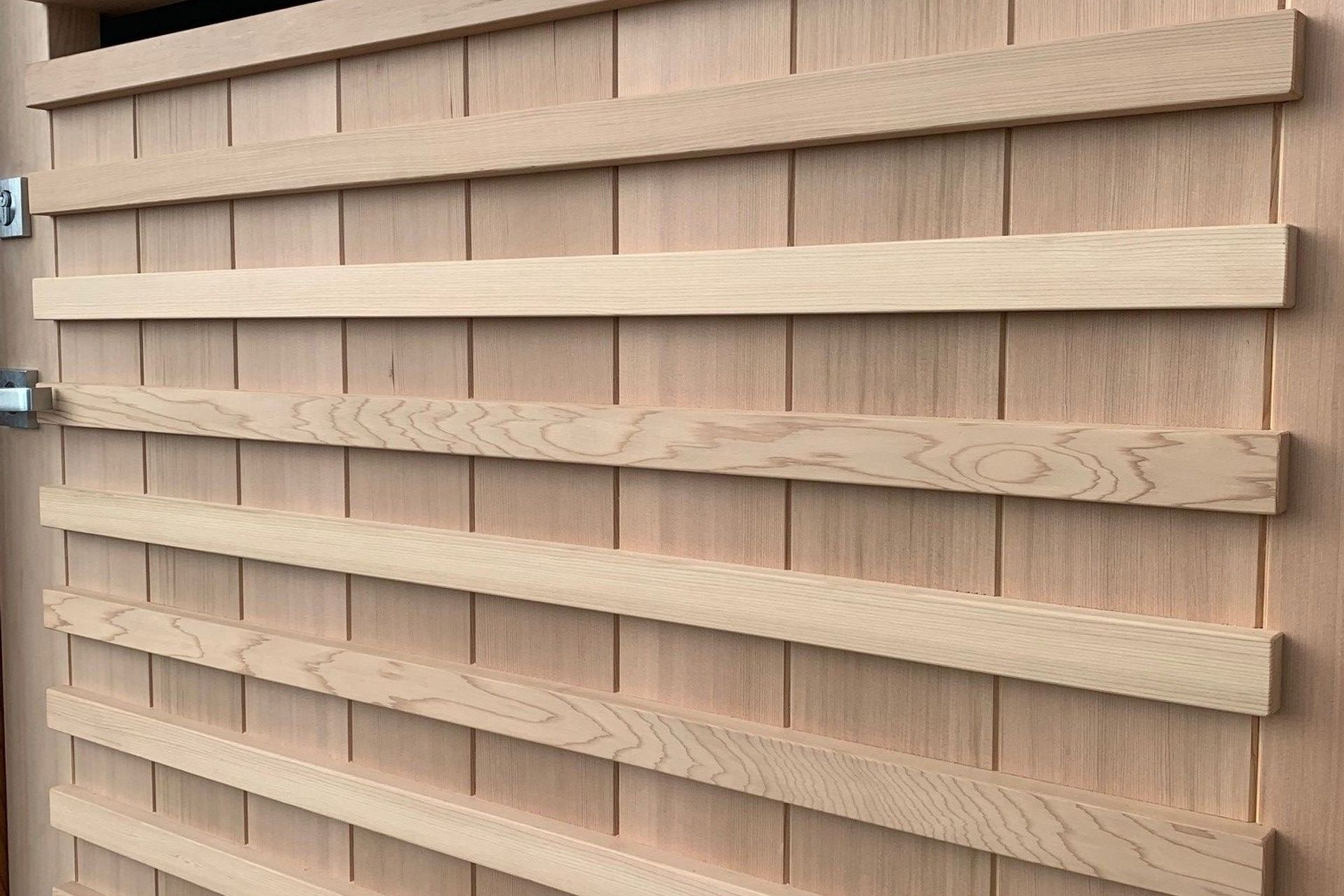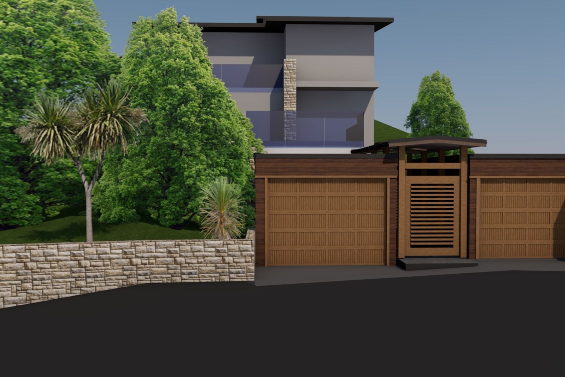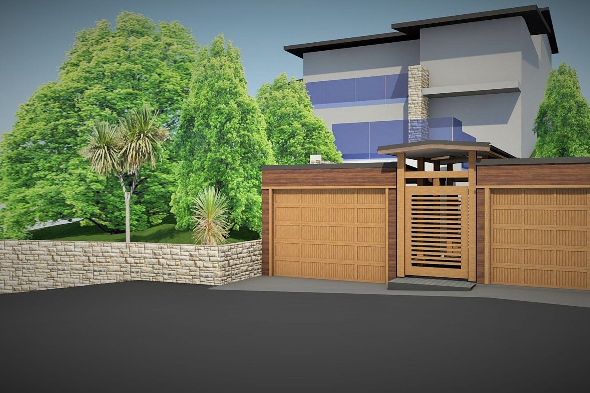 ArchiPro Project Summary - Elegant double car cedar garage and secure entranceway designed by Orbit Architecture, featuring custom-built garage doors by JD Doors and a smartly tiled entrance with a security system by Christchurch Electrical.