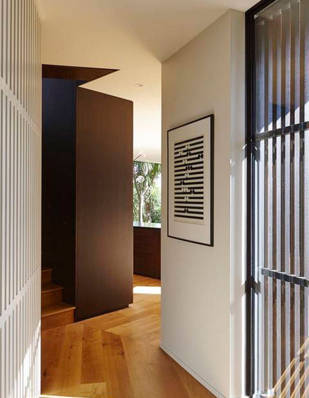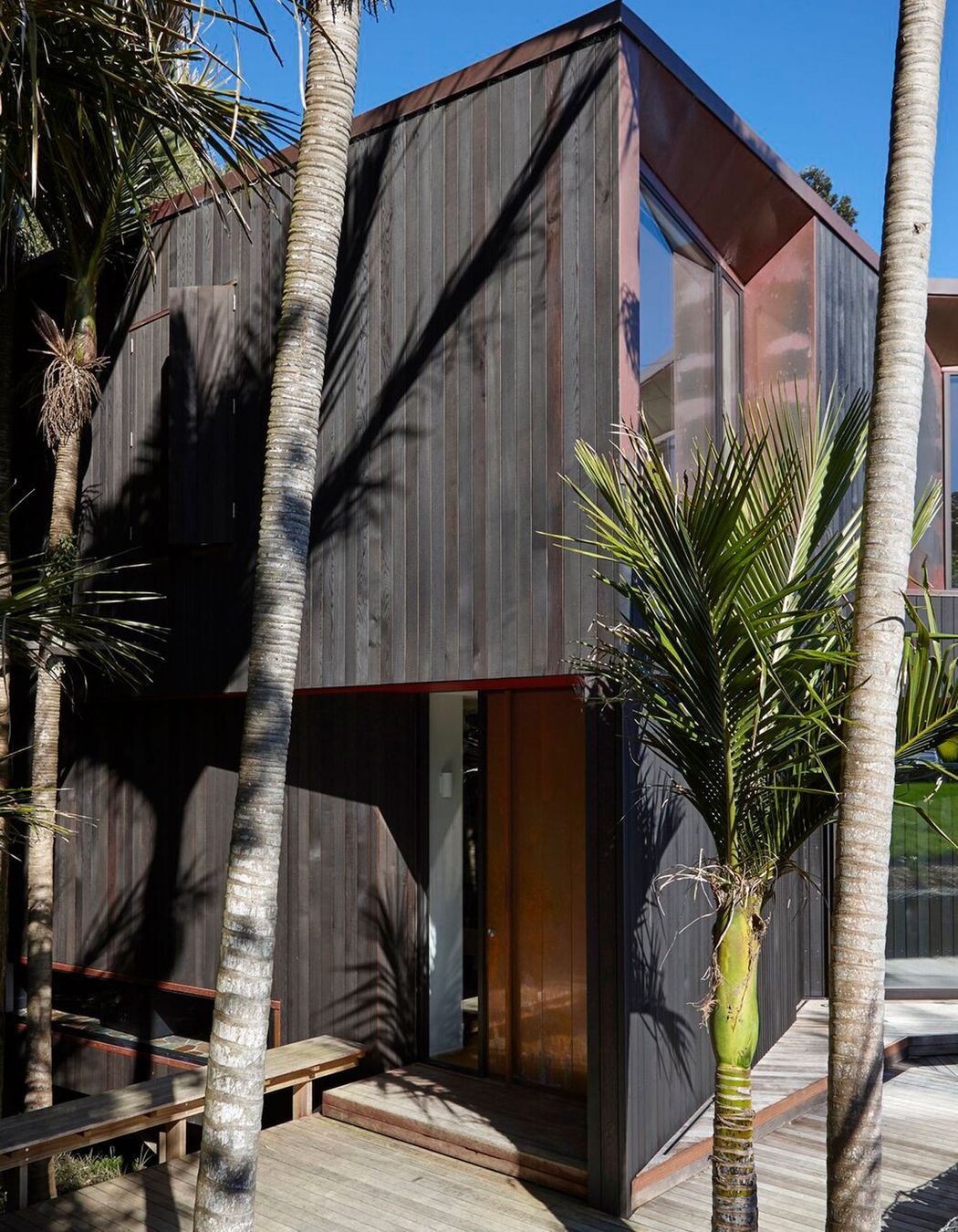 ArchiPro Project Summary - Family home nestled among nikau palms at Muriwai beach, featuring distinctive splayed windows and unique building lines, designed in collaboration with Herbst Architects.
