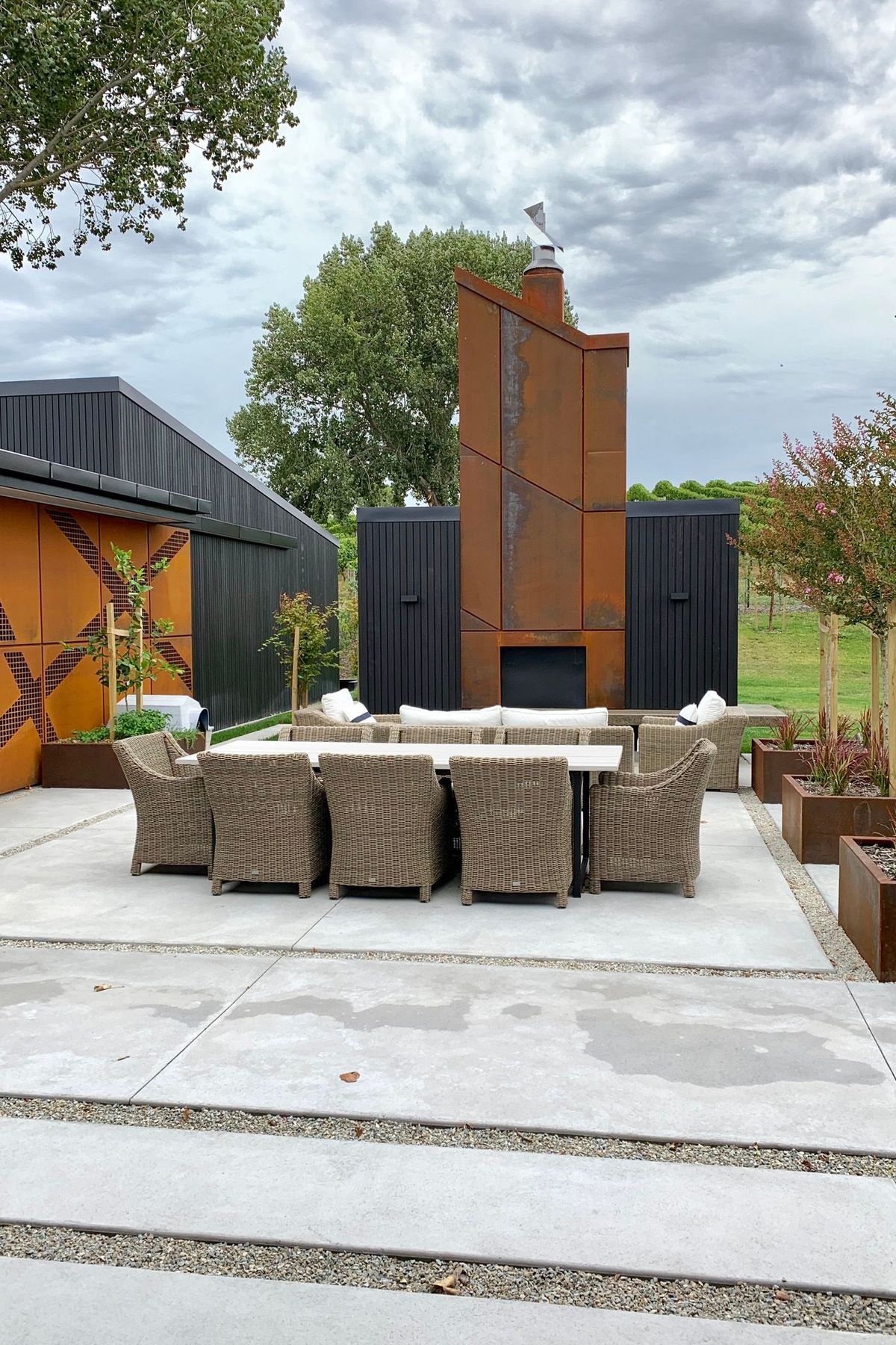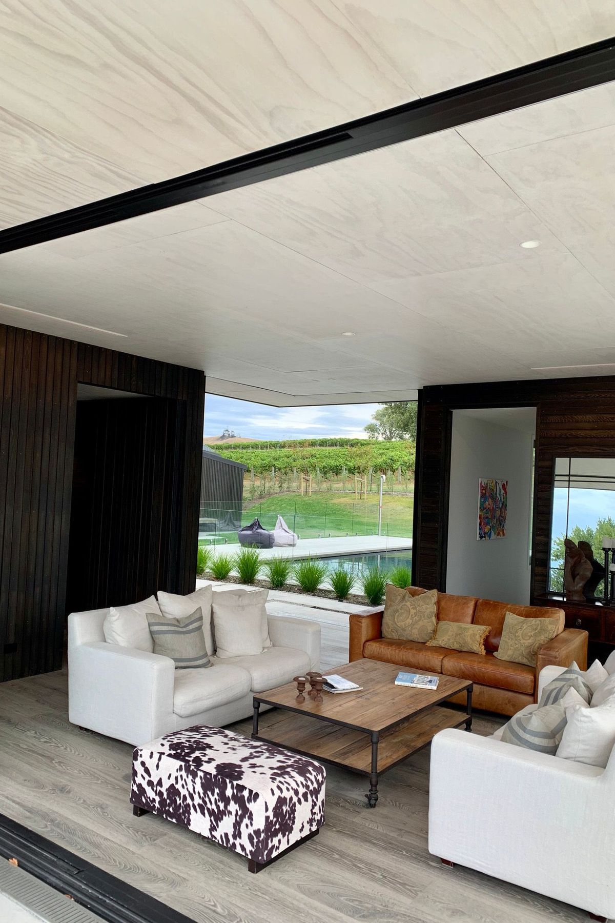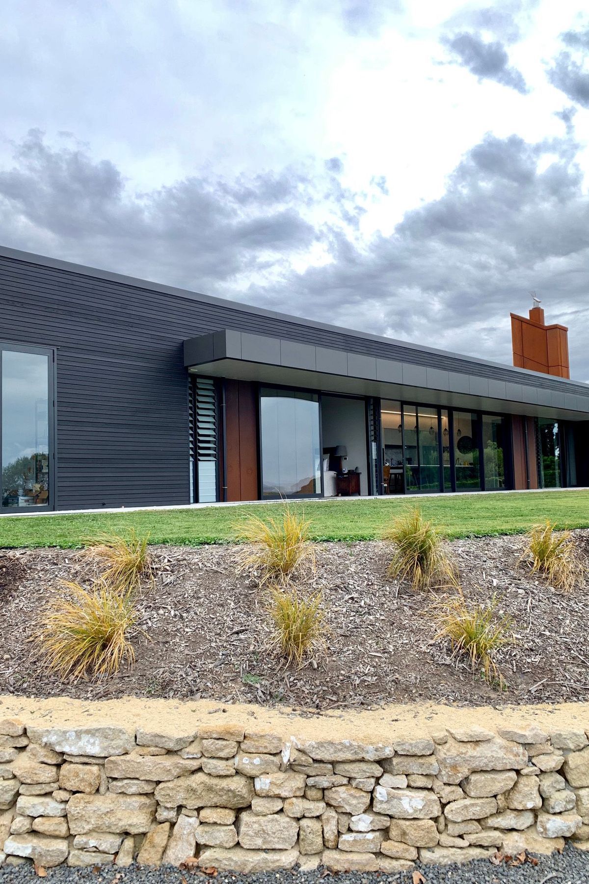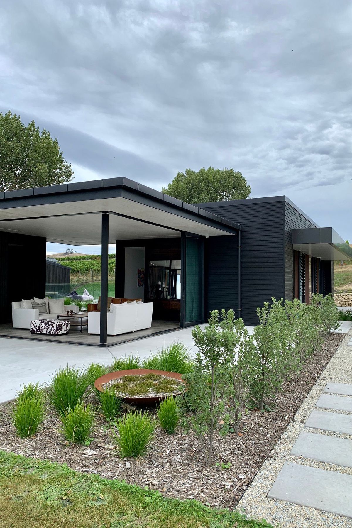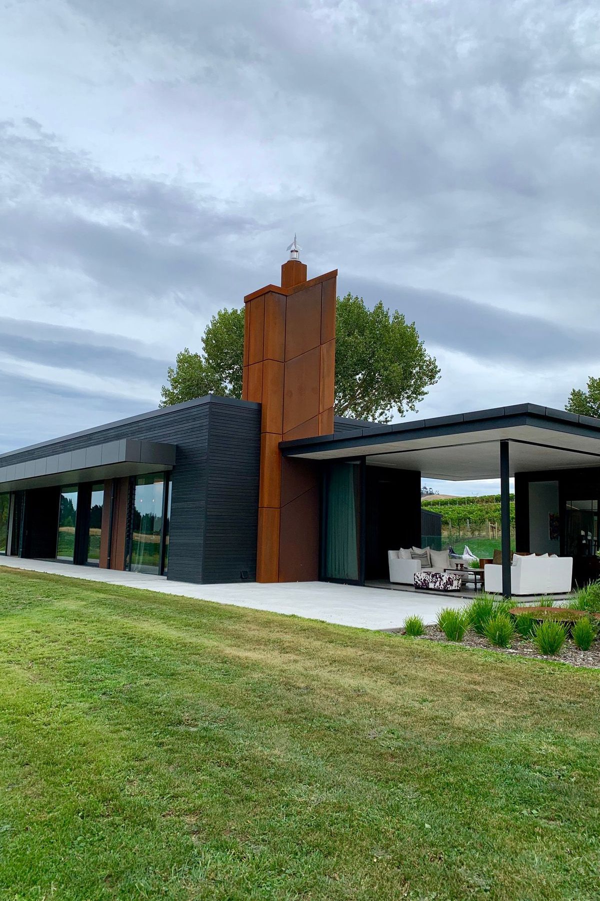ArchiPro Project Summary - Award-winning modern home in rural Napier, featuring cedar and Corten steel cladding, four bedrooms, four bathrooms, and expansive views of the east coast and local vineyards, designed around a central courtyard for seamless indoor-outdoor living.
