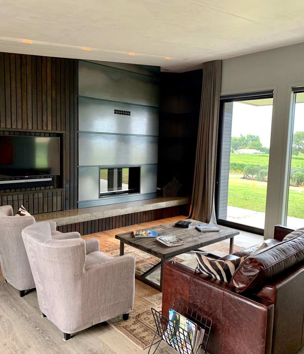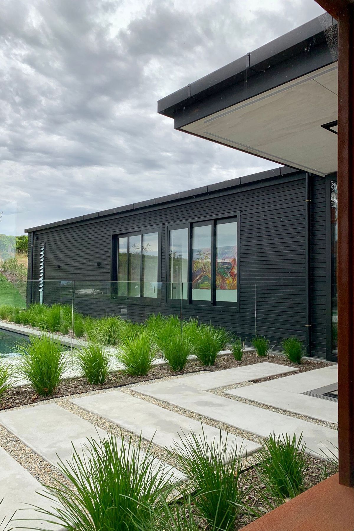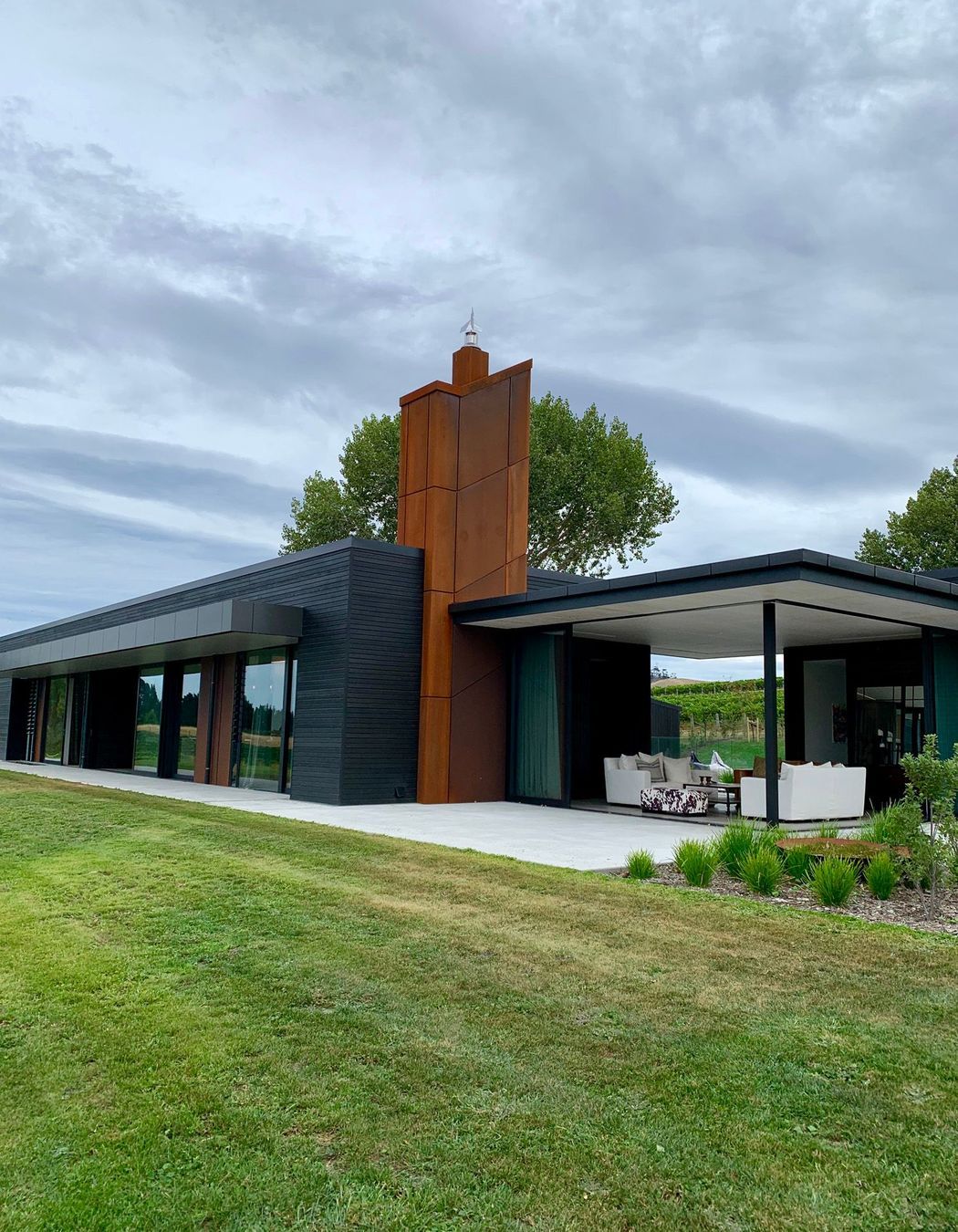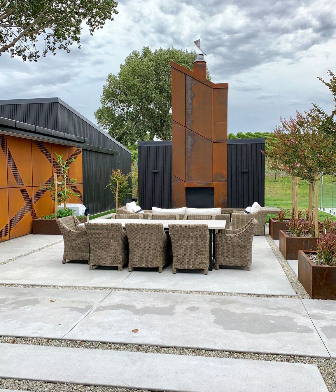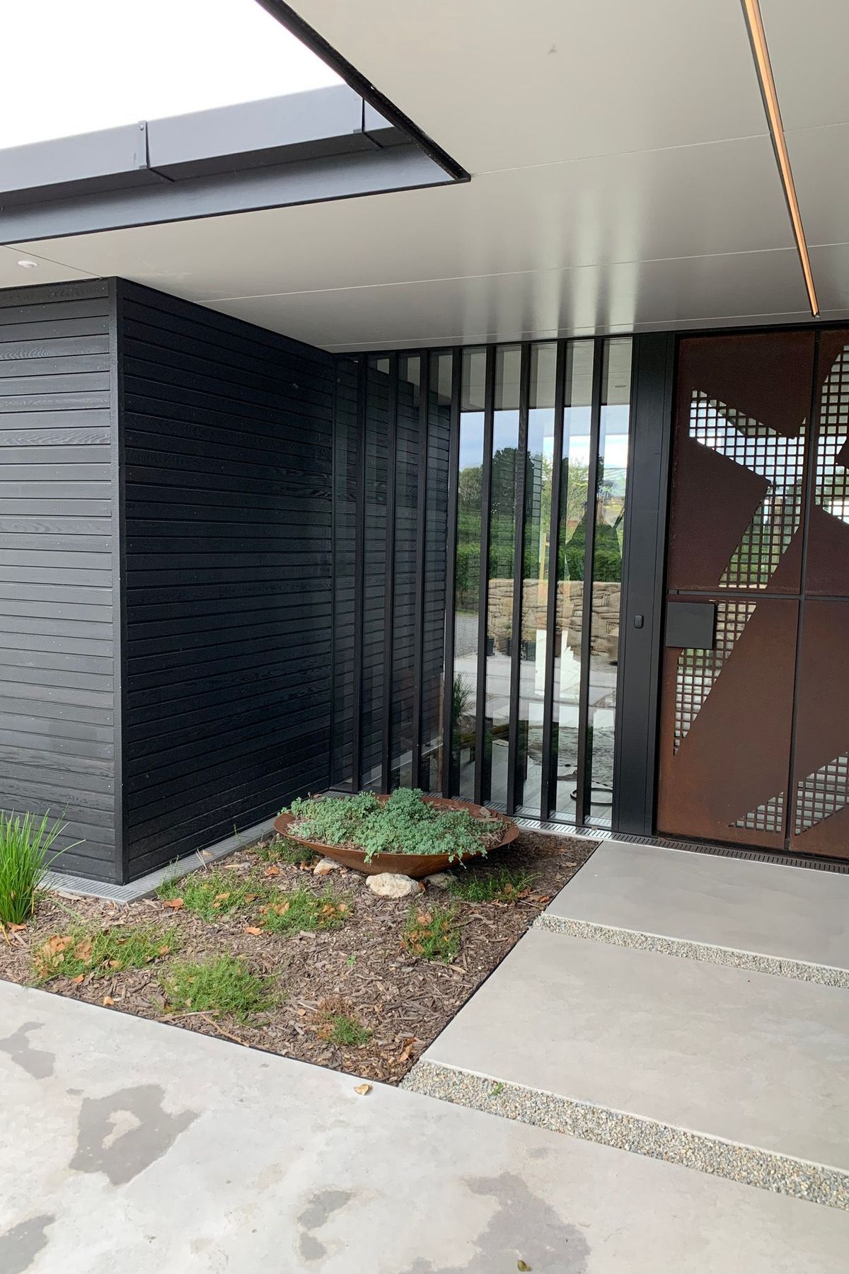 ArchiPro Project Summary - Award-winning modern home in rural Napier, featuring cedar and Corten steel cladding, four bedrooms, four bathrooms, and expansive views of the east coast and local vineyards, designed around a central courtyard for seamless indoor-outdoor living.