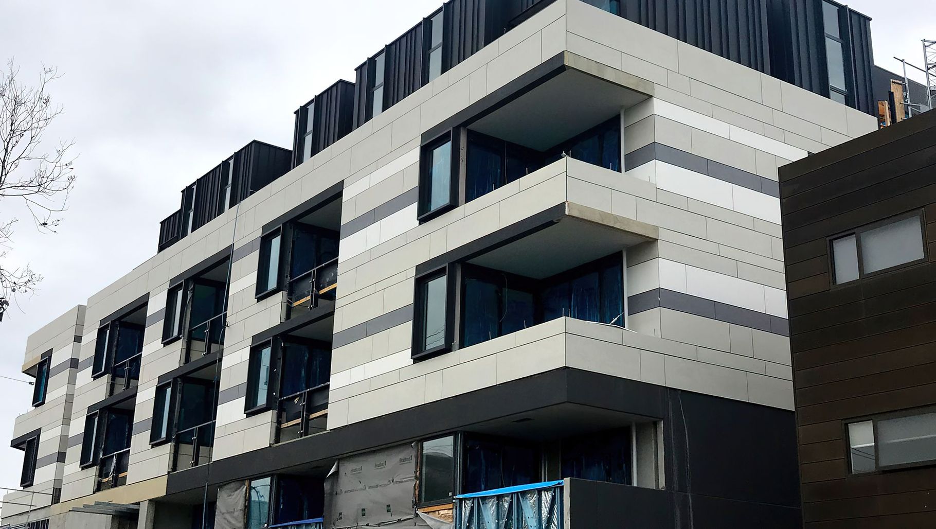ArchiPro Project Summary - Murrumbeena Medium Rise Residential featuring Cliptray 48 system in Colorbond Monument Matt, proudly installed by Archclad, nearing completion.