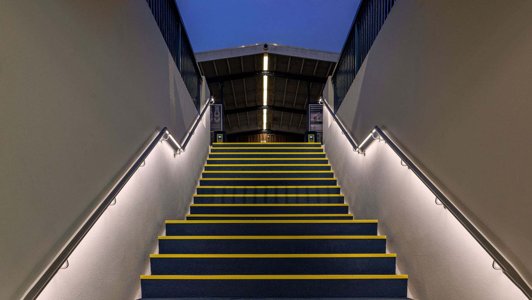 Offspring Profiles luminaires were specified for Naenae Train Station’s upgraded pedestrian subway, integrating culture and safety through illuminated handrails and backlit architectural features.