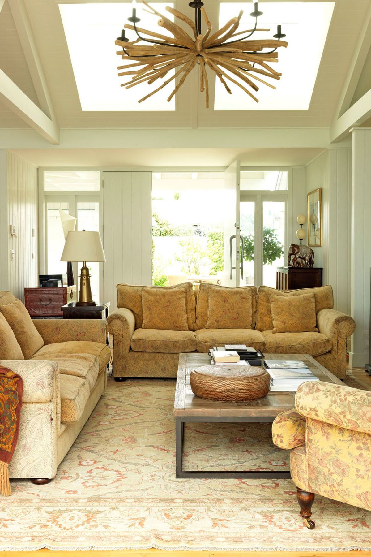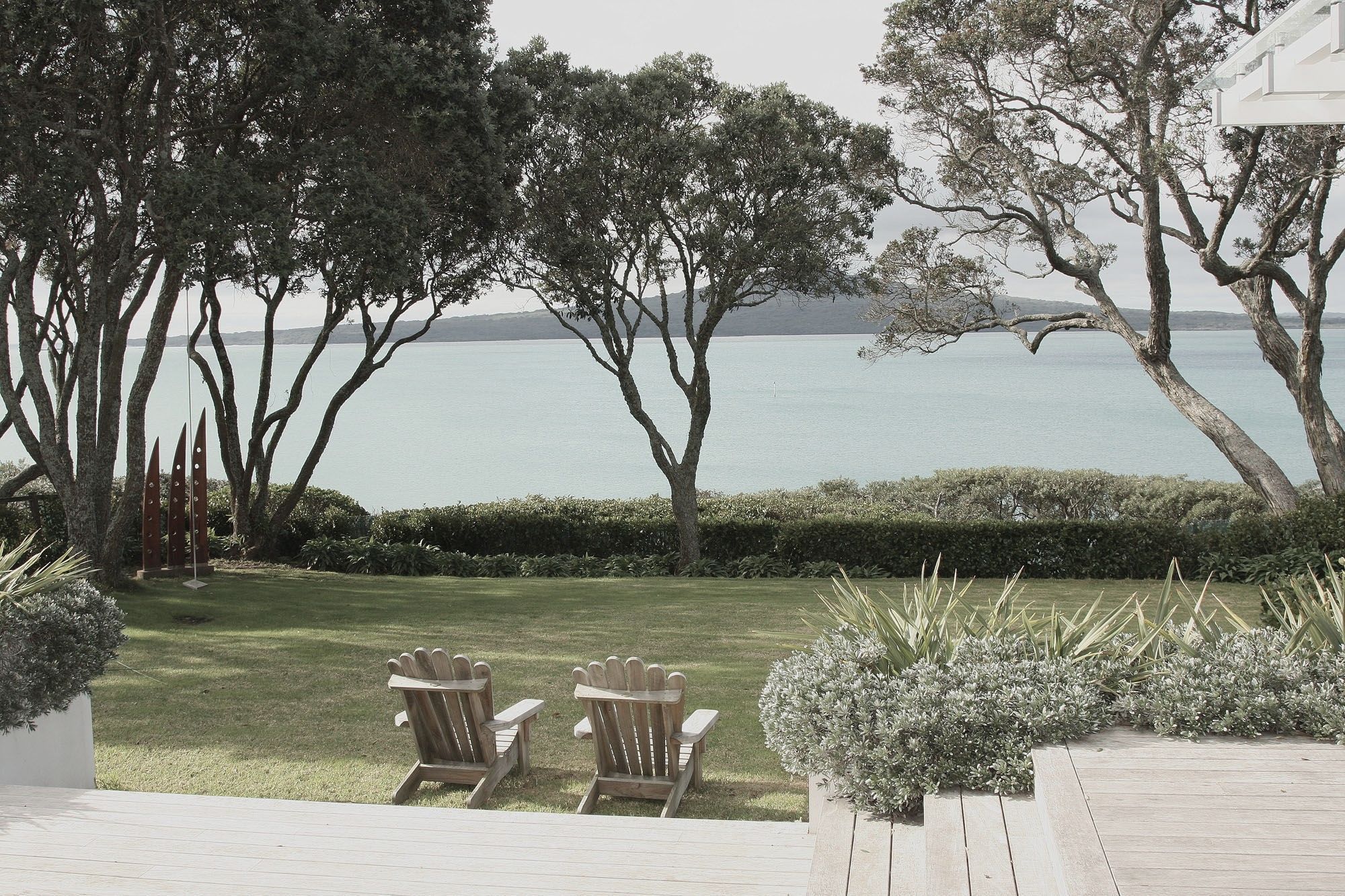 ArchiPro Project Summary - Clifftop home transformation featuring stunning views of Rangitoto Island, enhanced through strategic repositioning of existing furnishings and minimal sourcing of new items, including bespoke driftwood chandeliers.