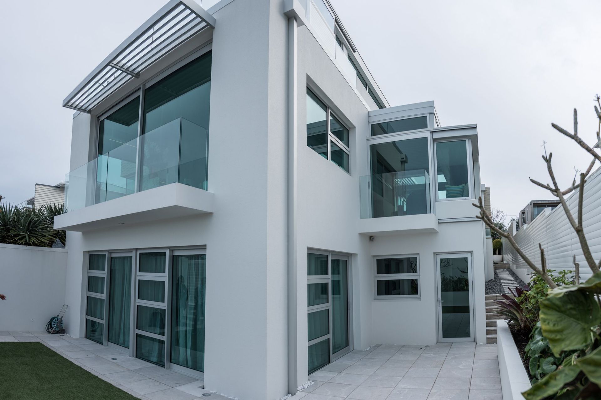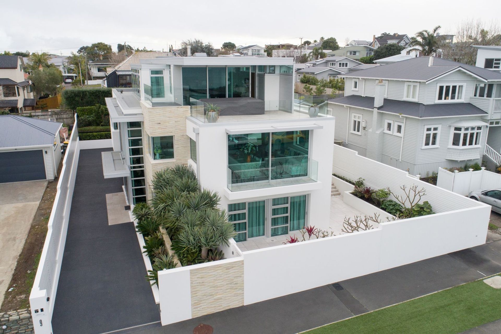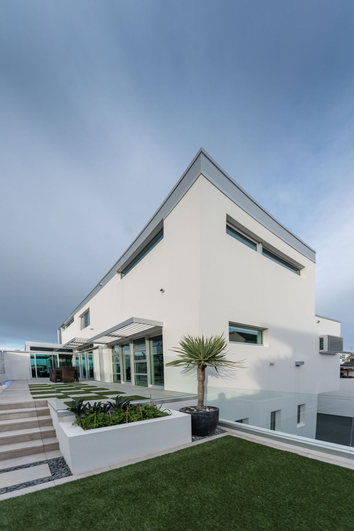 ArchiPro Project Summary - Modernist three-level residence featuring expansive sea views, flexible living spaces, and advanced technology for long-term comfort and accessibility, complemented by sculptured landscaping and all-weather outdoor entertainment areas.