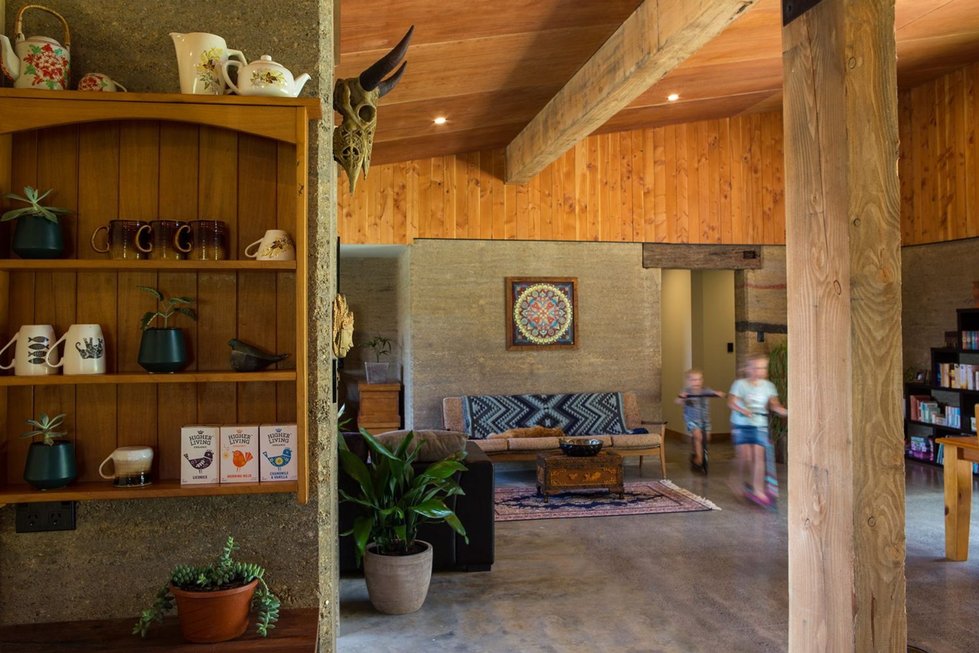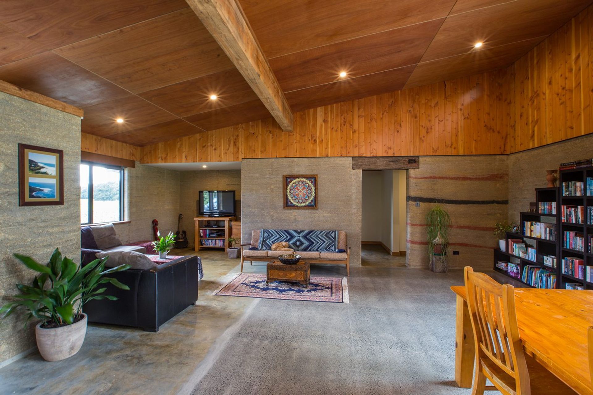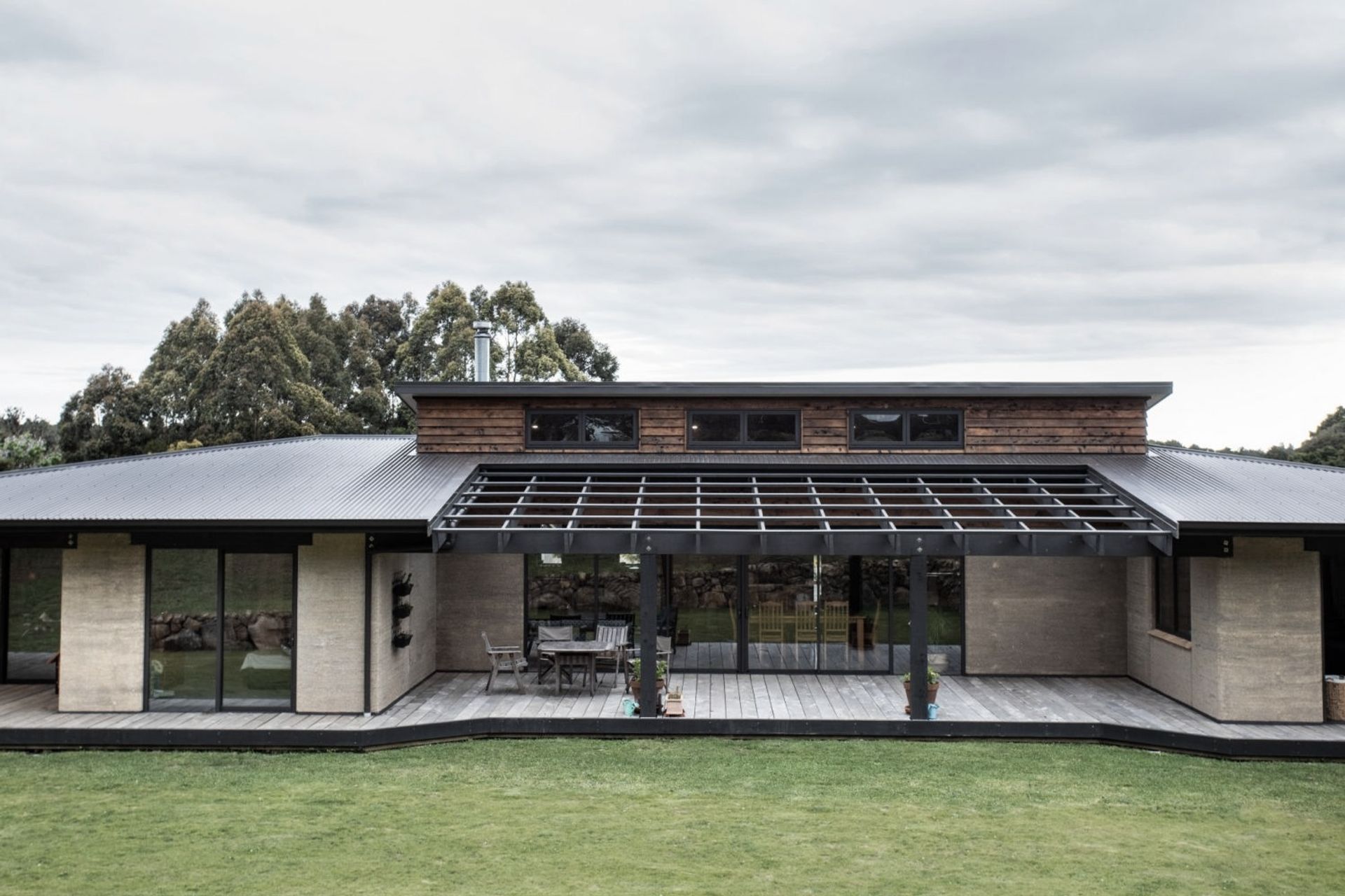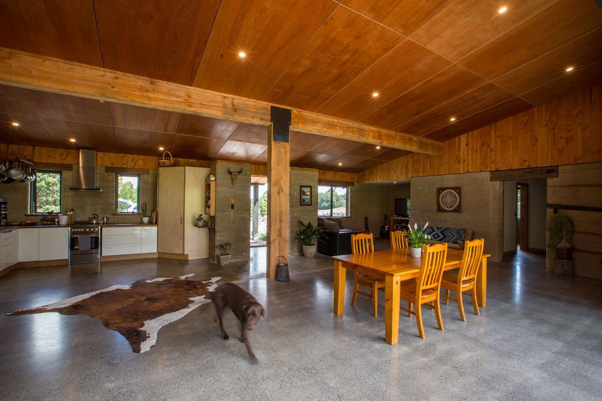 ArchiPro Project Summary - A sustainable rammed earth and timber home designed to harmonize with nature, featuring a spacious open-plan living area and energy-efficient thermal mass for year-round comfort.