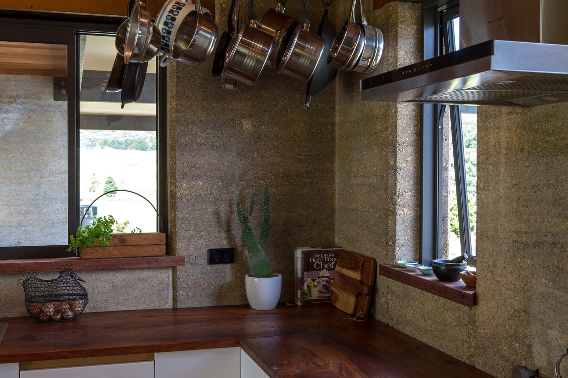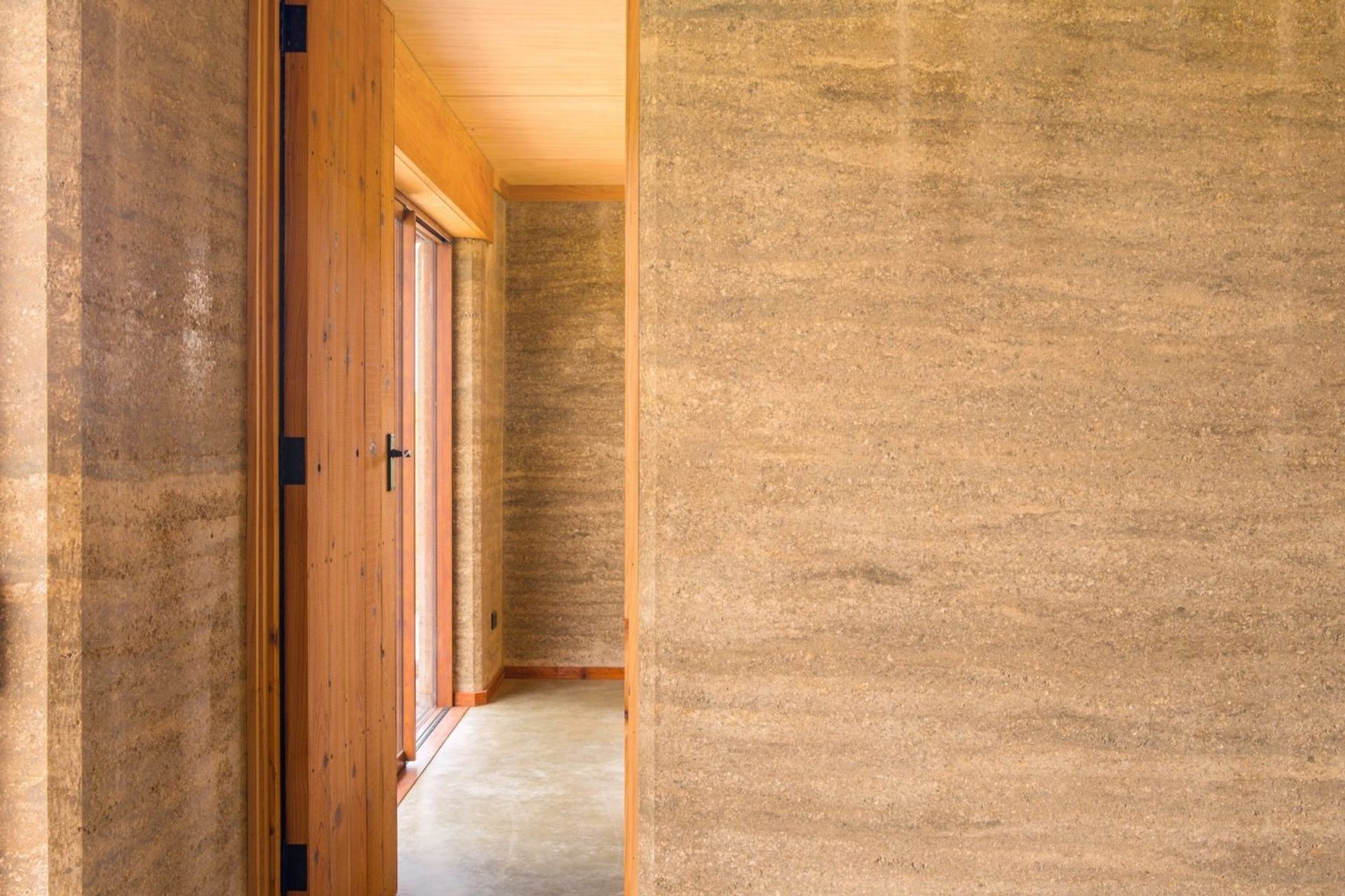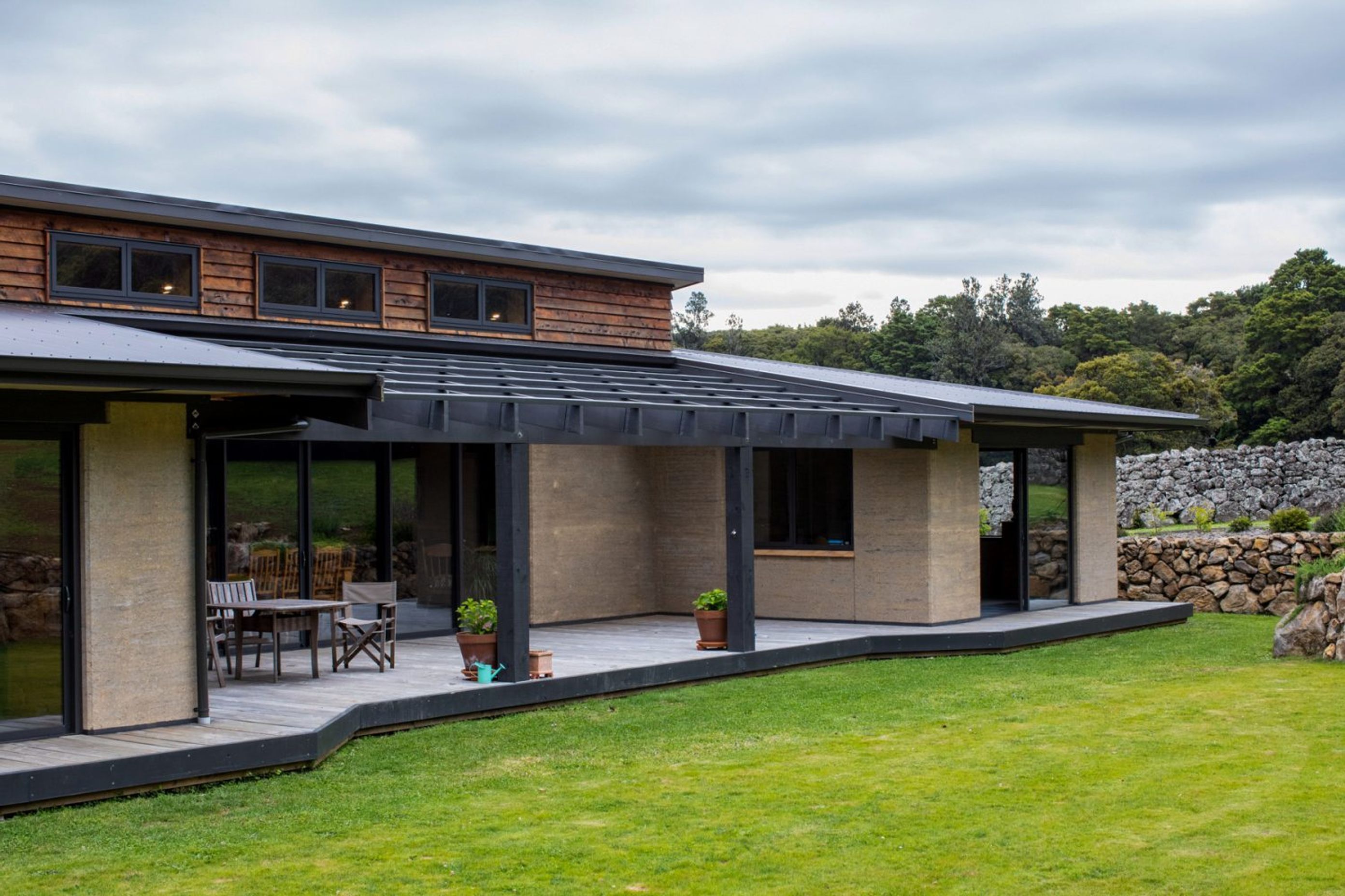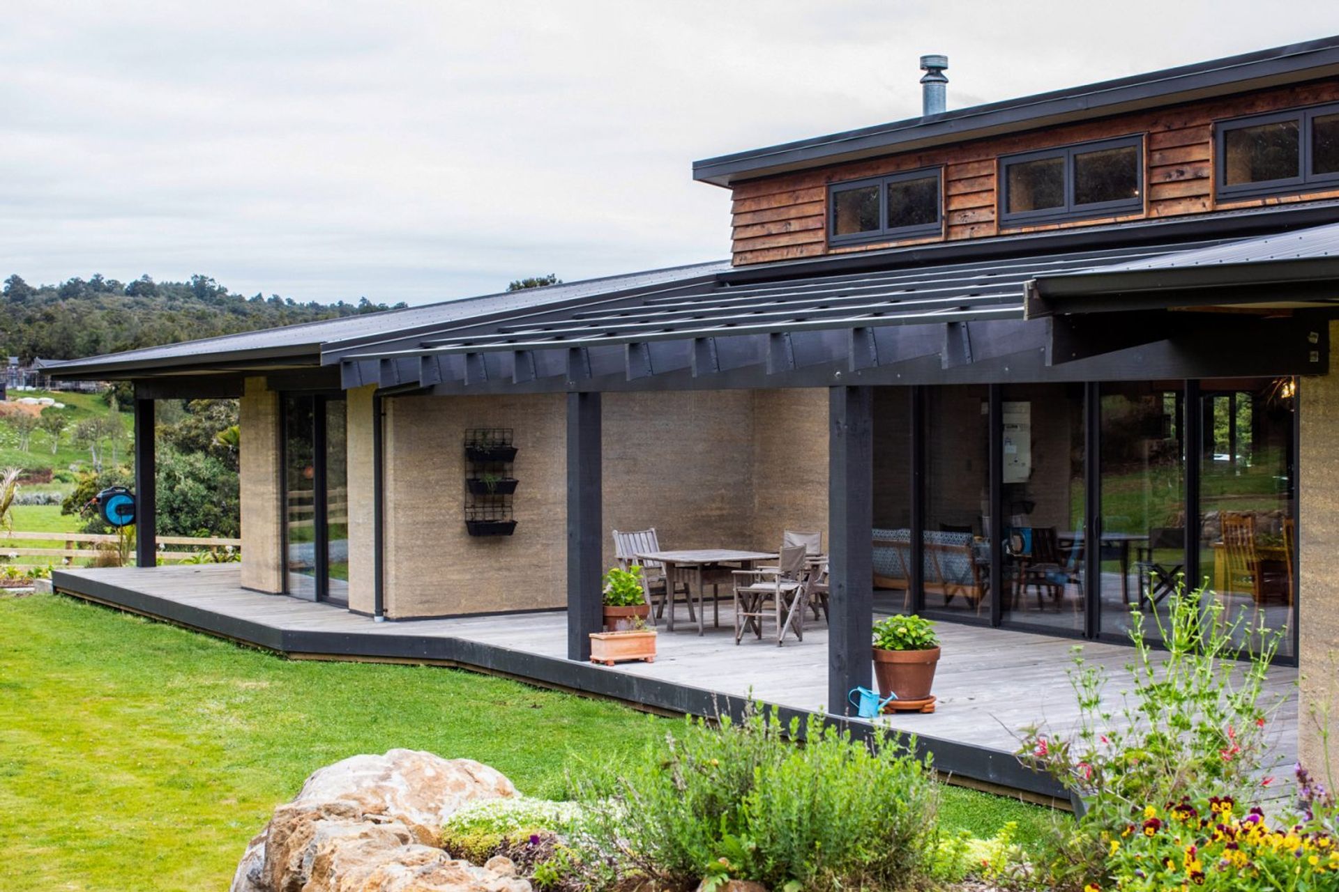 ArchiPro Project Summary - A sustainable rammed earth and timber home designed to harmonize with nature, featuring a spacious open-plan living area and energy-efficient thermal mass for year-round comfort.