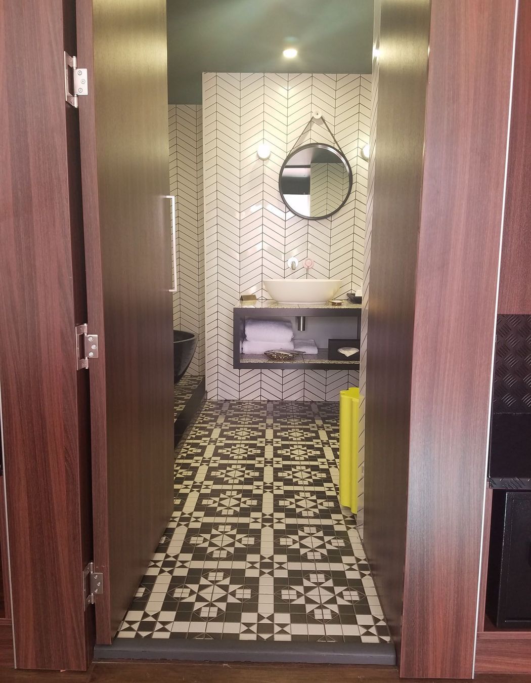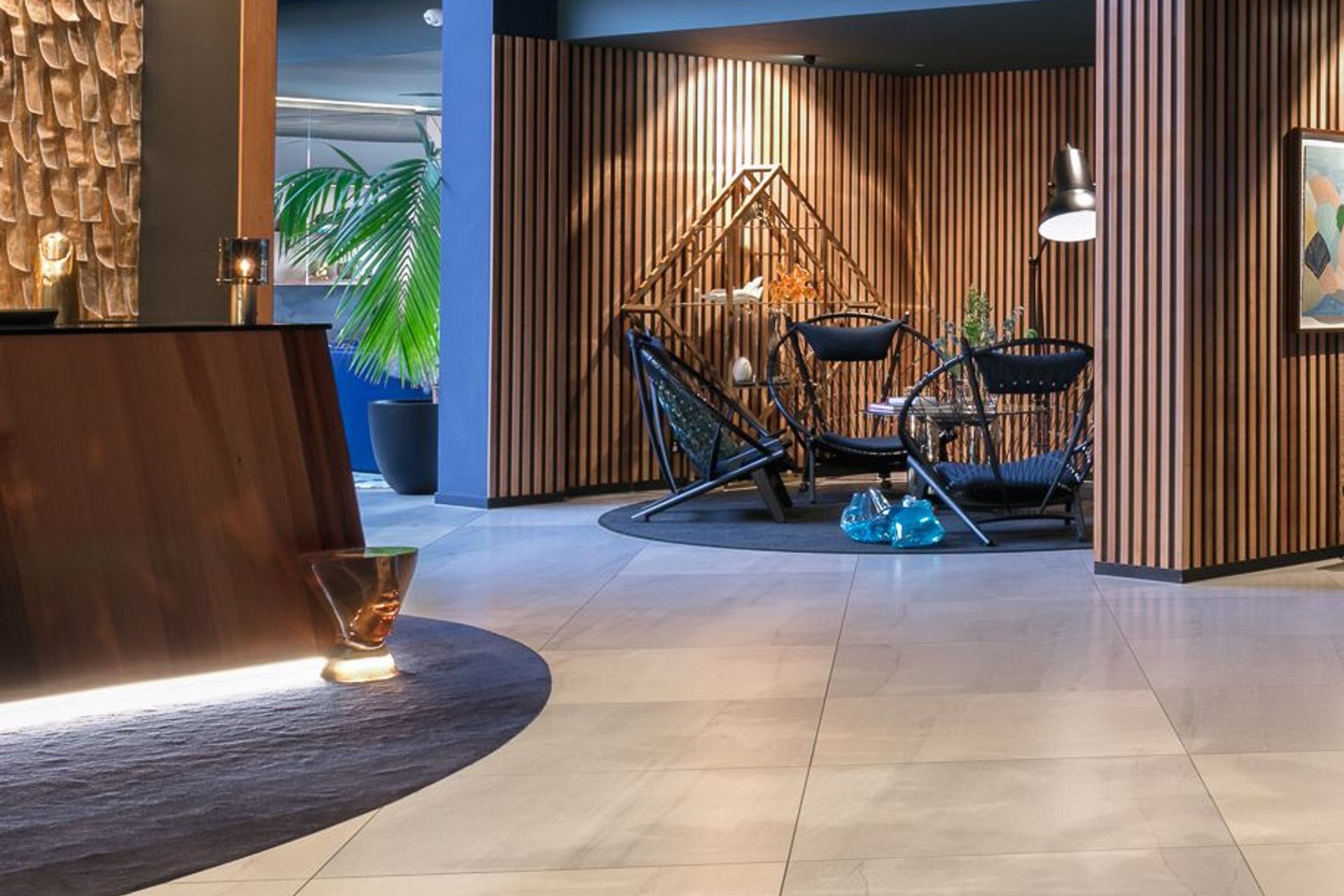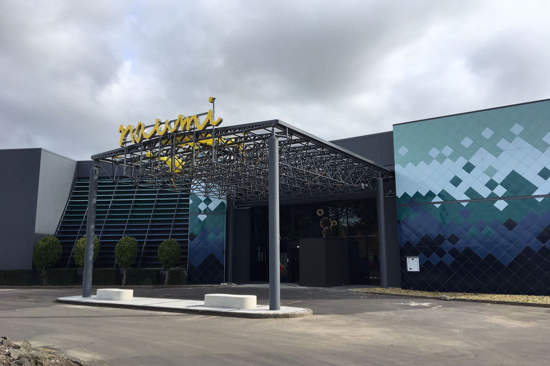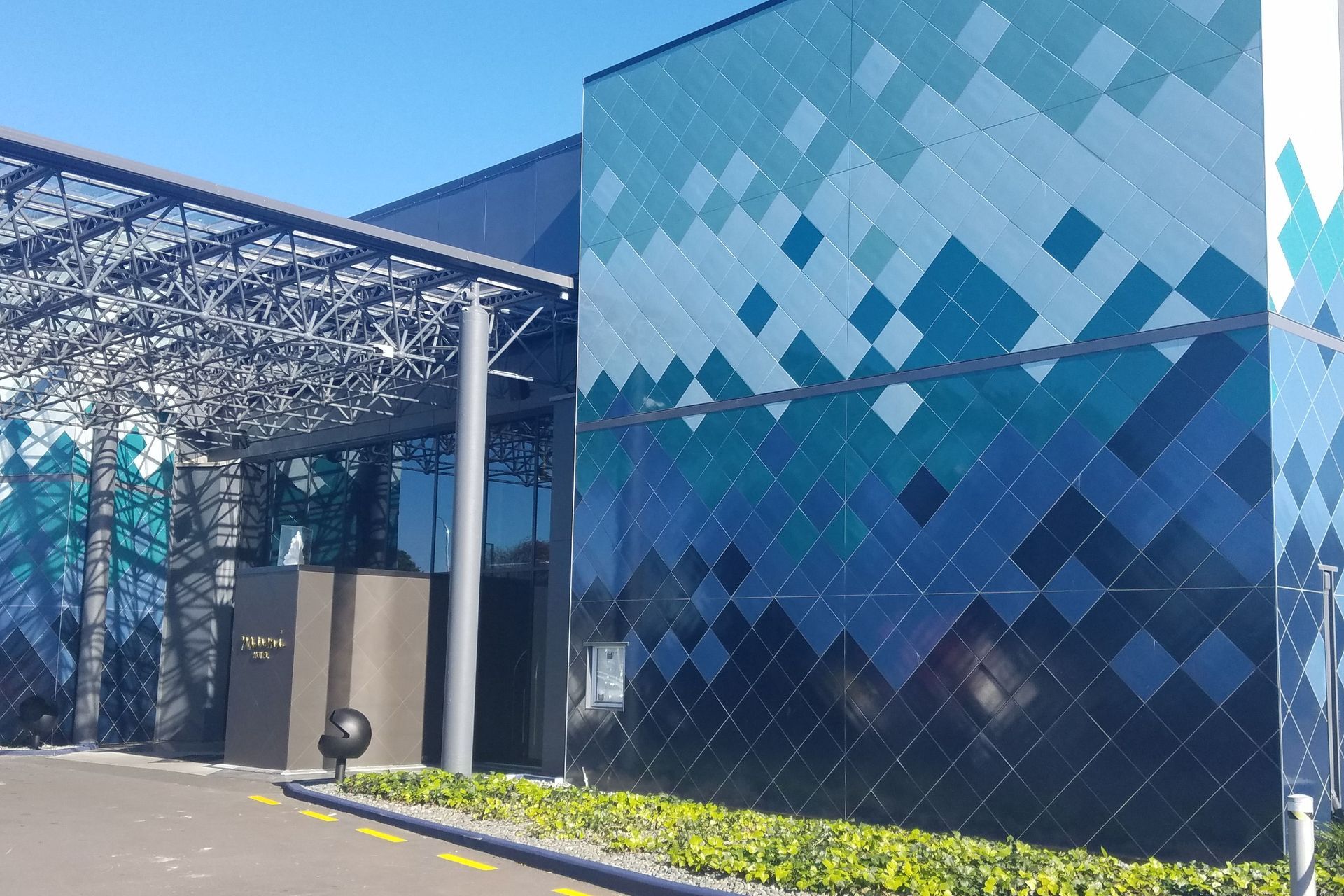 ArchiPro Project Summary - Naumi Hotel at Auckland Airport showcases boutique hospitality with art-inspired design, featuring custom tiles supplied by Tile Warehouse for the pool, bathrooms, and foyer, along with bespoke exterior tiles in Resene colorways.