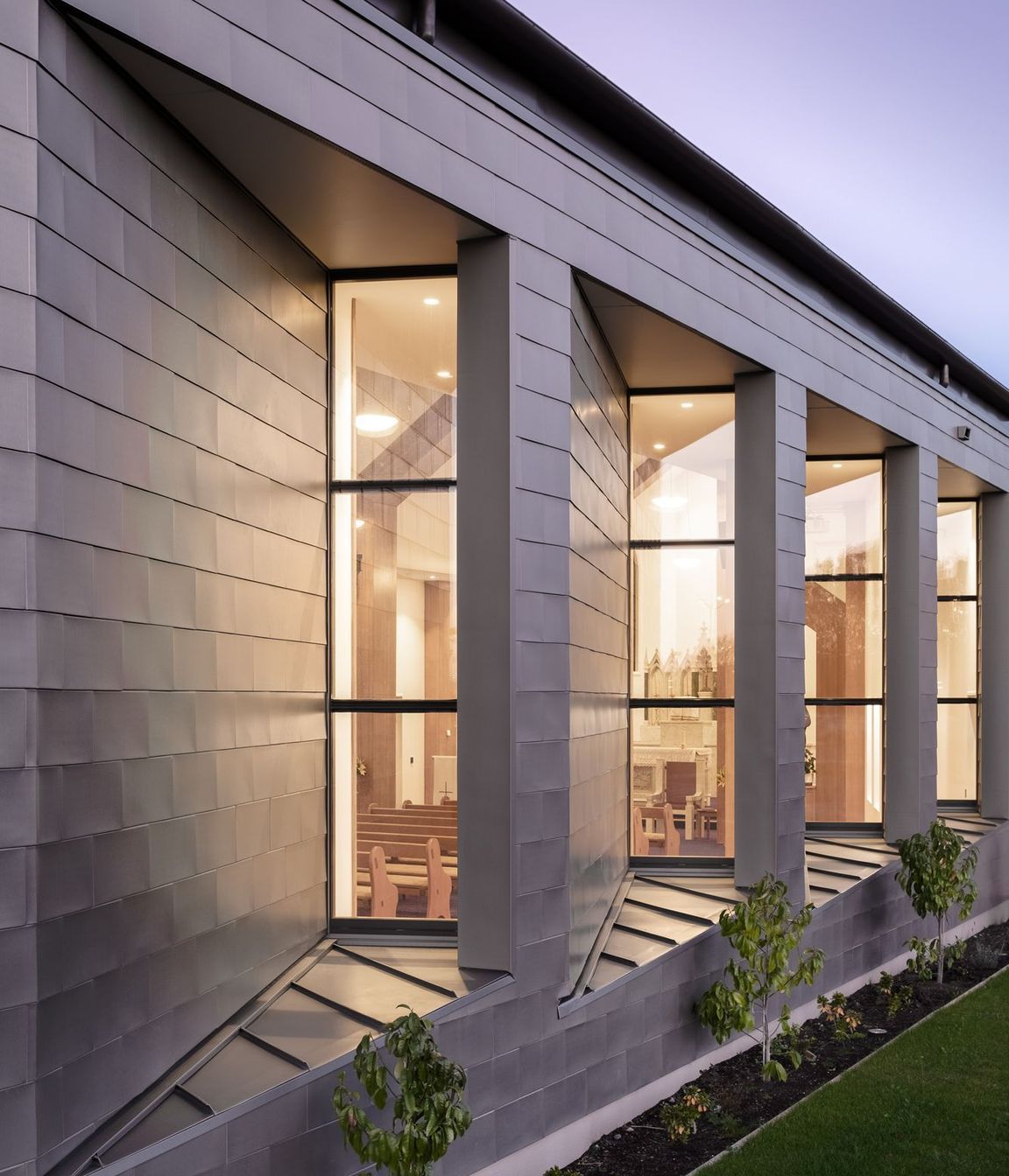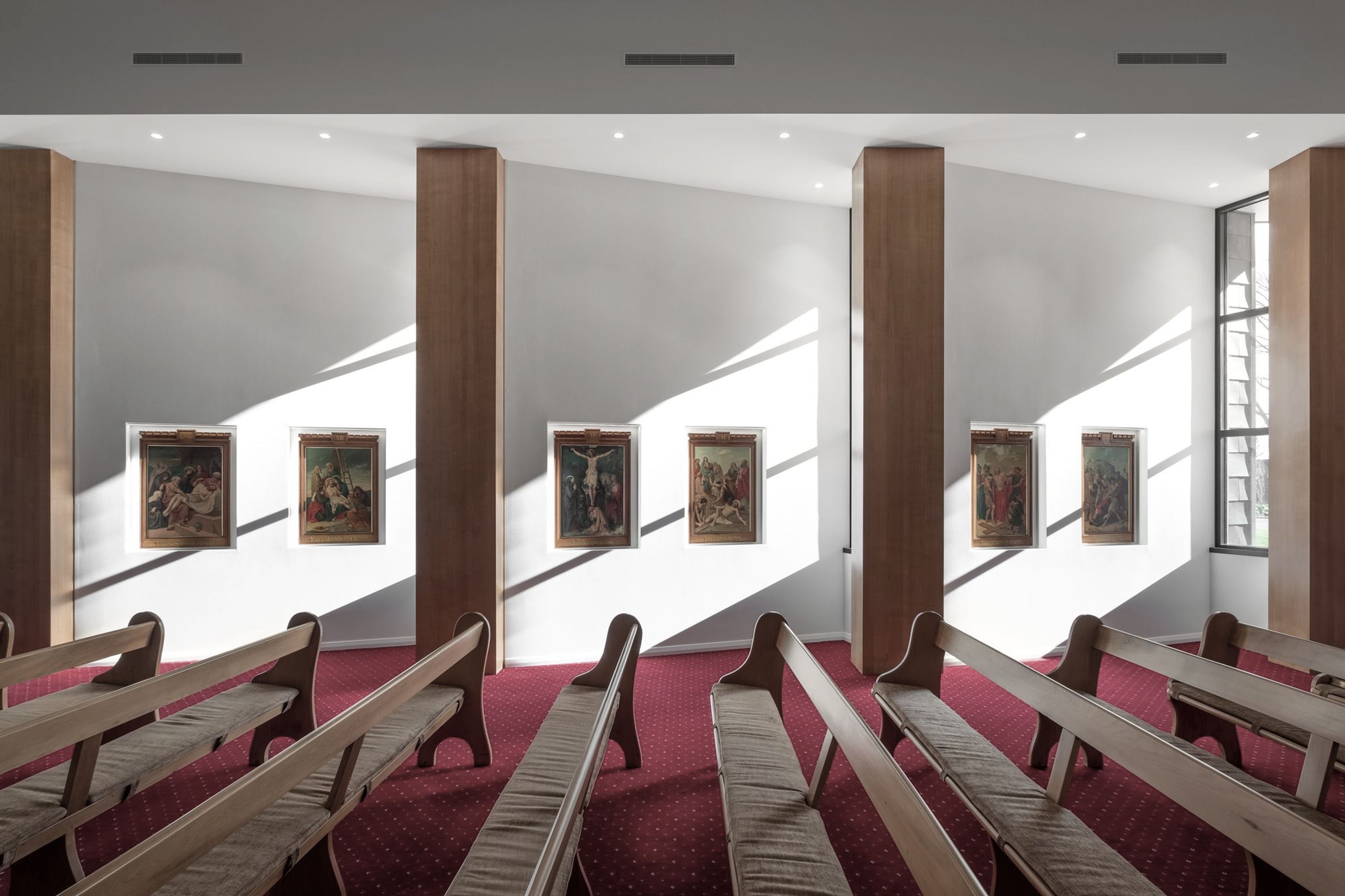 ArchiPro Project Summary - A harmonious blend of heritage and modernity, the Nazareth House Chapel serves as a serene space for worship within a contemporary aged care facility, thoughtfully incorporating salvaged elements from the original chapel to honor its architectural legacy.