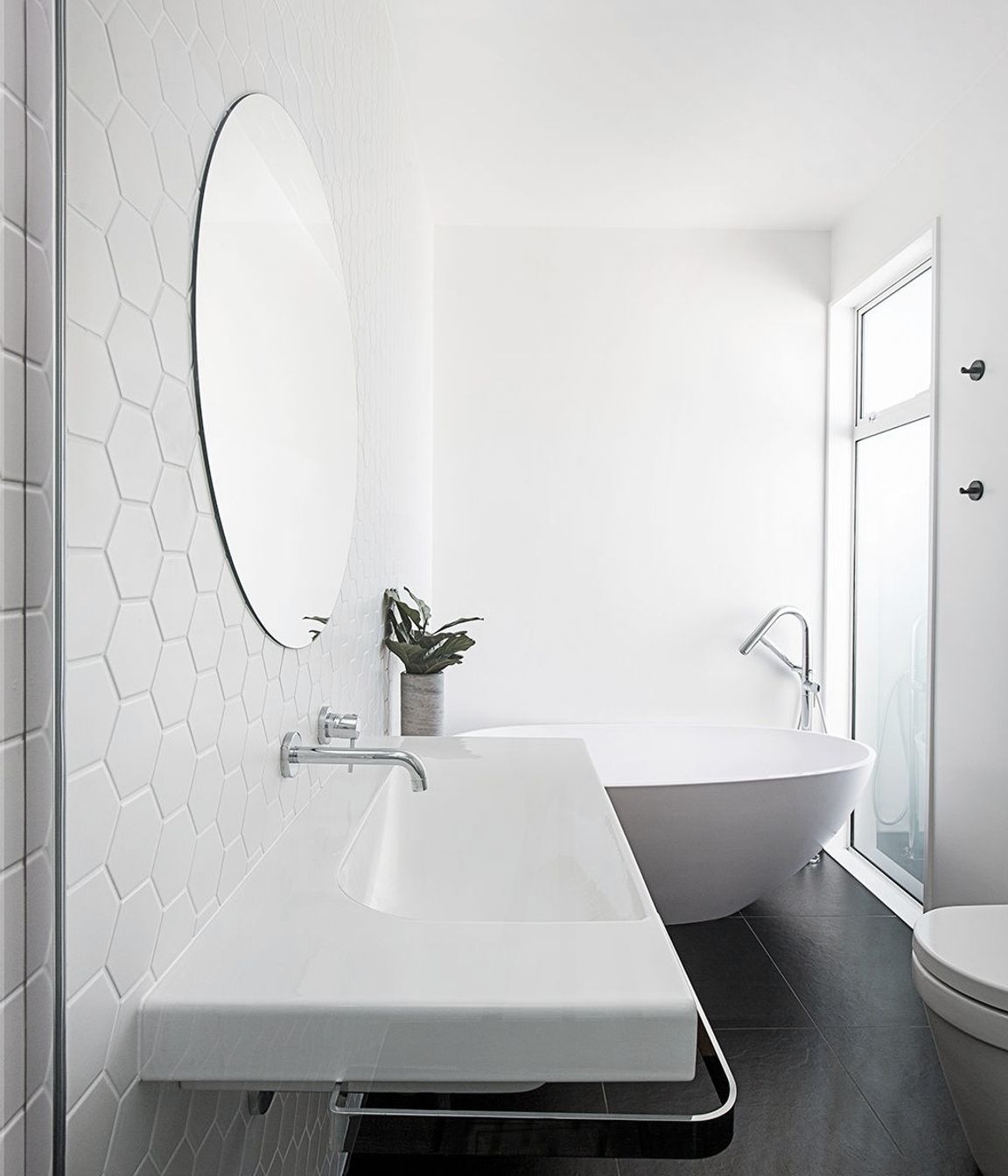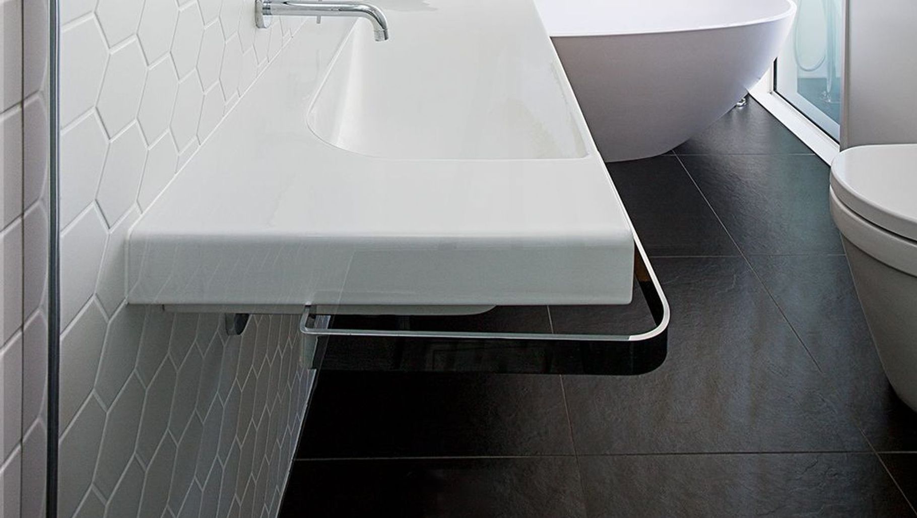 ArchiPro Project Summary - A modern bathroom featuring grey tiles, elegant plumbing fixtures, and a spacious bathtub for a serene retreat.