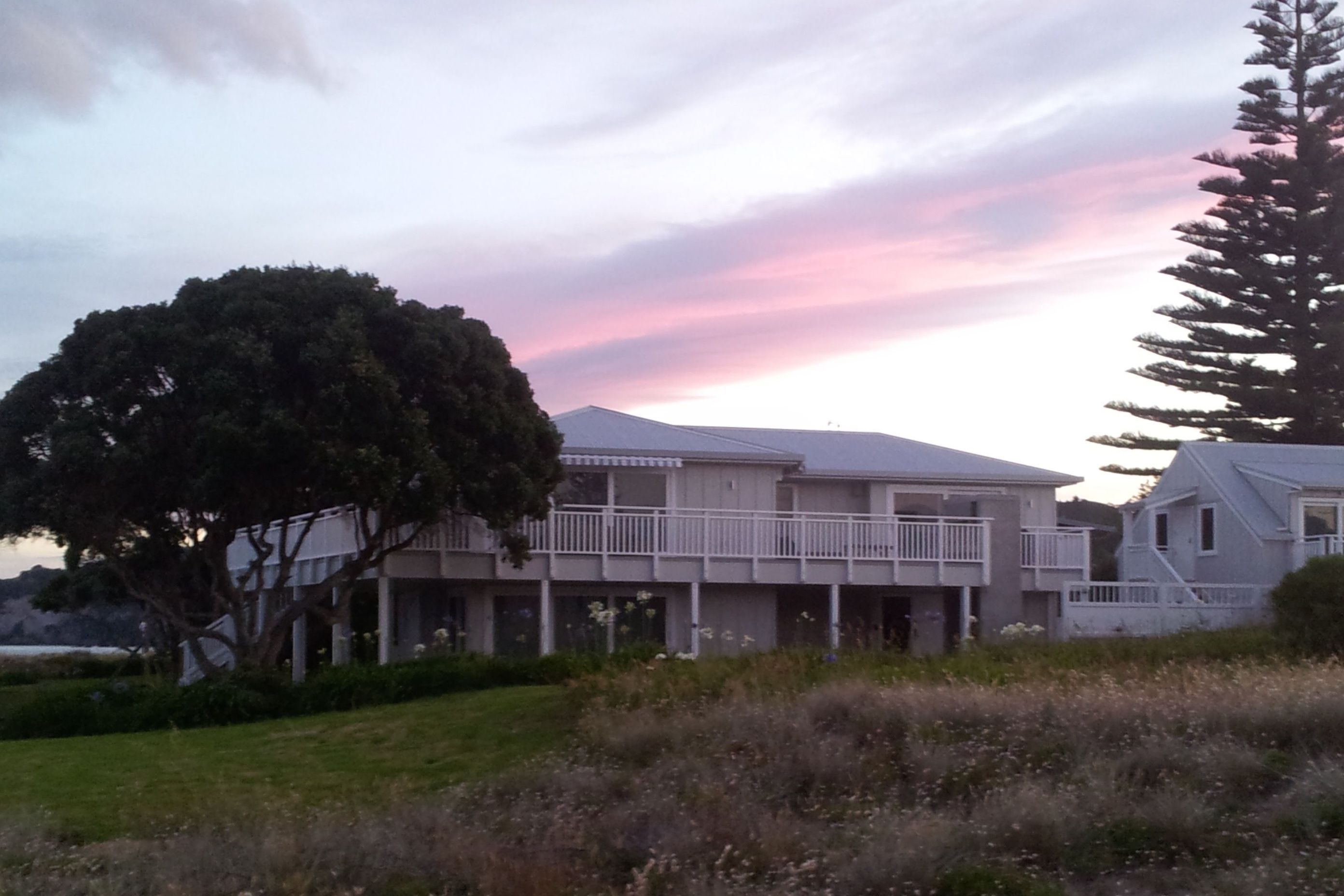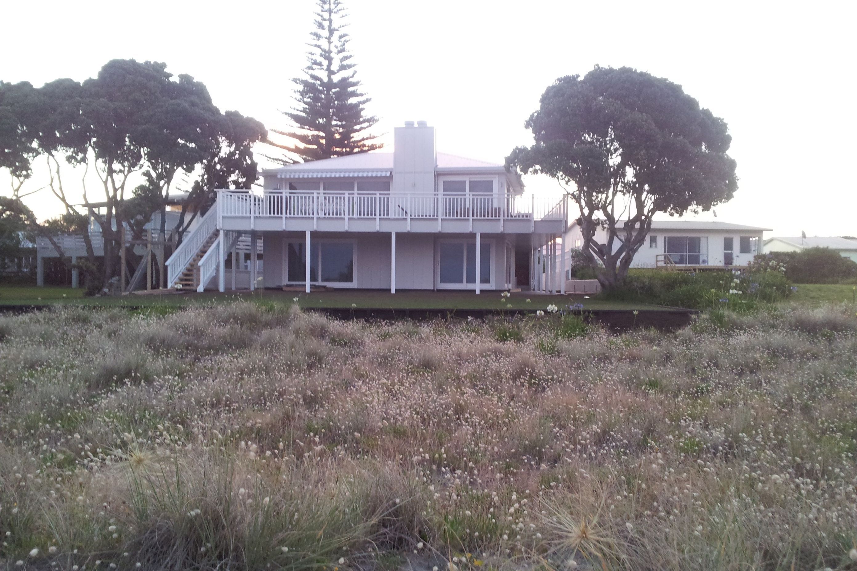 ArchiPro Project Summary - A beachside bach featuring open oak trusses, polished concrete floors, and a striking two-storey precast concrete fireplace, complemented by a wraparound deck in Cape Cod style.