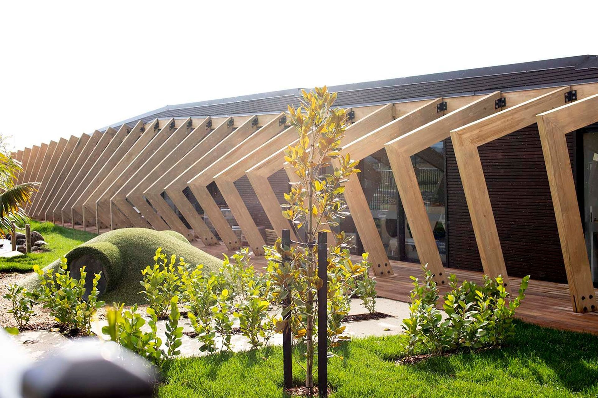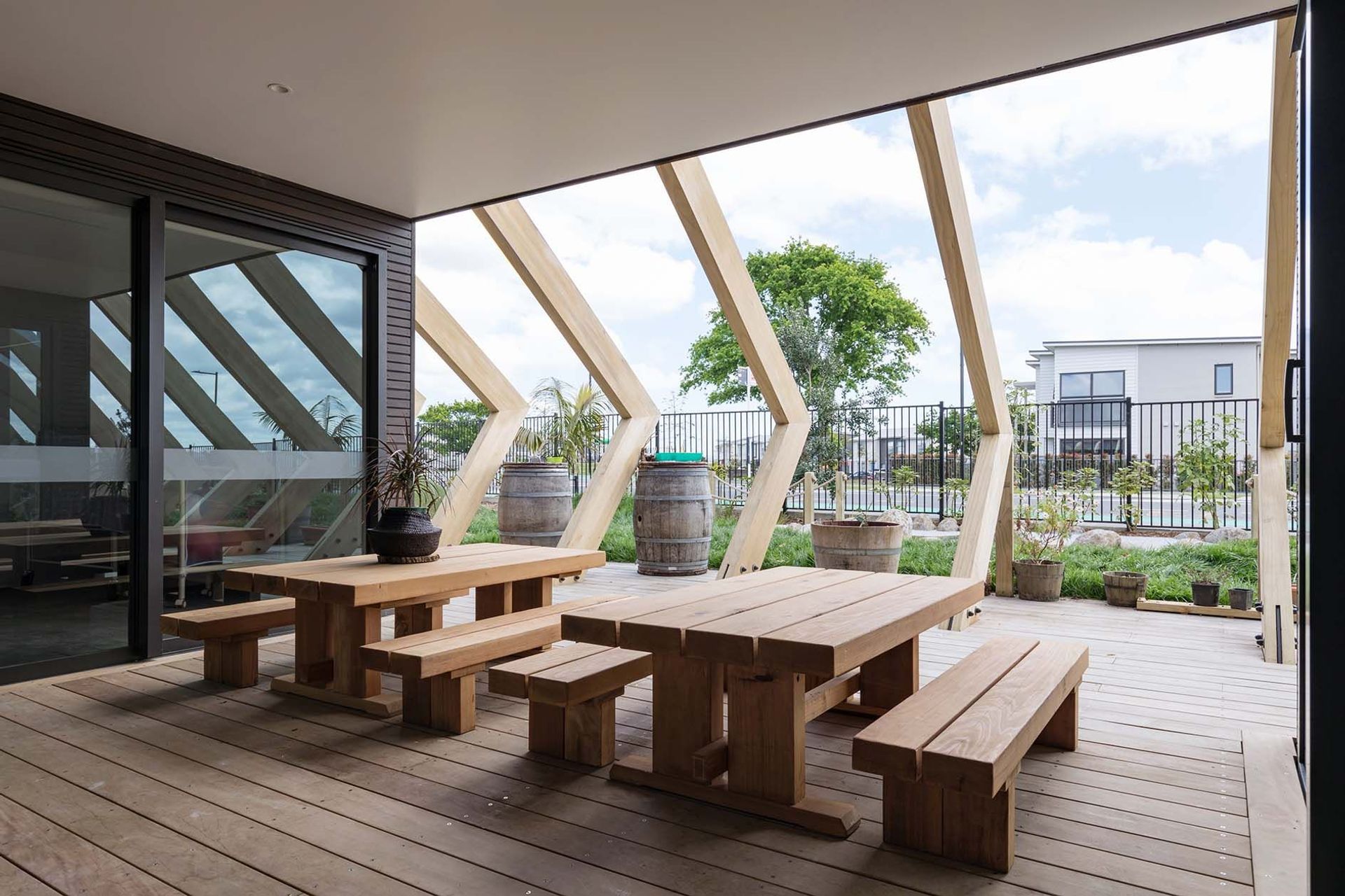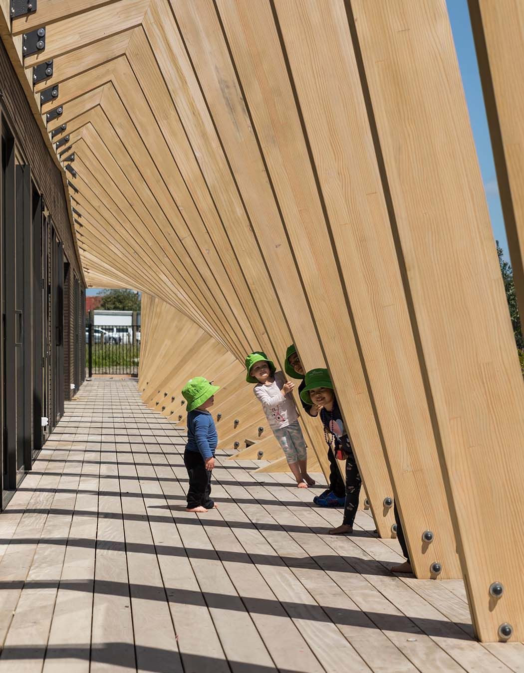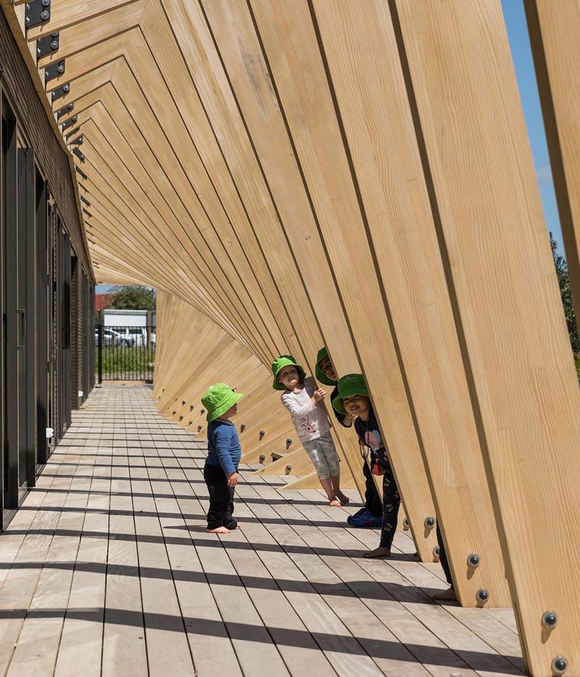 ArchiPro Project Summary - New Shoots Children's Centre in Whenuapai, completed in 2018, features a sustainable design that promotes healthy development and creativity in children, with a focus on natural materials, ample daylight, and interactive outdoor spaces.