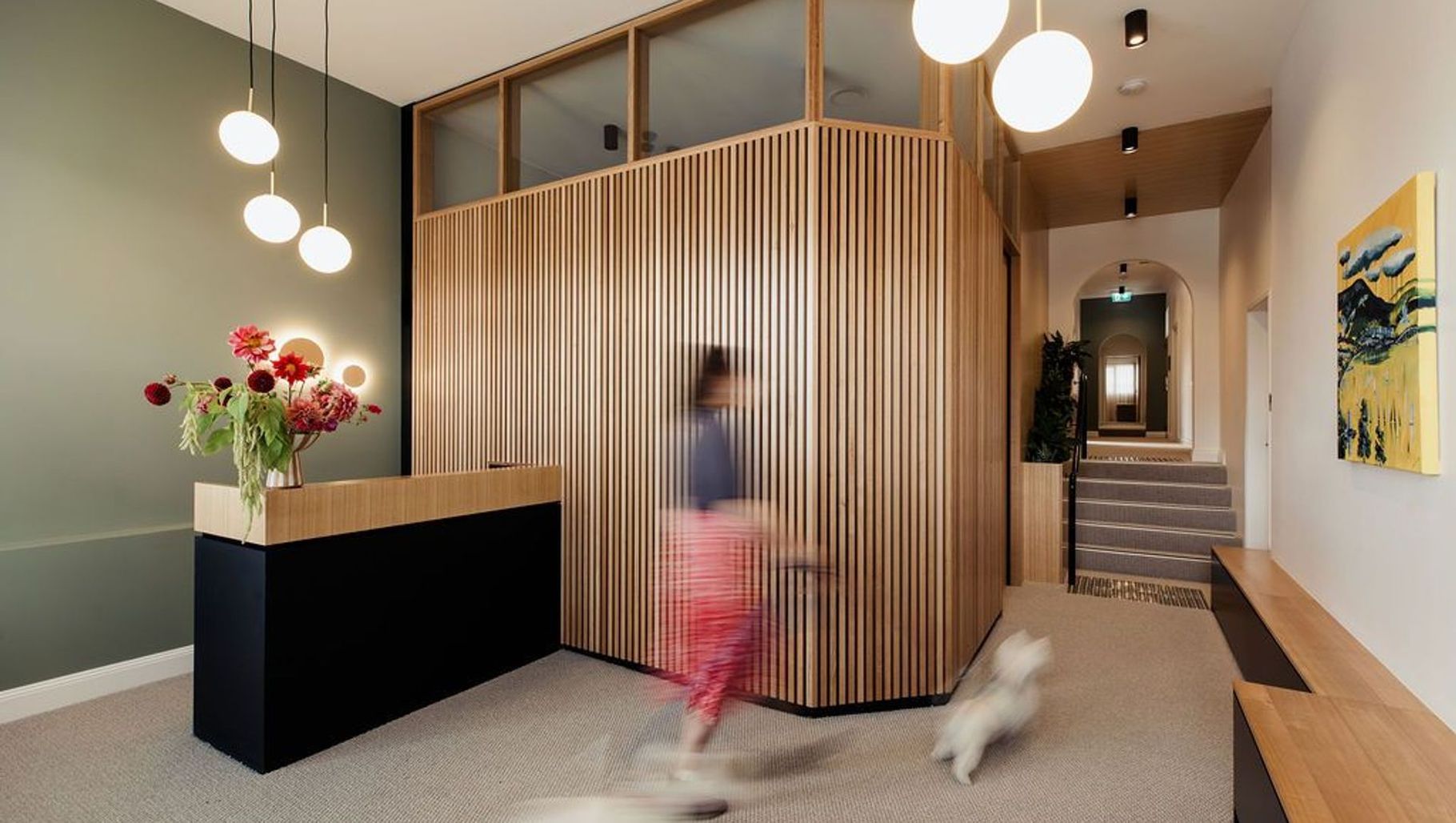 ArchiPro Project Summary - A tranquil psychologist’s office in a heritage-listed building, featuring natural light, soothing materials, and a warm timber aesthetic that fosters wellbeing and comfort for both clients and practitioners.